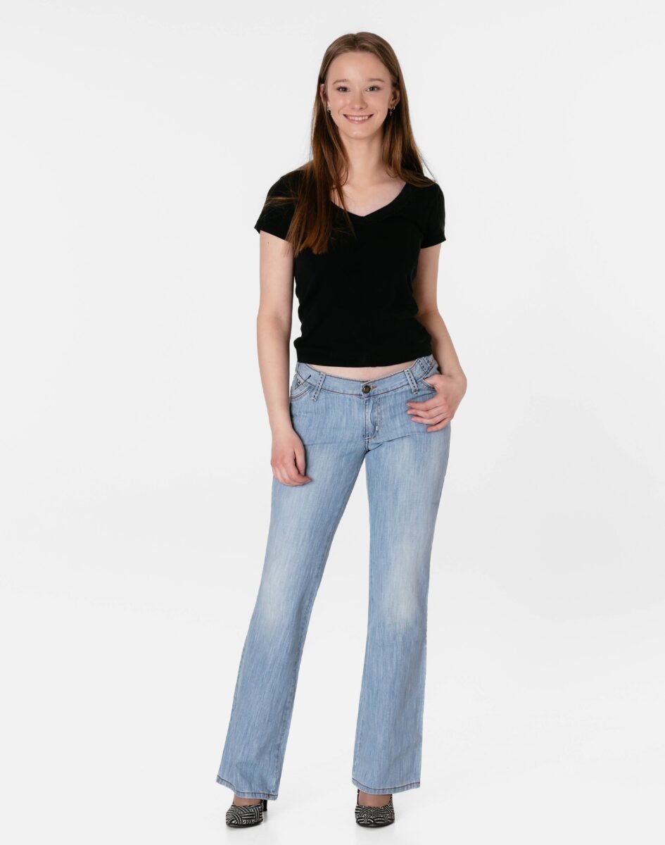 - Nogawka: wąska, dopasowana w udach i kolanach z rozszerzającym się dołem nogawek