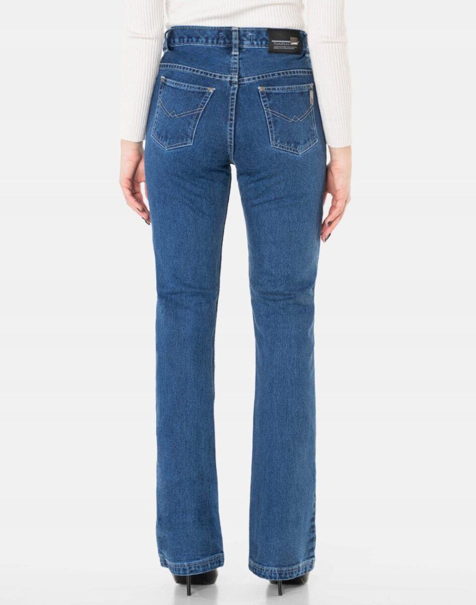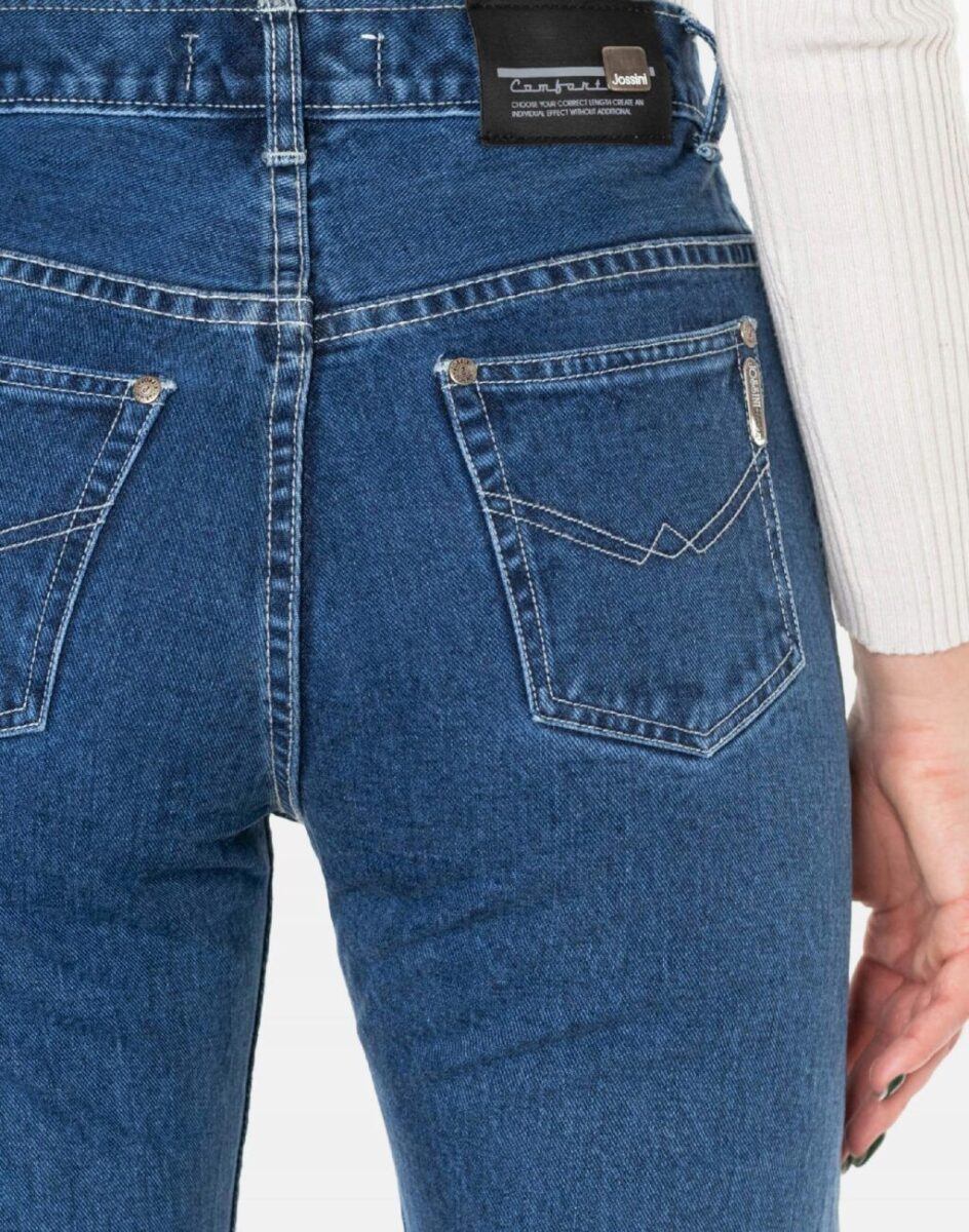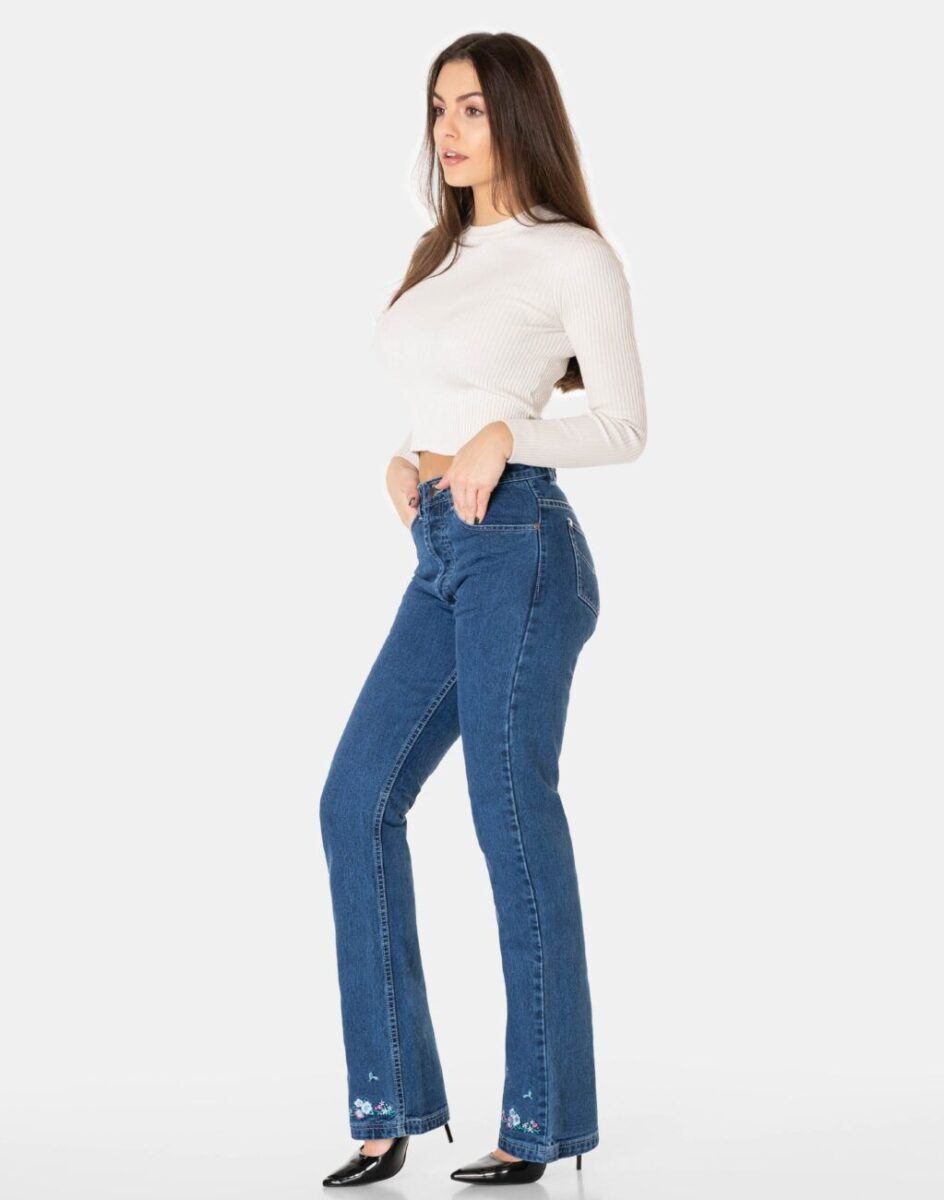 Spodnie firmy JOSSINI JEANS COMPANY model 10013 to powracające do łask jeansy damskie typu „dzwony” w kolorze niebieskim „Light Blue”, o charakterystycznych dla tego modelu rozszerzających się dołem nogawkach i wyższym stanie „High Rise”. Zapinane są na kryte metalowe guziczki sygnowane logiem firmy. Z przodu mają dwie kieszonki zaokrąglone oraz mniejszą kieszonkę tzw. bilonówkę, a na tyle mniejsze, przesunięte ku górze kieszenie wspaniale modelujące pośladki. W pasie szlufki umożliwiające stylizacje z paskiem. Stan podwyższony „High Rise” zgrabnie modelujący sylwetkę w talii. Najbardziej podatne na uszkodzenia miejsca wzmocnione są dodatkowymi przeszyciami i metalowymi nitami. Oferowane przez nas spodnie uszyte są z wysokiej jakości tkaniny jeansowej w kolorze niebieskim „Blue Denim” z kwiatowymi haftami na dołach nogawek w hippisowskim stylu które wyrażają buntowniczy i kolorowy styl życia „dzieci kwiatów” jak ich potocznie nazywano.