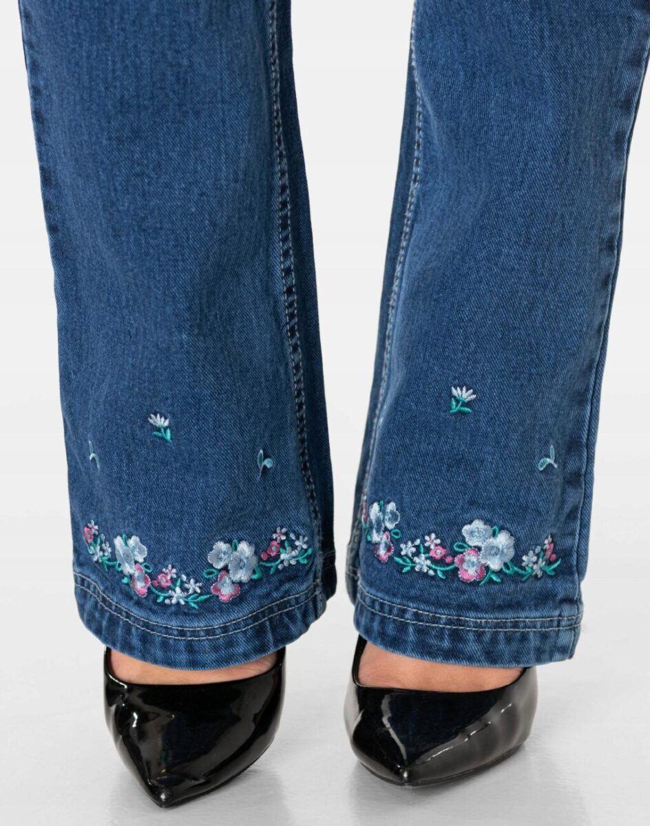 - Nogawka: wąska, dopasowana w udach i kolanach z rozszerzającym się dołem nogawek i ozdobnymi haftowanymi kwiatkami na dole nogawki