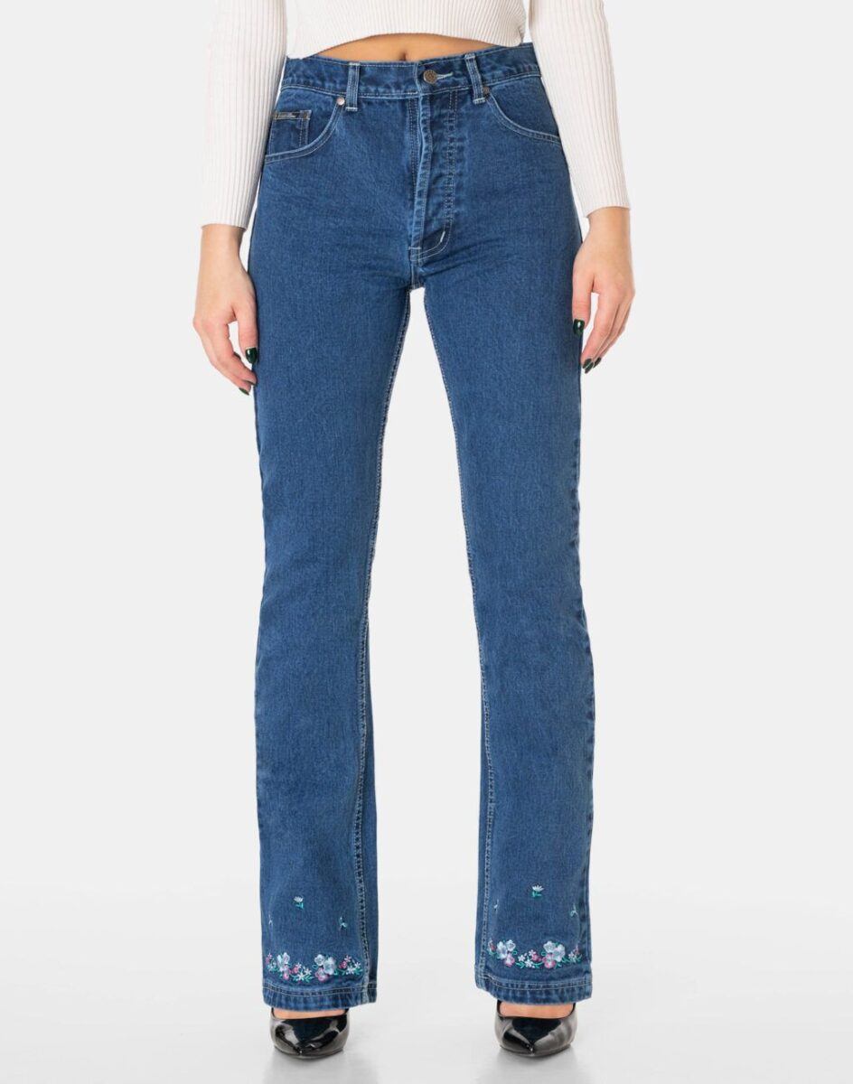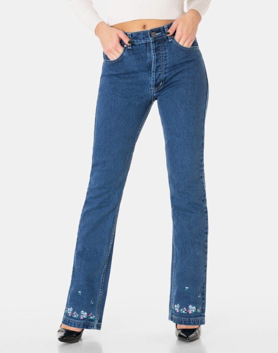 - Nogawka: wąska, dopasowana w udach i kolanach z rozszerzającym się dołem nogawek i ozdobnymi haftowanymi kwiatkami na dole nogawki