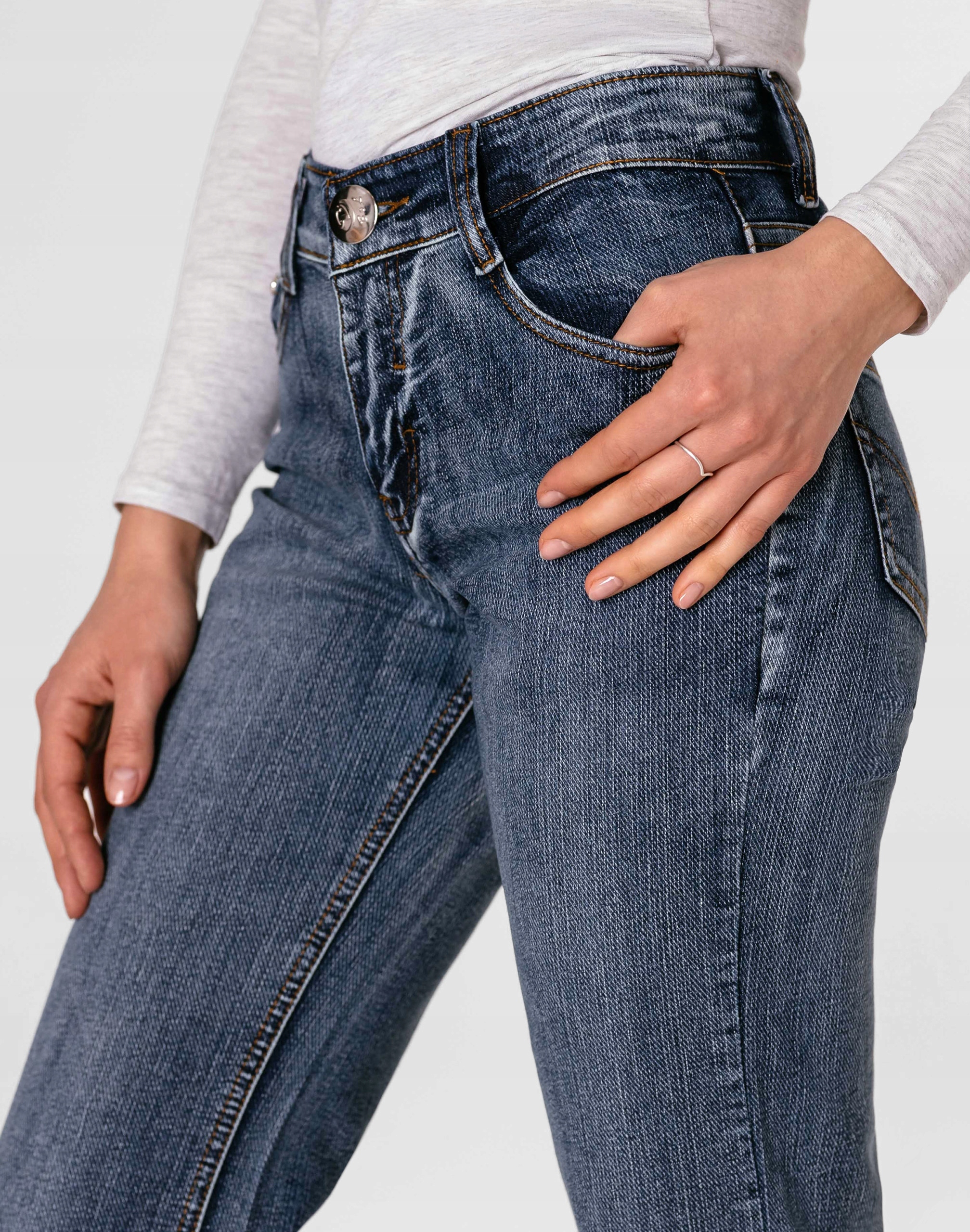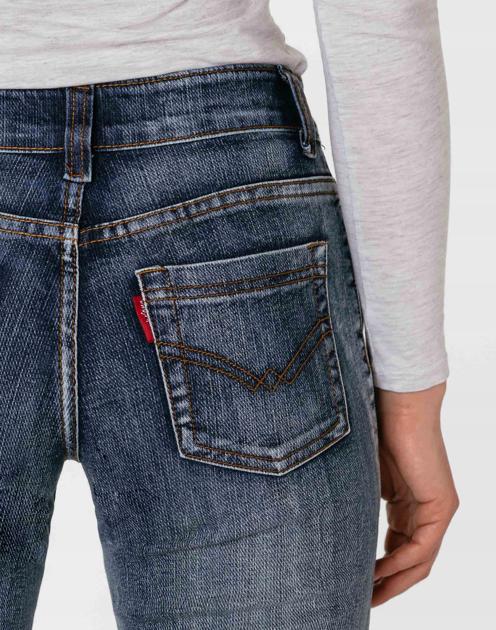 - Wzór: ozdobnie sprany Denim Jeans z fabrycznym efektem spranego jeansu "used-look"– rozjaśnieniami iprzetarciami