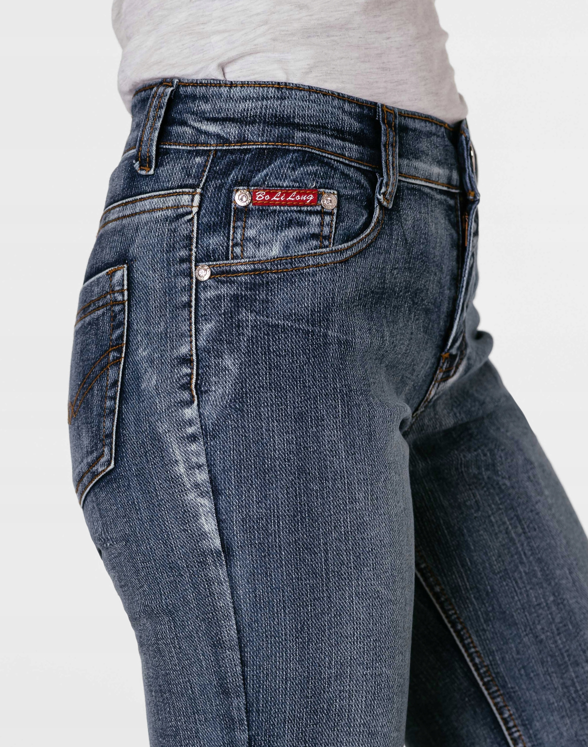 - Dwie wpuszczane kieszenie z przodu + bilonówka, dwie naszywane kieszenie z tyłu