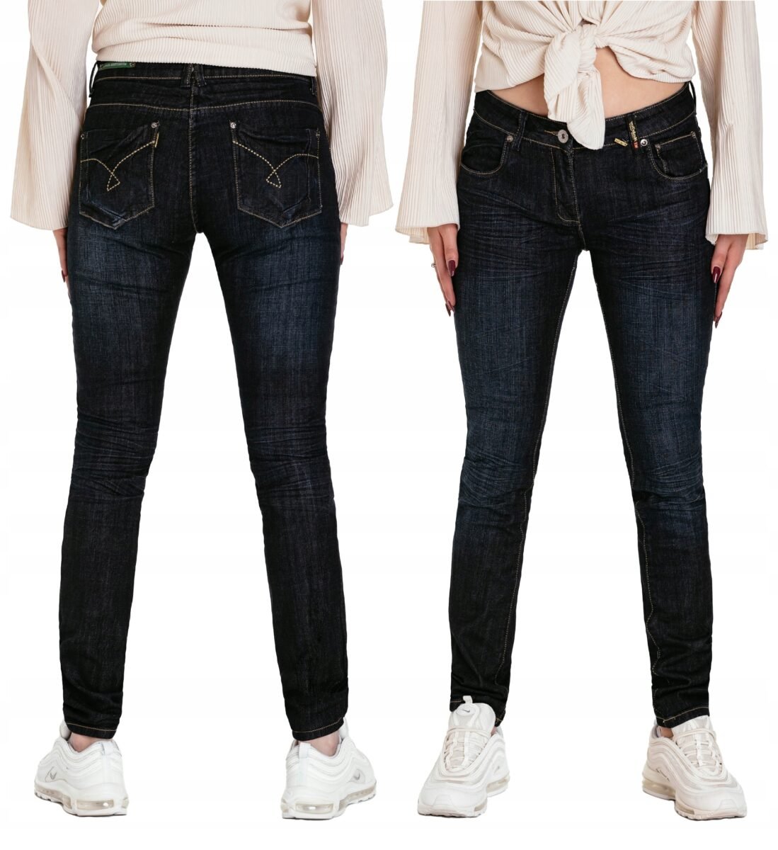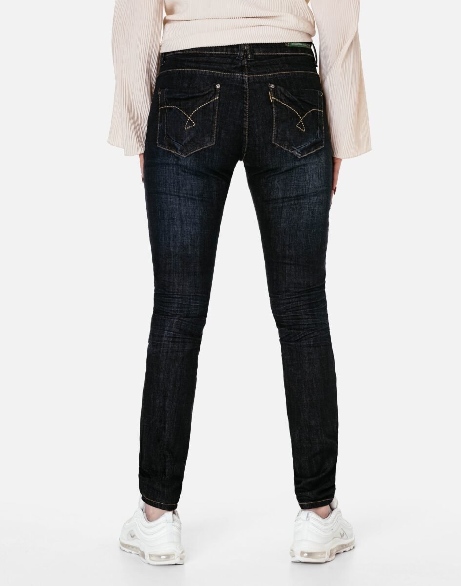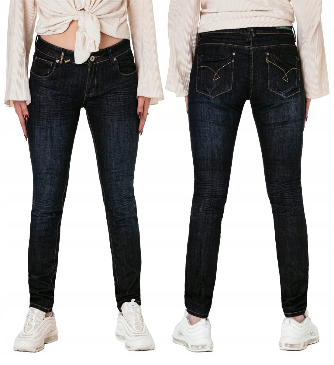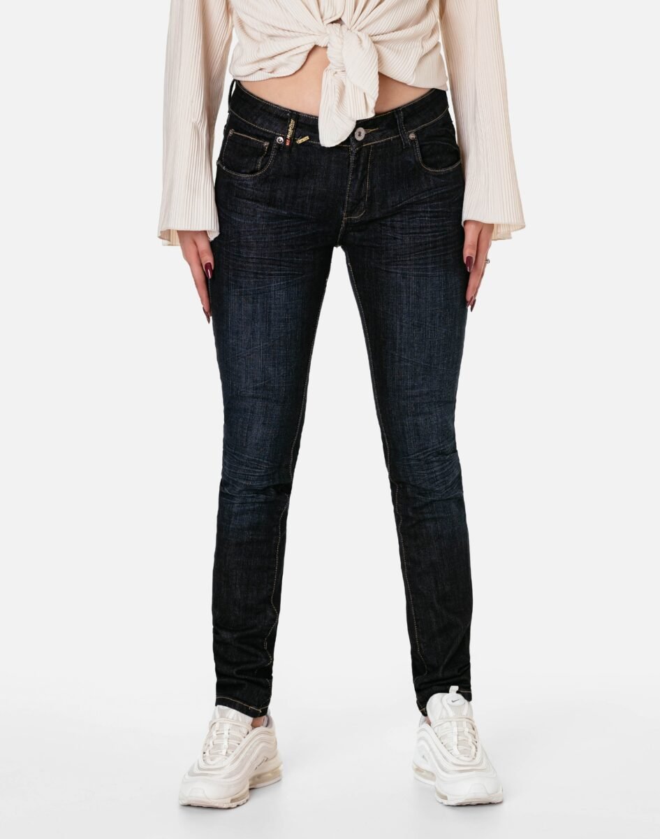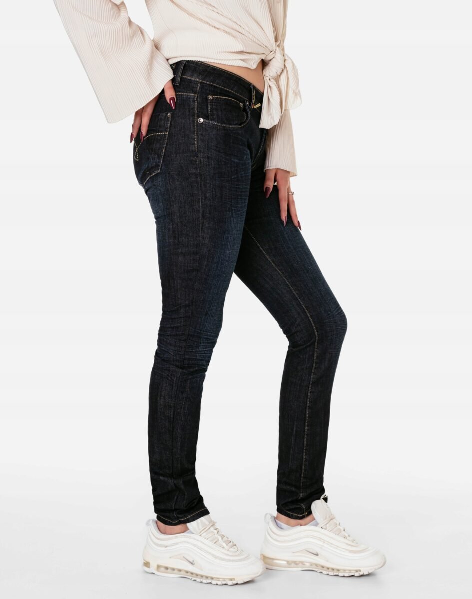 Jeansy damskie model #568 z fabrycznym efektem "used-look" (zużyty wygląd), w procesie produkcji poddane zostały specjalnym zabiegom postarzającym materiał polegającym to na wycieraniu, wypieraniu barwnika i tworzeniu efektownych pomięć i przetarć. Wykonane z wysokiej jakości tkaniny jeansowej "Denim Dark Blue" średniej grubości z modnym efektem sprania, przetarciami i pomięciami które mają na celu wywołanie tak modnego efektu długo noszonych jeansów. Zapinane na kryty zamek błyskawiczny i metalowy guzik sygnowany logiem firmy. Z przodu mają dwie kieszonki zaokrąglone oraz mniejszą kieszonkę tzw. bilonówkę, a na tyle klasyczne kieszenie naszywane jak w typowych spodniach jeansowych. W pasie szlufki umożliwiające stylizacje z paskiem. Najbardziej podatne na uszkodzenia miejsca wzmocnione są dodatkowymi przeszyciami oraz małymi ozdobnymi nitami.