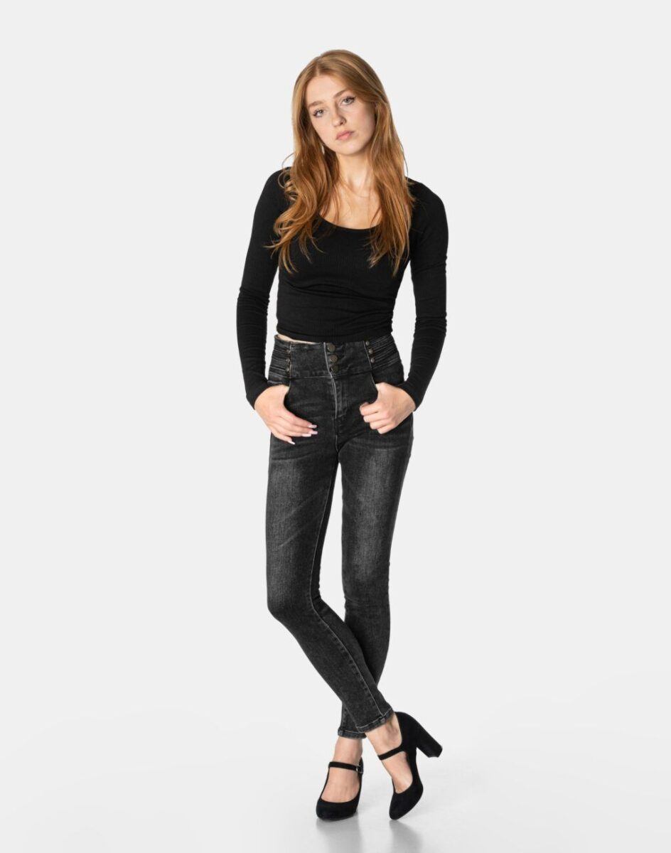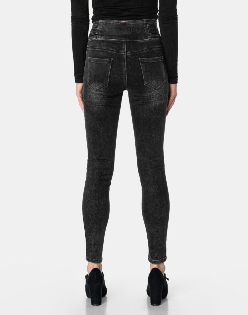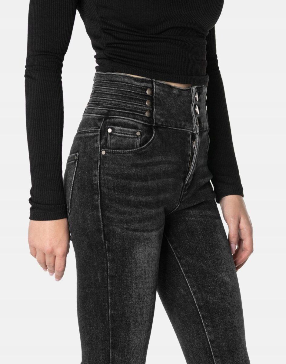 Spodnie damskie model 6059# to klasyczne, bardzo szykowne rurki w kolorze czarnym „Wash Out Black” z wąskimi nogawkami o wyszczuplającym optycznie kobiecą sylwetkę fasonie (Skinny) i wyższym stanie (High Waist). Zapinane są na kryty zamek błyskawiczny i trzy metalowe guziki. Z przodu mają dwie kieszonki zaokrąglone oraz mniejszą kieszonkę tzw. bilonówkę, a na tyle klasyczne kieszenie naszywane jak w typowych spodniach jeansowych. Najbardziej podatne na uszkodzenia miejsca wzmocnione są dodatkowymi przeszyciami oraz małymi metalowymi nitami.
