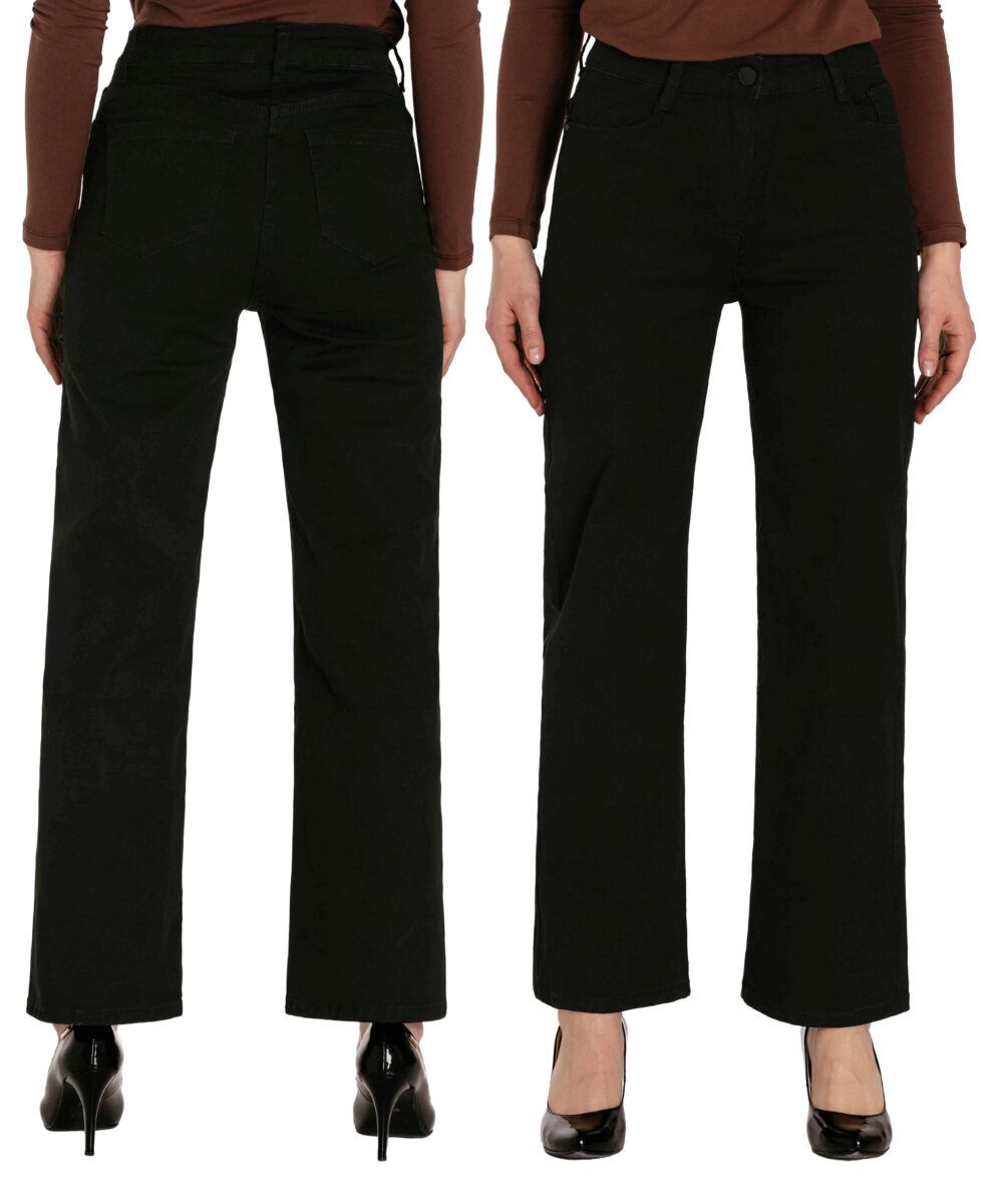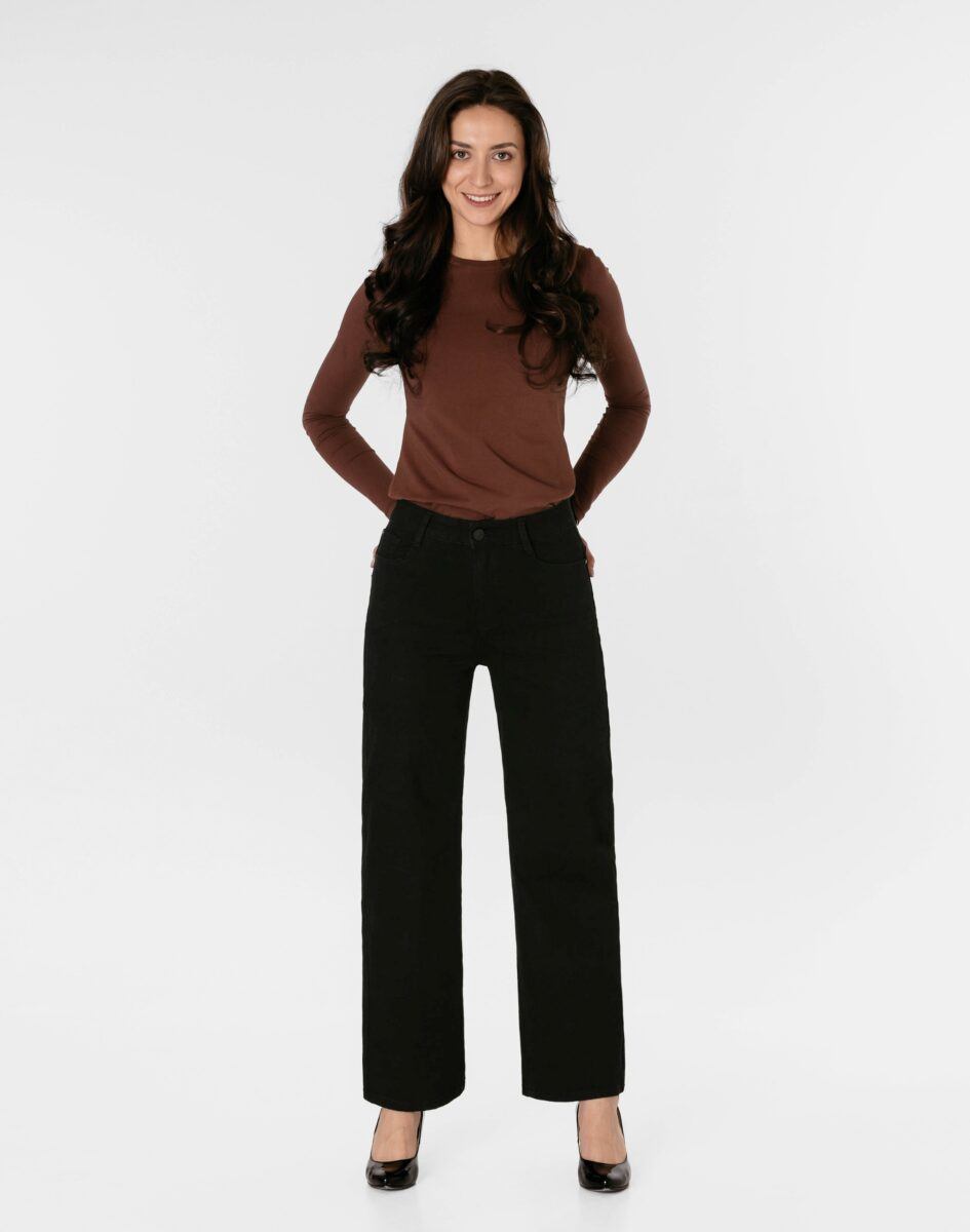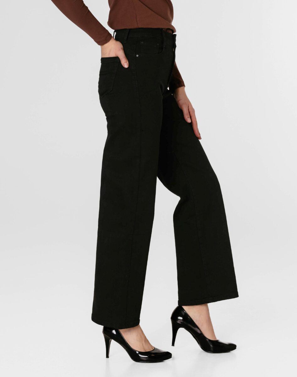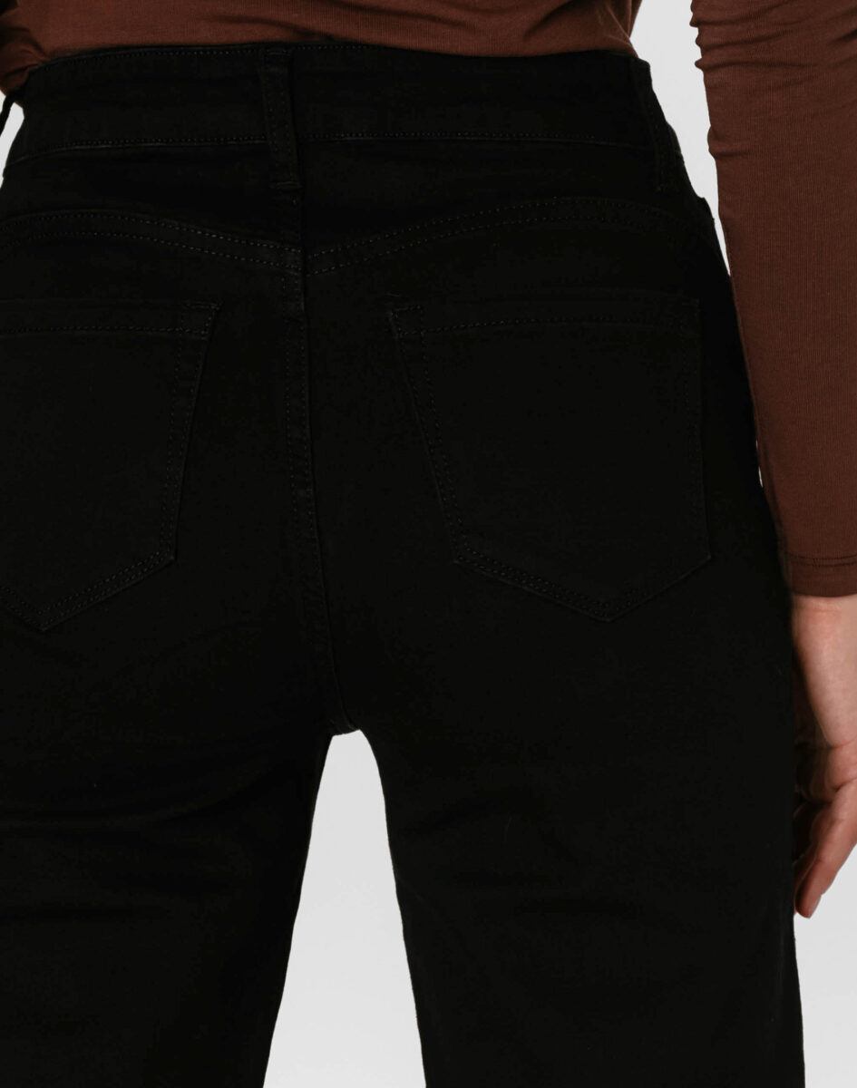 Spodnie model 2273# to powracające do łask jeansy damskie typu szwedyWide Leg w kolorze czarnym "Super Black", o charakterystycznych dla tego modelu nogawkach wide, rozszerzających się już od bioder. Wykonane z wysokiej jakości, trwałej i mocnej, sprężystej tkaniny jeansowej z domieszką lycry. Niewielki dodatek lycry sprawia, że spodnie są bardziej elastyczne, ładnie dopasowują się do sylwetki i są bardzo komfortowe w użytkowaniu. Łatwo się je zakłada i są znacznie wygodniejsze od jeansów, które lycry nie mają. Poza tym bawełna ma tendencję do kurczenia się w praniu, dlatego lycra sprawia, że spodnie są wyjątkowo praktyczne i można je bez problemu założyć po wysuszeniu. Pozwalają na pełną swobodę ruchów, co daje wygodę przy siadaniu i zapewnia ogromny komfort noszenia.