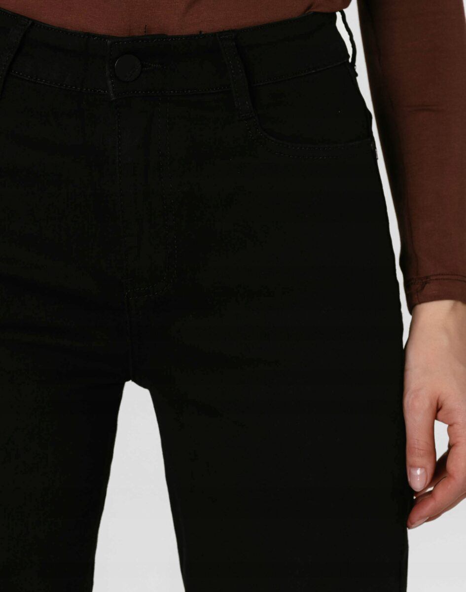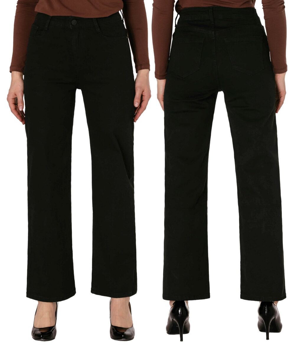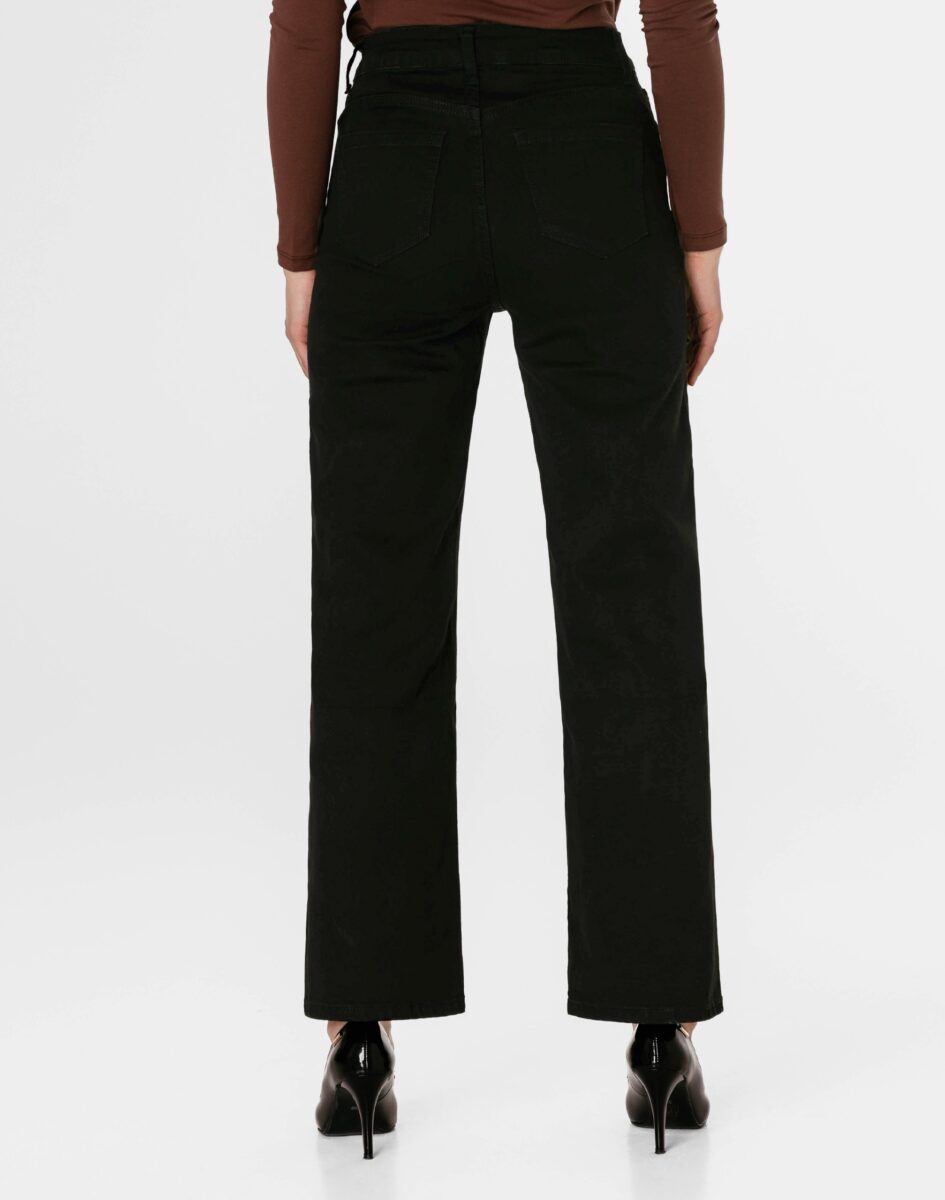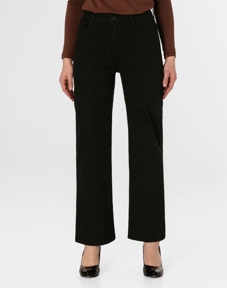 Spodnie model 2273# to powracające do łask jeansy damskie typu szwedyWide Leg w kolorze czarnym "Super Black", o charakterystycznych dla tego modelu nogawkach wide, rozszerzających się już od bioder. Wykonane z wysokiej jakości, trwałej i mocnej, sprężystej tkaniny jeansowej z domieszką lycry. Niewielki dodatek lycry sprawia, że spodnie są bardziej elastyczne, ładnie dopasowują się do sylwetki i są bardzo komfortowe w użytkowaniu. Łatwo się je zakłada i są znacznie wygodniejsze od jeansów, które lycry nie mają. Poza tym bawełna ma tendencję do kurczenia się w praniu, dlatego lycra sprawia, że spodnie są wyjątkowo praktyczne i można je bez problemu założyć po wysuszeniu. Pozwalają na pełną swobodę ruchów, co daje wygodę przy siadaniu i zapewnia ogromny komfort noszenia.