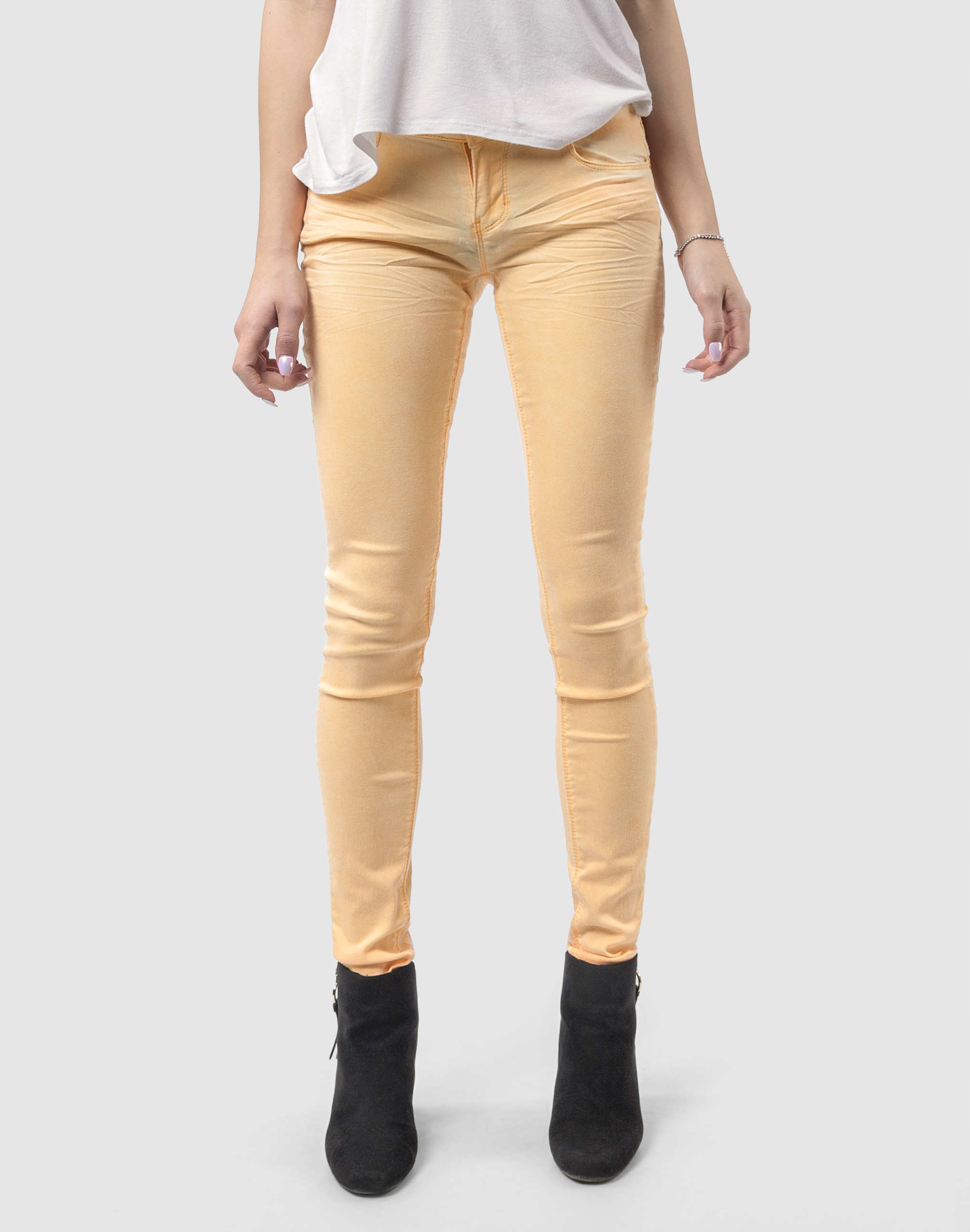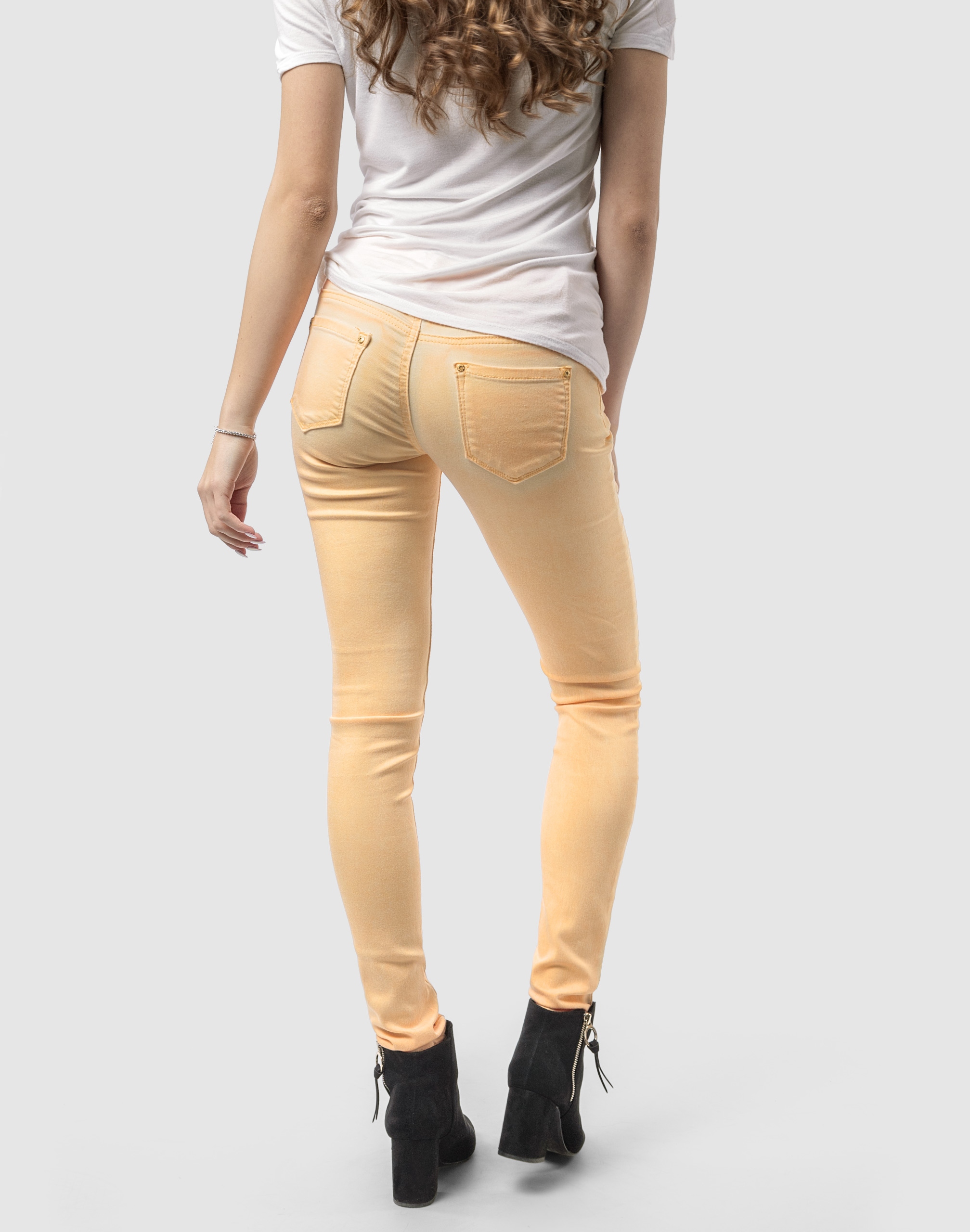 Spodnie damskie model 1015 Super Slim to klasyczna rurka z wąską, mocno dopasowaną nogawką o wyszczuplającym optycznie kobiecą sylwetkę fasonie i średnim stanie. Zapinane są na kryty zamek błyskawiczny i metalowy guzik sygnowany logiem firmy. Z przodu mają dwie kieszonki zaokrąglone oraz mniejszą kieszonkę tzw. bilonówkę, a na tyle klasyczne kieszenie naszywane jak w typowych spodniach jeansowych. W pasie szlufki umożliwiające stylizacje z paskiem. Na nogawkach i kieszeniach fabrycznie uzyskane w procesie dekatyzacji efektowne przetarcia i marszczenia w modnym stylu "used-look". Najbardziej podatne na uszkodzenia miejsca wzmocnione są dodatkowymi przeszyciami oraz małymi ozdobnymi nitami.