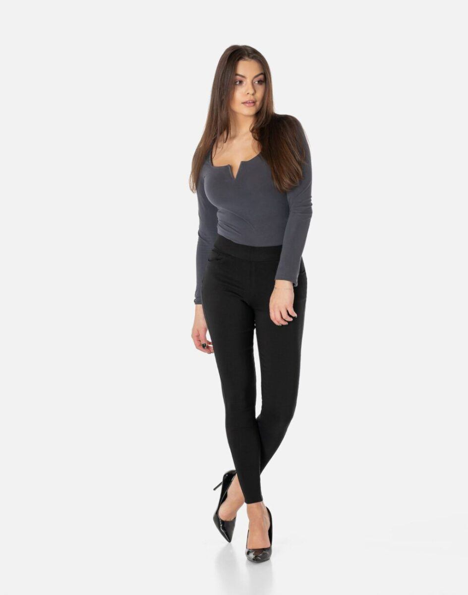 Oferowane przez nas spodnie uszyte są z wysokiej jakości tkaniny bawełnianej „Super Black” z domieszką poliestru i lycry (elastan), dzięki czemu spodnie są bardziej elastyczne, mocno przylegają do ciała a nogi wydają się się optycznie dłuższe. Pozwalają na pełną swobodę ruchów, co daje komfort przy siadaniu i zapewnia ogromny komfort noszenia. Wewnętrzna strona spodni posiada wykończenie typu „MESCH” (fabrycznie wykończona jest miłym w dotyku i przyjemnym dla ciała meszkiem tzw. „szczotkowana”) zapewniające bardzo przyjemny kontakt ze skórą oraz komfort cieplny. Możesz je śmiało łączyć zarówno z eleganckimi (idealnie wydłużają kobiece nogi), lub w wersji bardziej „na luzie” z balerinami lub czółenkami na wysokim obcasie a Twoja stylizacja nabierze wyjątkowego charakteru. Zapewniają poczucie atrakcyjności przy jednoczesnym zachowaniu wygody i pełnej swobody ruchów. Sprawdzony przez wiele zadowolonych klientek fason Slim Fit z wąską dopasowaną nogawką pozwoli Ci założyć je na wiele różnych okazji a miłośniczki spodni Push-Up jednogłośnie twierdzą, że w trakcie ich noszenia pewność siebie szybuje bardzo wysoko.