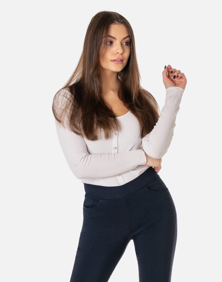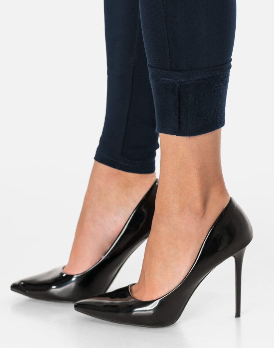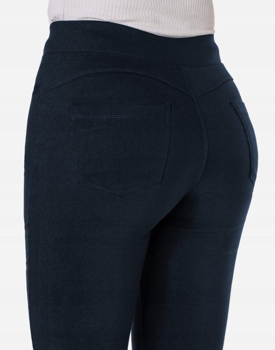 Oferowane przez nas spodnie uszyte są z wysokiej jakości tkaniny bawełnianej „Dark Blue” z domieszką lycry (elastan), dzięki czemu spodnie są bardziej elastyczne, mocno przylegają do ciała a nogi wydają się się optycznie dłuższe. Pozwalają na pełną swobodę ruchów, co daje komfort przy siadaniu i zapewnia ogromny komfort noszenia. Wewnętrzna strona spodni posiada wykończenie typu „MESCH” (fabrycznie wykończona jest miłym w dotyku i przyjemnym dla ciała meszkiem tzw. „szczotkowana”) zapewniające bardzo przyjemny kontakt ze skórą oraz komfort cieplny. Możesz je śmiało łączyć zarówno z eleganckimi (idealnie wydłużają kobiece nogi), lub w wersji bardziej „na luzie” z balerinami lub czółenkami na wysokim obcasie a Twoja stylizacja nabierze wyjątkowego charakteru. Zapewniają poczucie atrakcyjności przy jednoczesnym zachowaniu wygody i pełnej swobody ruchów. Sprawdzony przez wiele zadowolonych klientek fason Slim Fit z wąską dopasowaną nogawką pozwoli Ci założyć je na wiele różnych okazji a miłośniczki spodni Push-Up jednogłośnie twierdzą, że w trakcie ich noszenia pewność siebie szybuje bardzo wysoko.