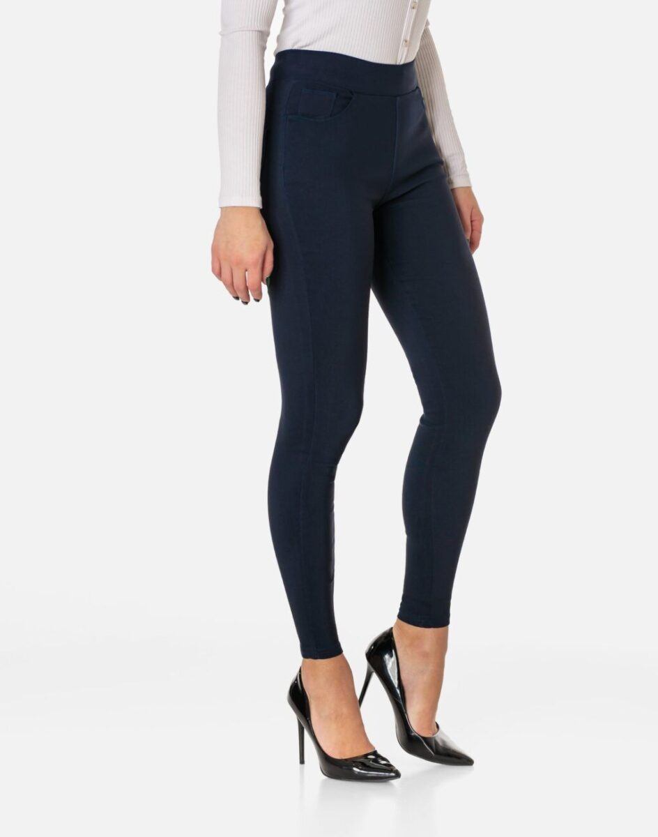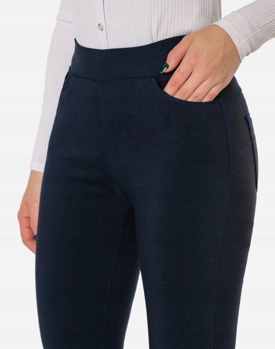 Oferowane przez nas spodnie uszyte są z wysokiej jakości tkaniny bawełnianej „Dark Blue” z domieszką lycry (elastan), dzięki czemu spodnie są bardziej elastyczne, mocno przylegają do ciała a nogi wydają się się optycznie dłuższe. Pozwalają na pełną swobodę ruchów, co daje komfort przy siadaniu i zapewnia ogromny komfort noszenia. Wewnętrzna strona spodni posiada wykończenie typu „MESCH” (fabrycznie wykończona jest miłym w dotyku i przyjemnym dla ciała meszkiem tzw. „szczotkowana”) zapewniające bardzo przyjemny kontakt ze skórą oraz komfort cieplny. Możesz je śmiało łączyć zarówno z eleganckimi (idealnie wydłużają kobiece nogi), lub w wersji bardziej „na luzie” z balerinami lub czółenkami na wysokim obcasie a Twoja stylizacja nabierze wyjątkowego charakteru. Zapewniają poczucie atrakcyjności przy jednoczesnym zachowaniu wygody i pełnej swobody ruchów. Sprawdzony przez wiele zadowolonych klientek fason Slim Fit z wąską dopasowaną nogawką pozwoli Ci założyć je na wiele różnych okazji a miłośniczki spodni Push-Up jednogłośnie twierdzą, że w trakcie ich noszenia pewność siebie szybuje bardzo wysoko.