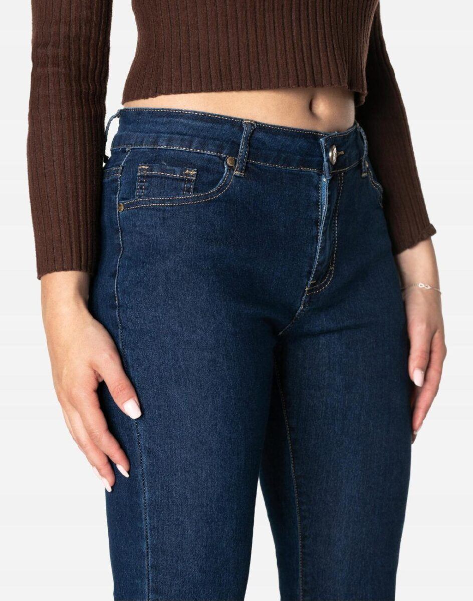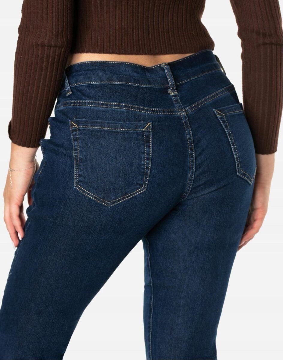 Oferowane przez nas spodnie uszyte są z wysokiej jakości granatowej tkaniny jeansowej typu „Denim Dark Blue” z domieszką lycry, która odznacza się wysoką elastycznością, co gwarantuje, że spodnie nie będą się deformować i odkształcać nawet po długim użytkowaniu. Jeansy świetnie przylegają do ciała i pozwalają na pełną swobodę ruchów, co daje wygodę przy siadaniu i zapewnia ogromny komfort noszenia. Możesz je śmiało łączyć zarówno ze szpilkami (idealnie wydłużają kobiece nogi), jak i obuwiem sportowym. Dobrze wyglądają również z podwiniętymi nogawkami. Niepozorne podwinięcie nogawek nadaje stylizacjom ciekawej nonszalancji i zadziorności. Zapewniają poczucie atrakcyjności przy jednoczesnym zachowaniu wygody i pełnej swobody ruchów.