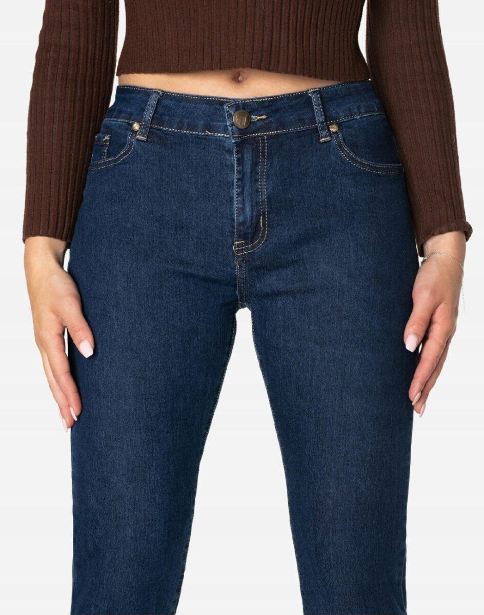 Oferowane przez nas spodnie uszyte są z wysokiej jakości granatowej tkaniny jeansowej typu „Denim Dark Blue” z domieszką lycry, która odznacza się wysoką elastycznością, co gwarantuje, że spodnie nie będą się deformować i odkształcać nawet po długim użytkowaniu. Jeansy świetnie przylegają do ciała i pozwalają na pełną swobodę ruchów, co daje wygodę przy siadaniu i zapewnia ogromny komfort noszenia. Możesz je śmiało łączyć zarówno ze szpilkami (idealnie wydłużają kobiece nogi), jak i obuwiem sportowym. Dobrze wyglądają również z podwiniętymi nogawkami. Niepozorne podwinięcie nogawek nadaje stylizacjom ciekawej nonszalancji i zadziorności. Zapewniają poczucie atrakcyjności przy jednoczesnym zachowaniu wygody i pełnej swobody ruchów.