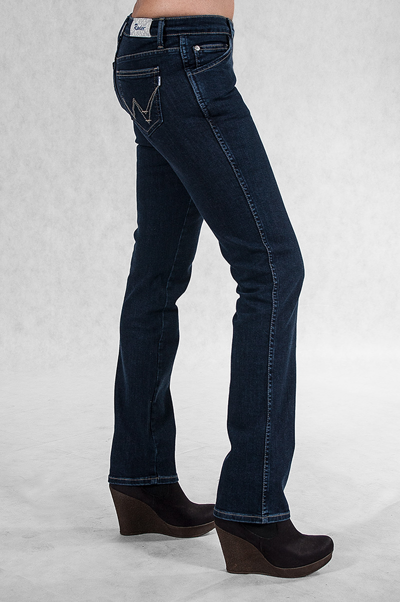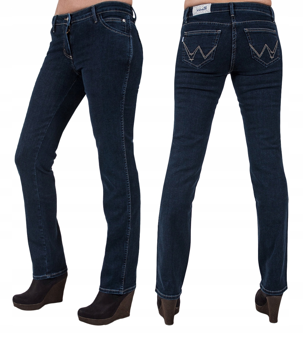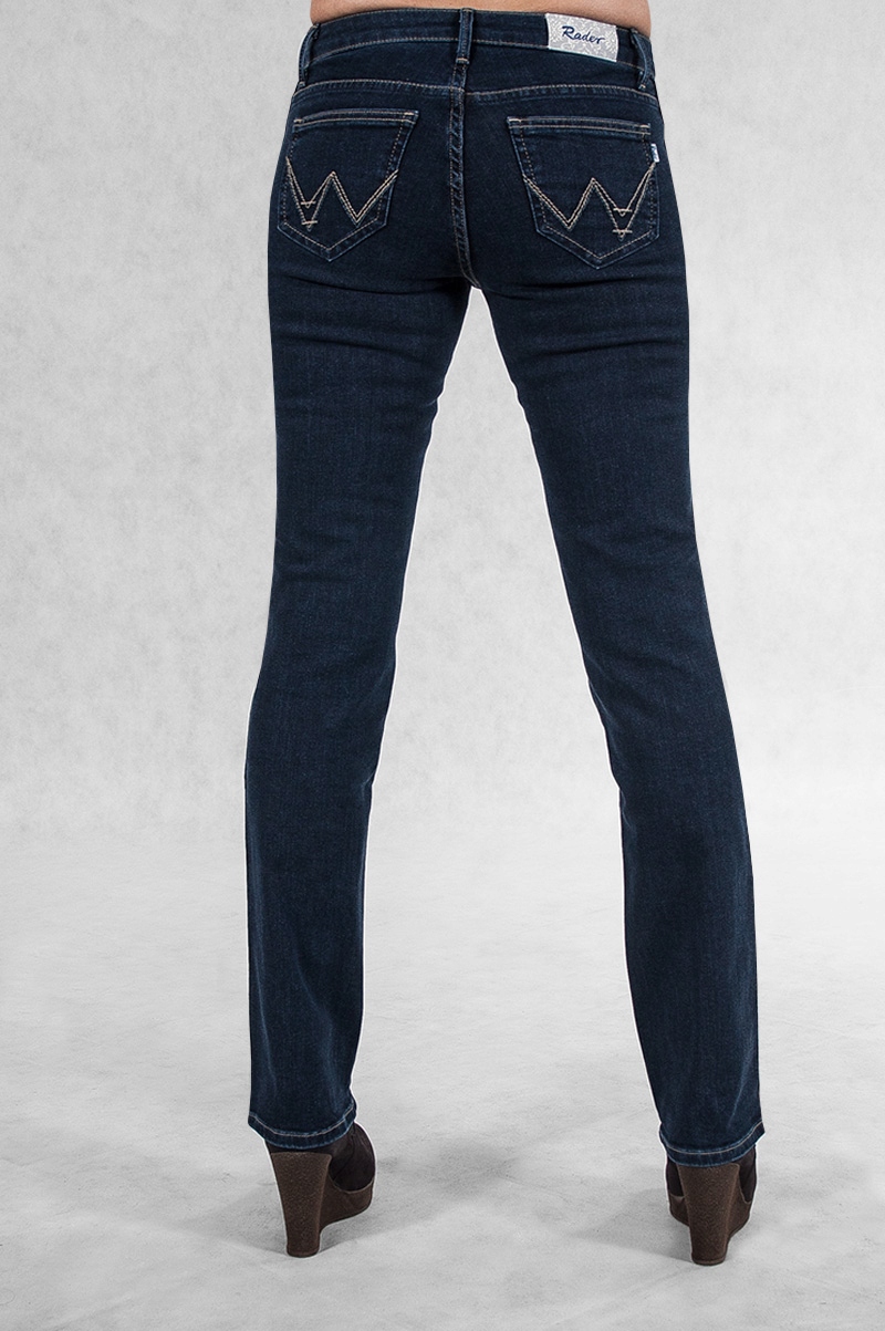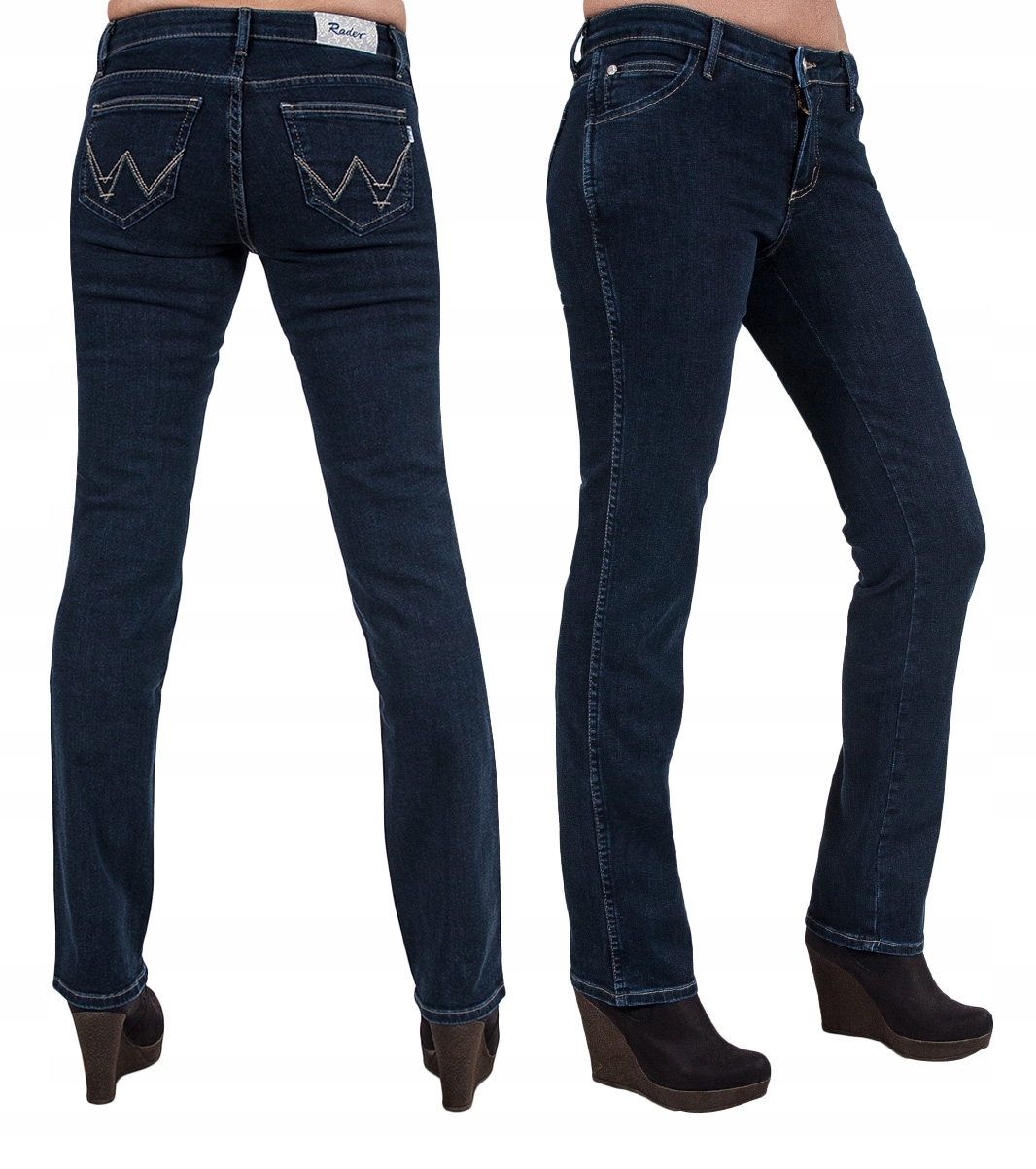 Klasyczne jeansy damskie polskiej firmy Rader w kolorze granatowym z prostymi nogawkami o wyszczuplającym optycznie kobiecą sylwetkę fasonie i średnim stanie. Zapinane na kryty zamek błyskawiczny i metalowy guzik sygnowany logiem firmy. Z przodu mają dwie kieszonki zaokrąglone oraz mniejszą kieszonkę tzw. bilonówkę, a na tyle klasyczne kieszenie naszywane jak w typowych spodniach jeansowych. W pasie szlufki umożliwiające stylizacje z paskiem. Najbardziej podatne na uszkodzenia miejsca wzmocnione są dodatkowymi przeszyciami oraz firmowymi nitami.
