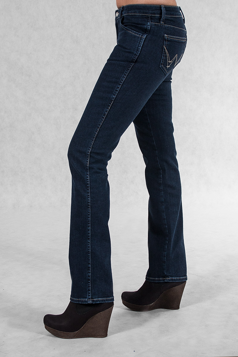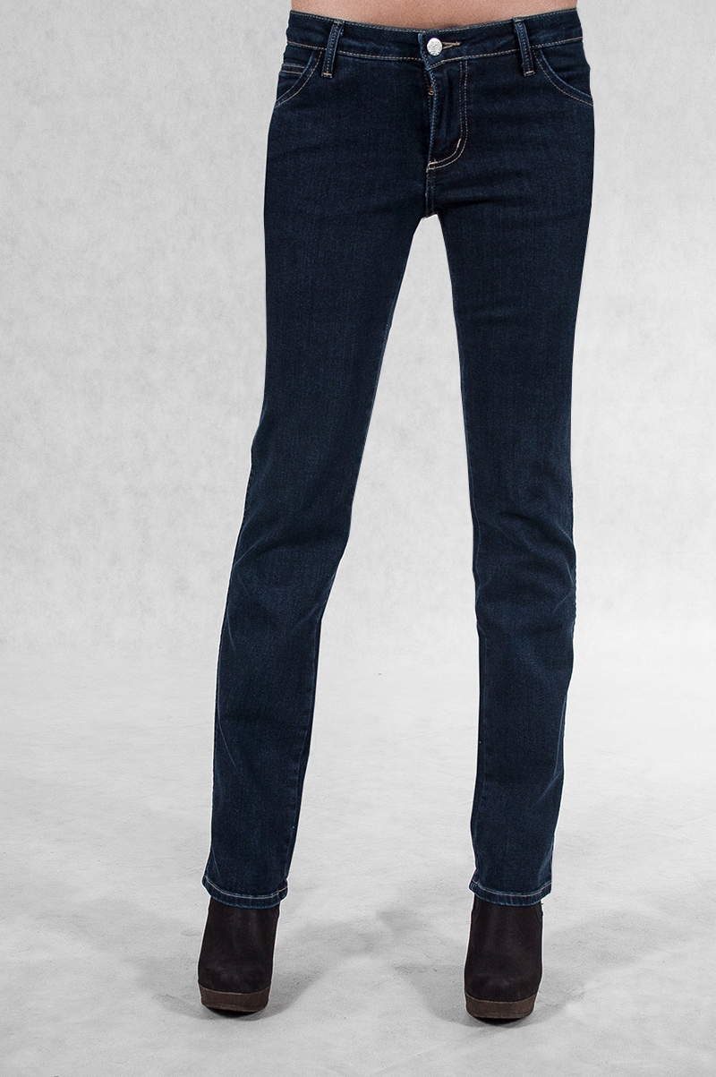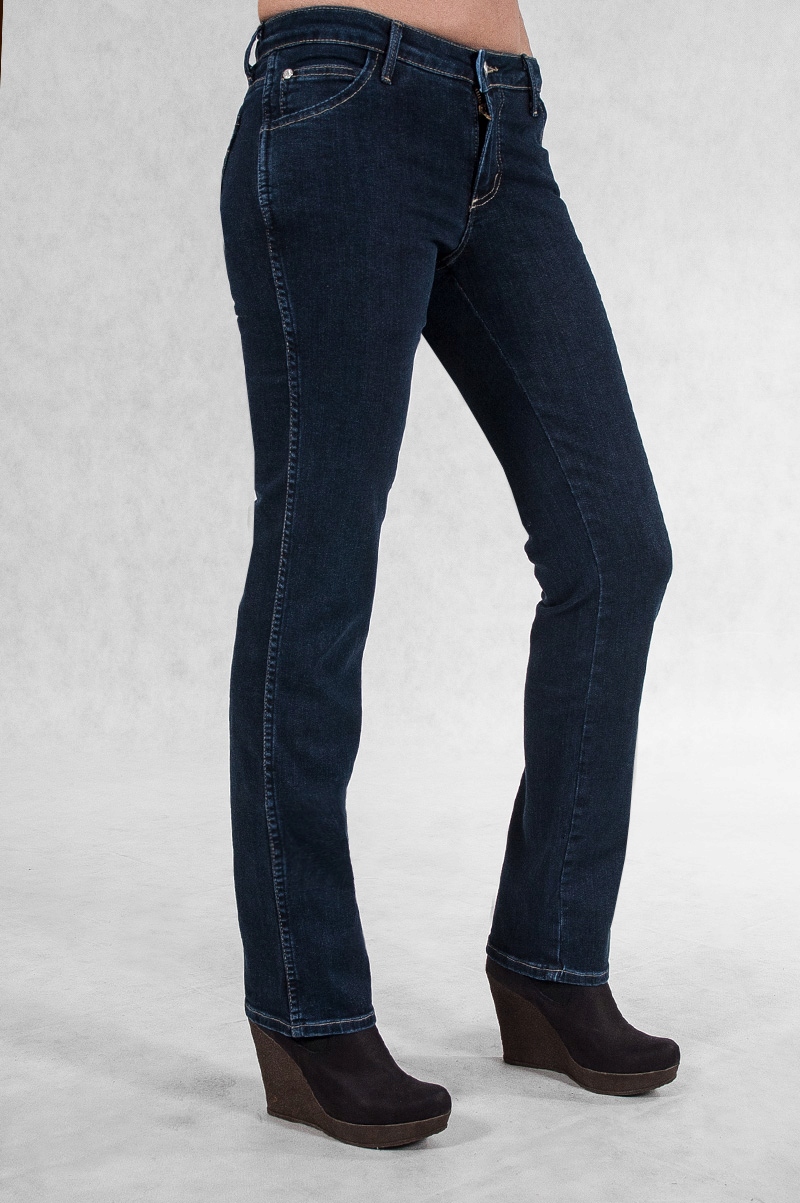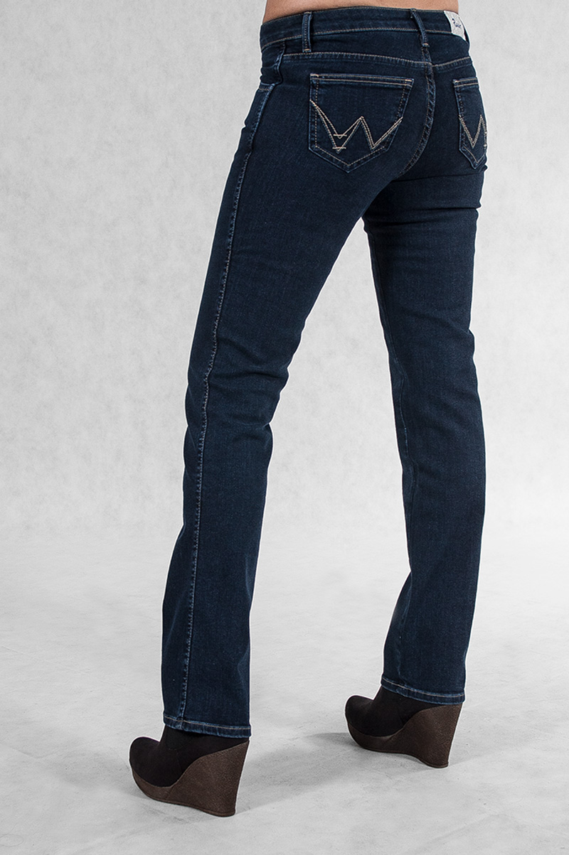 Klasyczne jeansy damskie polskiej firmy Rader w kolorze granatowym z prostymi nogawkami o wyszczuplającym optycznie kobiecą sylwetkę fasonie i średnim stanie. Zapinane na kryty zamek błyskawiczny i metalowy guzik sygnowany logiem firmy. Z przodu mają dwie kieszonki zaokrąglone oraz mniejszą kieszonkę tzw. bilonówkę, a na tyle klasyczne kieszenie naszywane jak w typowych spodniach jeansowych. W pasie szlufki umożliwiające stylizacje z paskiem. Najbardziej podatne na uszkodzenia miejsca wzmocnione są dodatkowymi przeszyciami oraz firmowymi nitami.