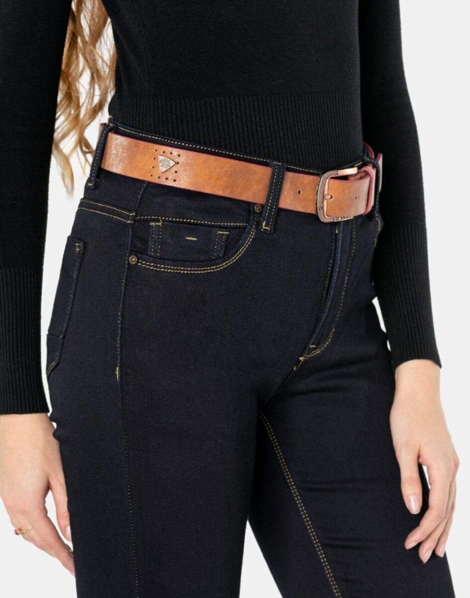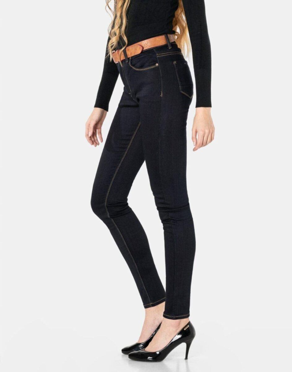Ciepłe Jeansy damskie model RED-175 to klasyczne, bardzo szykowne rurki w kolorze granatowym „Dark Blue”, ocieplone od wewnętrznej strony, z wąskimi nogawkami o wyszczuplającym optycznie kobiecą sylwetkę fasonie i wyższym stanie. Zapinane są na kryty zamek błyskawiczny i metalowy guzik sygnowany logiem firmy. Z przodu mają dwie kieszonki zaokrąglone oraz mniejszą kieszonkę tzw. bilonówkę, a na tyle klasyczne kieszenie naszywane jak w typowych spodniach jeansowych. W pasie szlufki umożliwiające stylizacje z paskiem. Najbardziej podatne na uszkodzenia miejsca wzmocnione są dodatkowymi przeszyciami oraz ozdobnymi nitami. Uszyte z mocnego denimu z niewielkim dodatkiem lycry (elastan) dzięki czemu spodnie są bardziej elastyczne co pozwala na pełną swobodę ruchów, daje komfort przy siadaniu i zapewnia ogromny komfort noszenia.