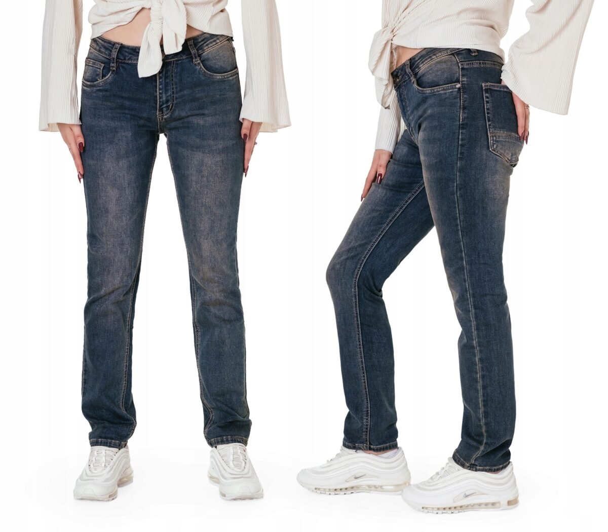 Granatowe jeansy damskie model #24043 z wysokim stanem i klasyczną prostą nogawką to klasyka wśród klasyki i jeden z najczęściej wybieranych modeli spodni. Wykonane z wysokiej jakości delikatnie elastycznej tkaniny jeansowej typu "Dark Blue Denim" średniej grubości z dodatkiem lycry (elastan) oraz modnymi efektami sprania, przetarciami i przebarwieniami w nieśmiertelnym stylu "used-look" (zużyty wygląd). Dzięki dodatkowi elastanu łatwo się je zakłada i są znacznie wygodniejsze od spodni które lycry nie mają. Poza tym bawełna ma tendencję do kurczenia się w praniu, dlatego lycra sprawia, że spodnie są wyjątkowo praktyczne i można je bez problemu założyć po wysuszeniu. Zapinane na kryty zamek błyskawiczny i metalowy guzik sygnowany logiem firmy. Z przodu mają 2 kieszonki zaokrąglone oraz mniejszą kieszonkę tzw. bilonówkę, a na tyle klasyczne kieszenie naszywane jak w typowych spodniach jeansowych. W pasie szlufki umożliwiające stylizacje z paskiem. Najbardziej podatne na uszkodzenia miejsca wzmocnione są dodatkowymi przeszyciami oraz małymi ozdobnymi nitami.