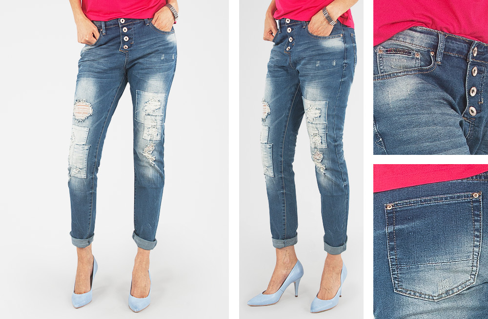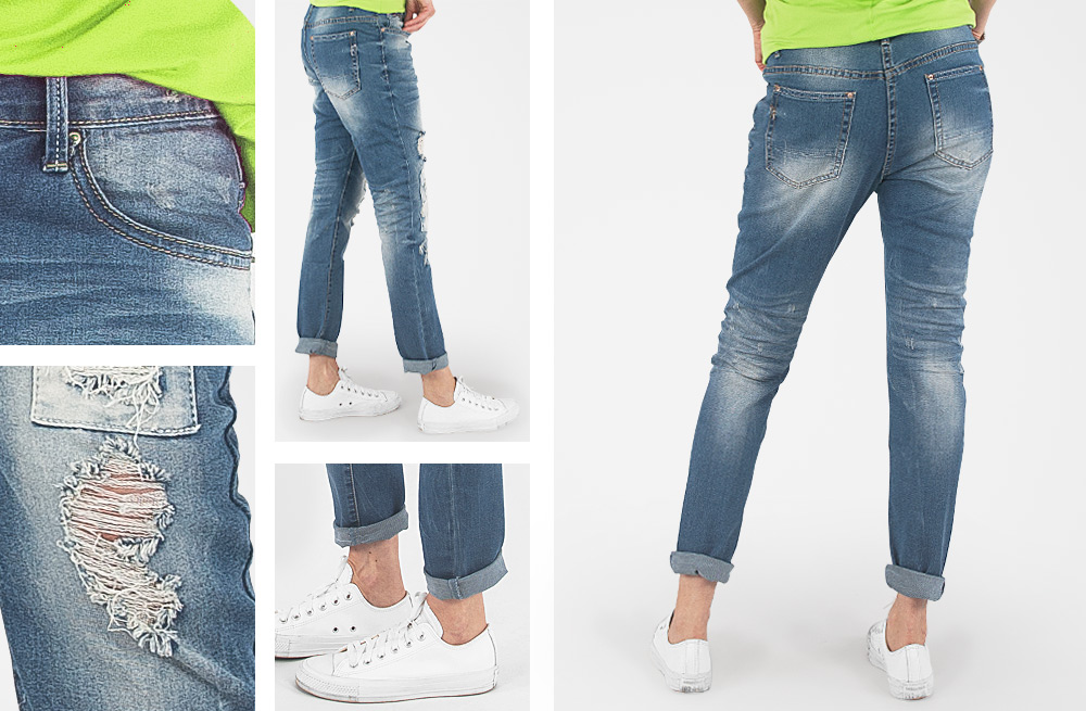 - Wzór: ozdobnie sprany Denim Jeans z efektem "used-look" – rozjaśnieniami, przetarciami i dziurami