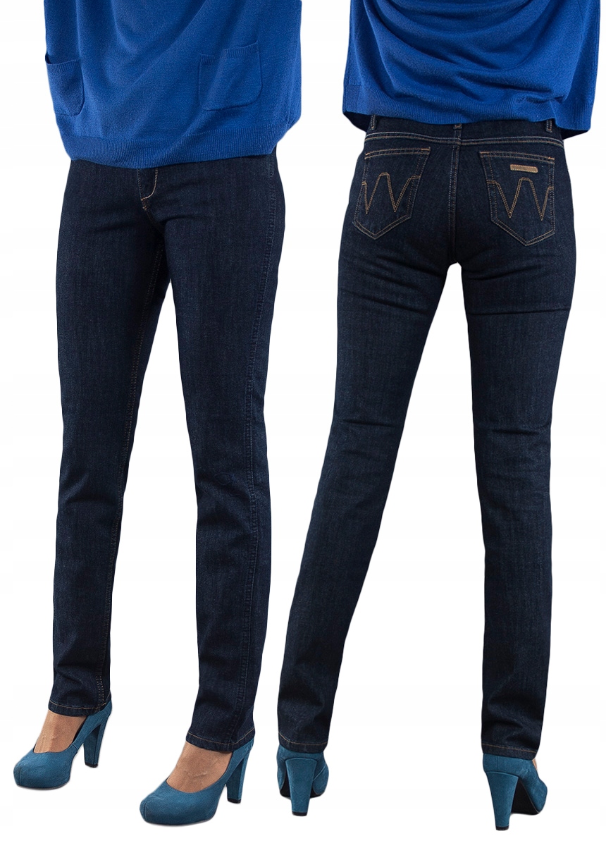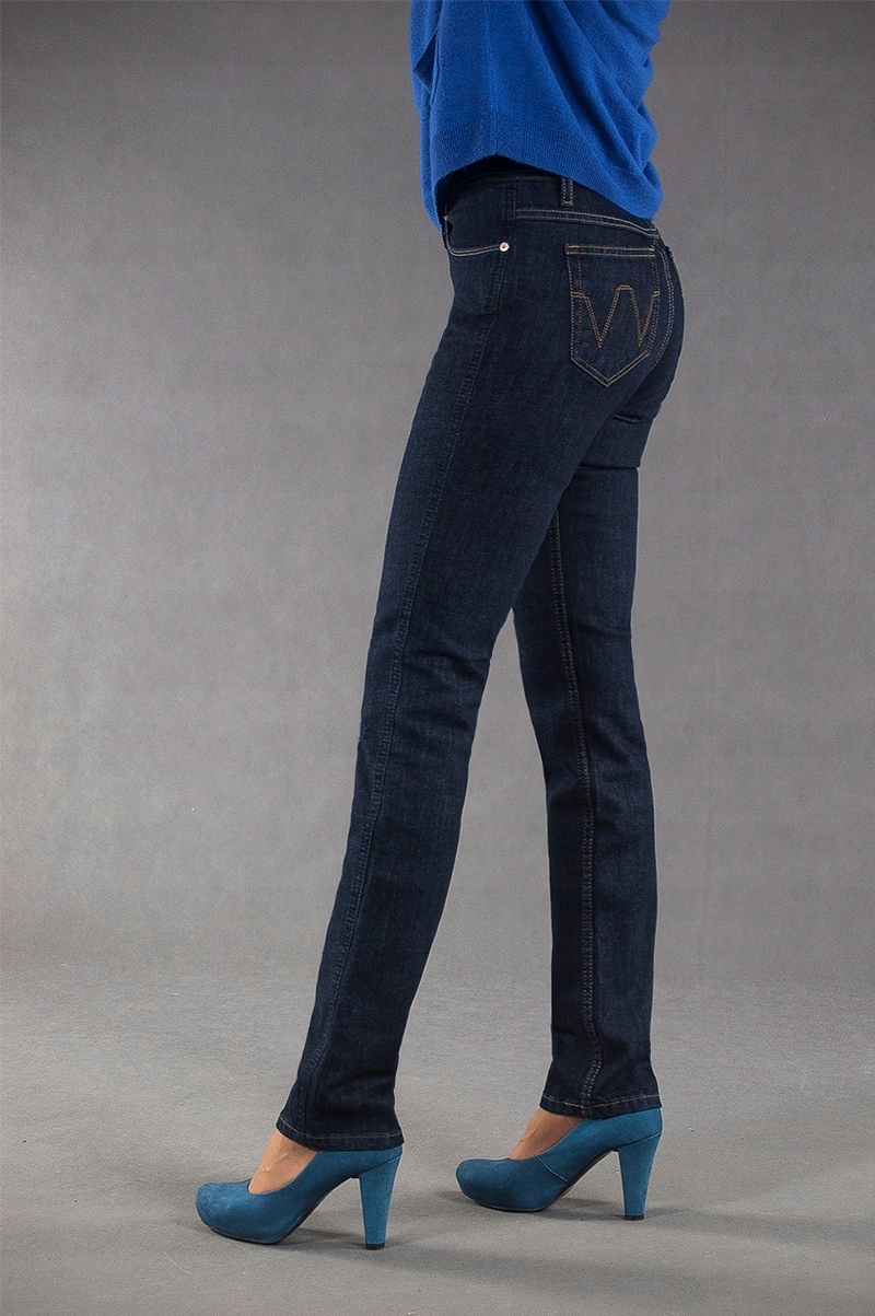 Jeansy damskie polskiej firmy BRIDLE model Violetta to klasyczne, bardzo szykowne rurki damskie w kolorze granatowym z wąskimi nogawkami o wyszczuplającym optycznie kobiecą sylwetkę fasonie i wyższym stanie. Zapinane są na kryty zamek błyskawiczny i metalowy guzik sygnowany logiem firmy. Z przodu mają dwie kieszonki zaokrąglone oraz mniejszą kieszonkę tzw. bilonówkę, a na tyle klasyczne kieszenie naszywane jak w typowych spodniach jeansowych. W pasie szlufki umożliwiające stylizacje z paskiem.Najbardziej podatne na uszkodzenia miejsca wzmocnione są dodatkowymi przeszyciami oraz małymi ozdobnymi nitami.