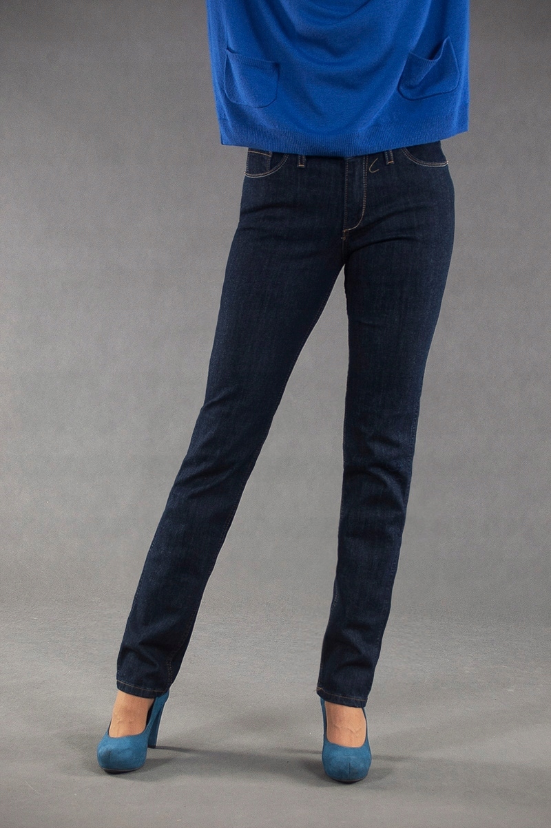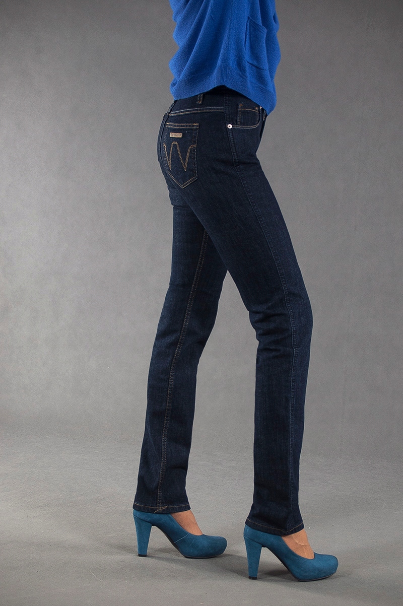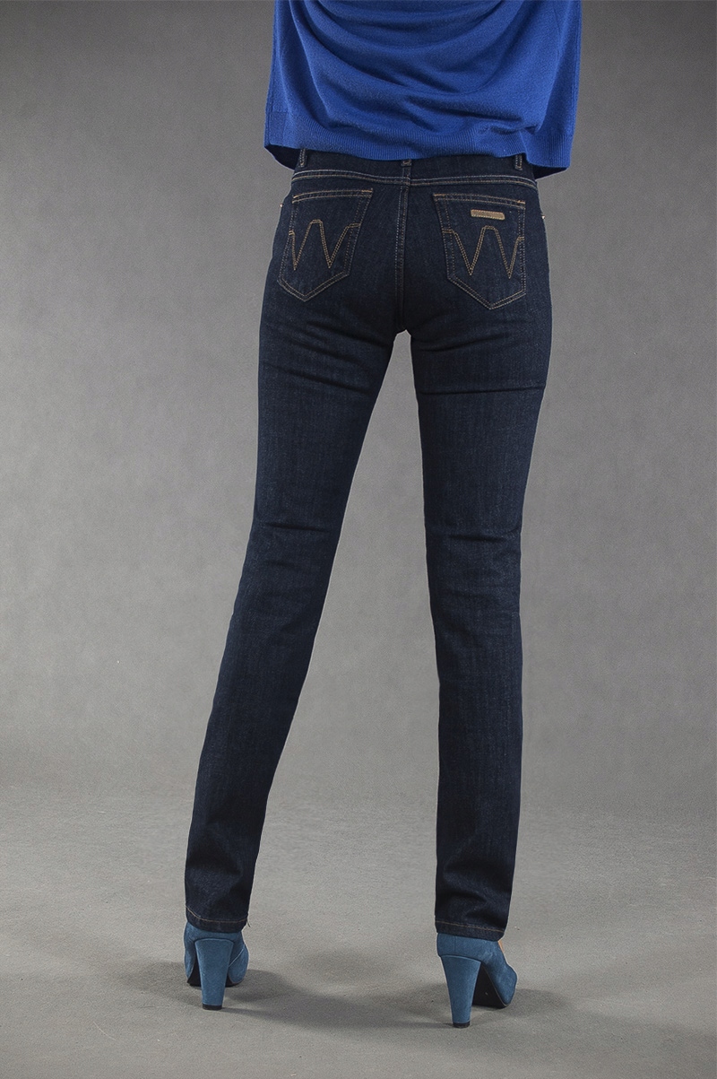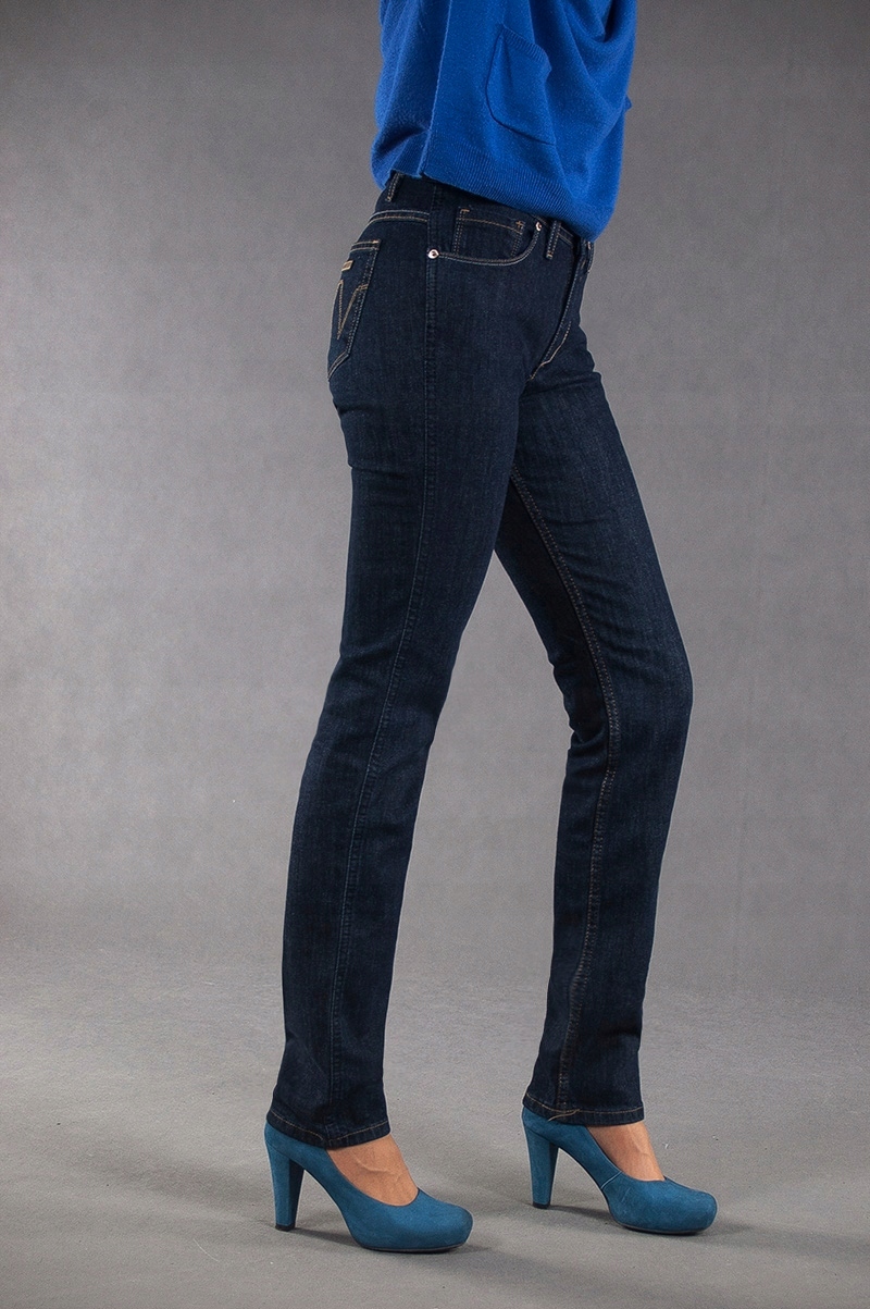 Jeansy damskie polskiej firmy BRIDLE model Violetta to klasyczne, bardzo szykowne rurki damskie w kolorze granatowym z wąskimi nogawkami o wyszczuplającym optycznie kobiecą sylwetkę fasonie i wyższym stanie. Zapinane są na kryty zamek błyskawiczny i metalowy guzik sygnowany logiem firmy. Z przodu mają dwie kieszonki zaokrąglone oraz mniejszą kieszonkę tzw. bilonówkę, a na tyle klasyczne kieszenie naszywane jak w typowych spodniach jeansowych. W pasie szlufki umożliwiające stylizacje z paskiem.Najbardziej podatne na uszkodzenia miejsca wzmocnione są dodatkowymi przeszyciami oraz małymi ozdobnymi nitami.