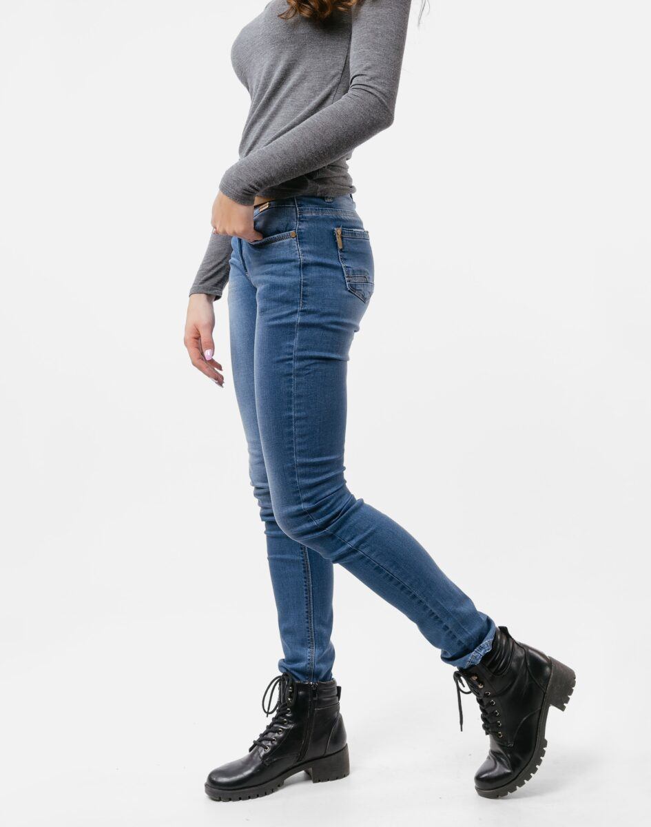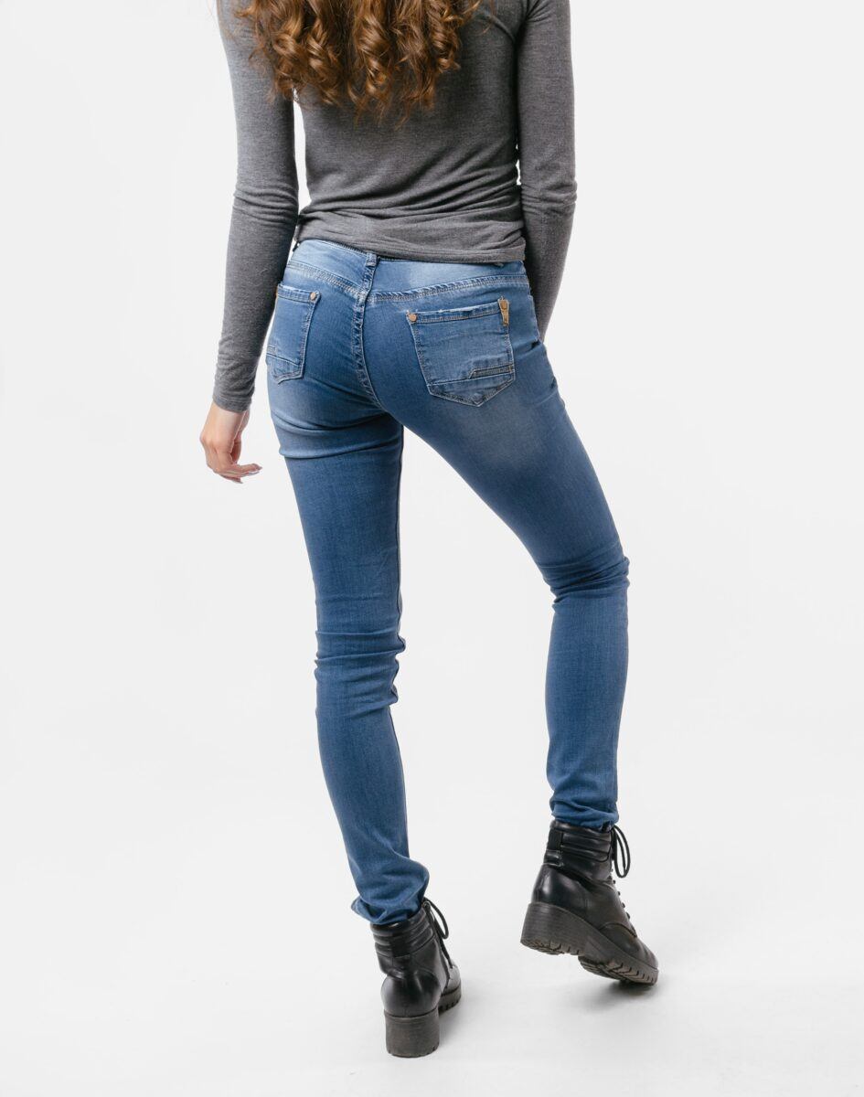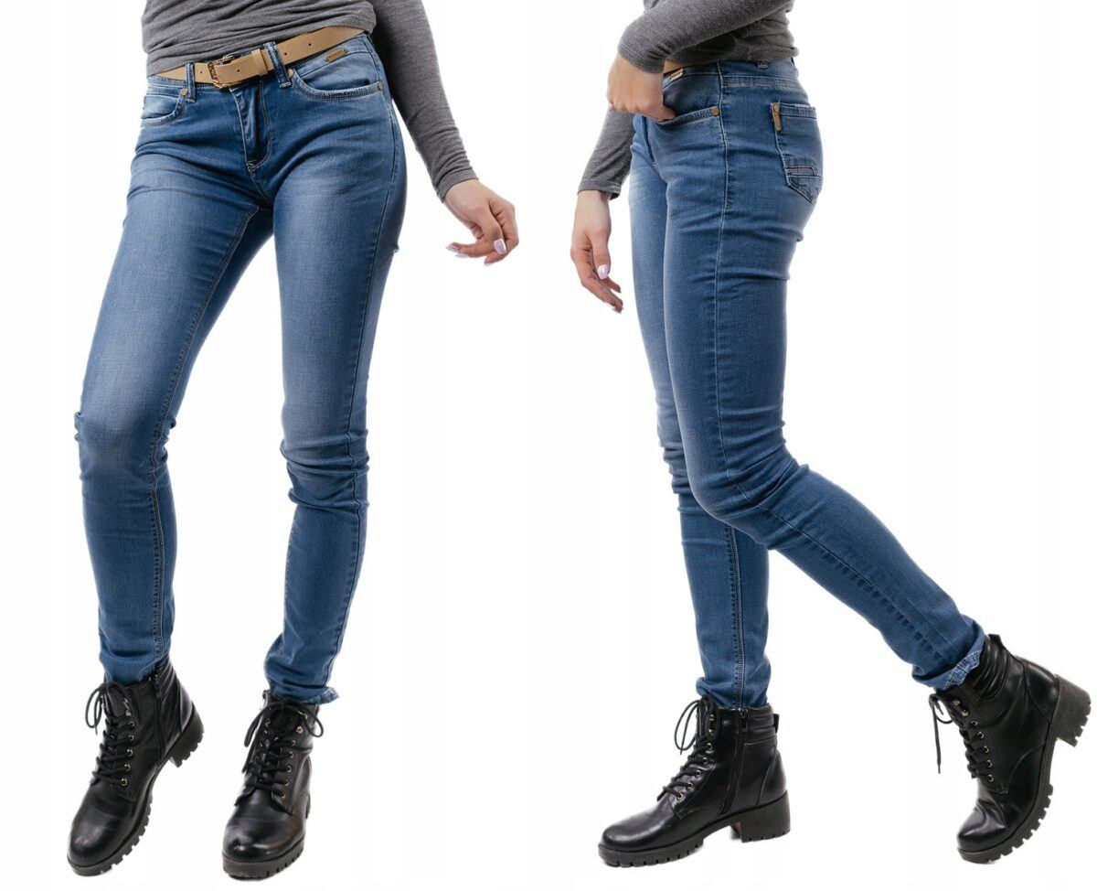 Spodnie damskie model 20363 to klasyczna niebieska rurka z wąską, mocno dopasowaną nogawką i ze zwężanymi ku dołowi nogawkami o wyszczuplającym optycznie kobiecą sylwetkę fasonie i średnim stanie. Zapinane są na kryty zamek błyskawiczny i guzik sygnowany logiem firmy. Z przodu mają dwie kieszonki zaokrąglone oraz mniejszą kieszonkę tzw. bilonówkę, a na tyle klasyczne kieszenie naszywane jak w typowych spodniach jeansowych. W pasie szlufki umożliwiające stylizacje z paskiem. Na nogawkach i kieszeniach efektowne przetarcia i marszczenia w modnym stylu „used-look”. Najbardziej podatne na uszkodzenia miejsca wzmocnione są dodatkowymi przeszyciami oraz ozdobnymi nitami.