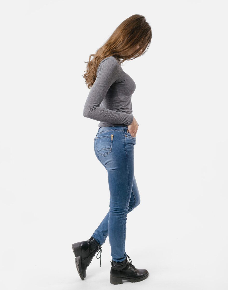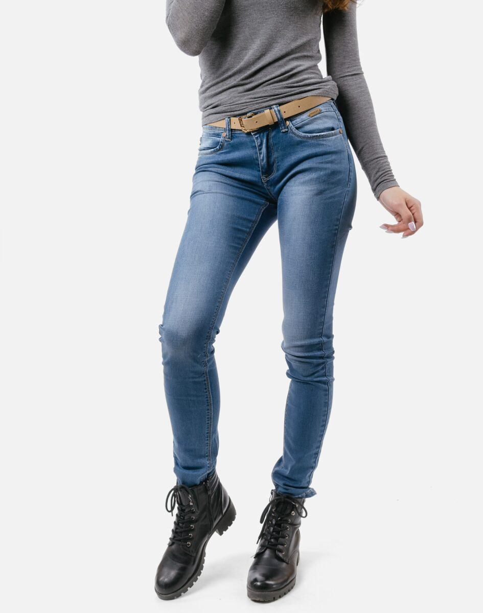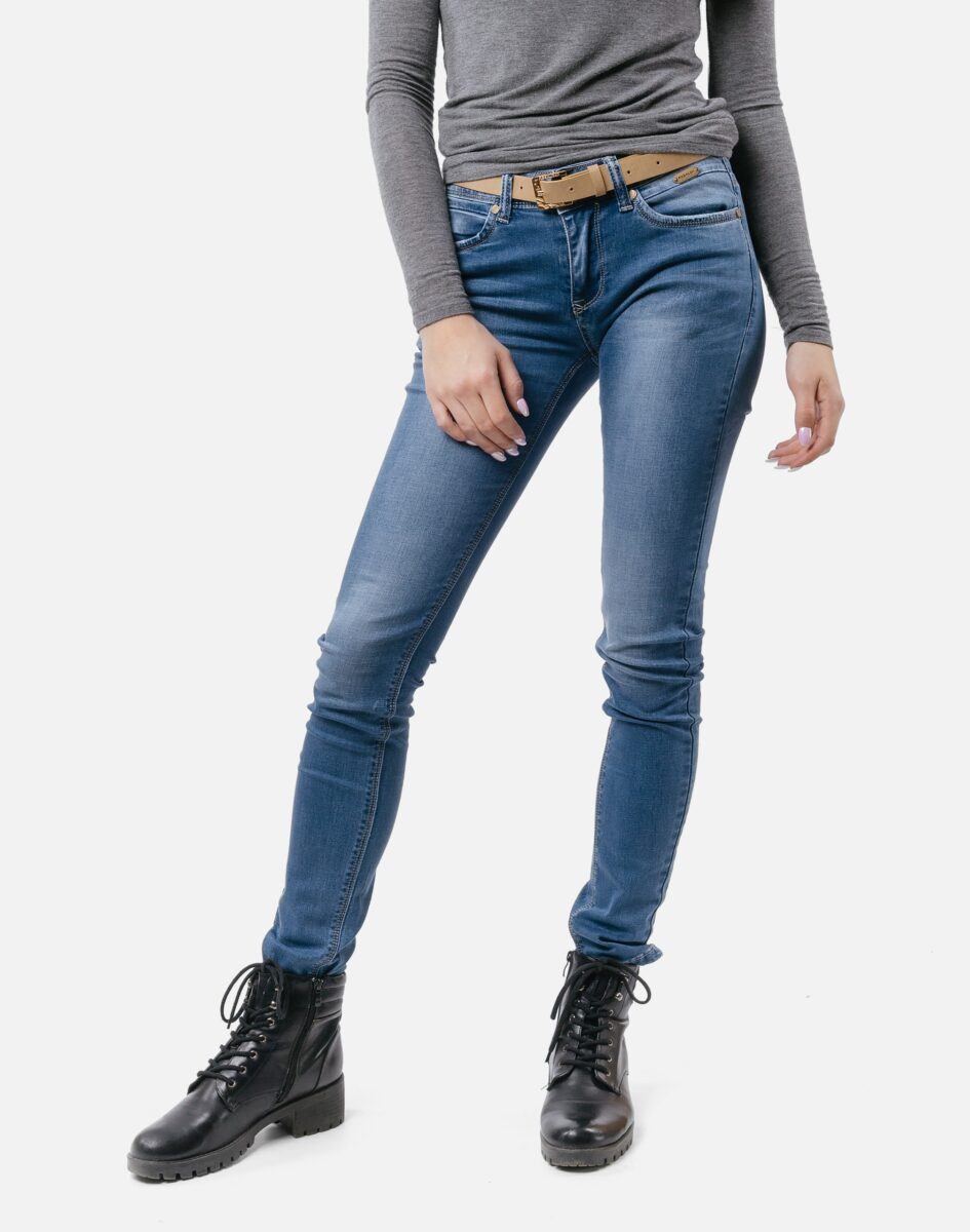 Spodnie damskie model 20363 to klasyczna niebieska rurka z wąską, mocno dopasowaną nogawką i ze zwężanymi ku dołowi nogawkami o wyszczuplającym optycznie kobiecą sylwetkę fasonie i średnim stanie. Zapinane są na kryty zamek błyskawiczny i guzik sygnowany logiem firmy. Z przodu mają dwie kieszonki zaokrąglone oraz mniejszą kieszonkę tzw. bilonówkę, a na tyle klasyczne kieszenie naszywane jak w typowych spodniach jeansowych. W pasie szlufki umożliwiające stylizacje z paskiem. Na nogawkach i kieszeniach efektowne przetarcia i marszczenia w modnym stylu „used-look”. Najbardziej podatne na uszkodzenia miejsca wzmocnione są dodatkowymi przeszyciami oraz ozdobnymi nitami.