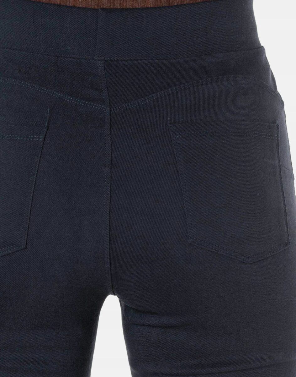 Spodnie damskie M.Sara model 58068 z efektem Push-Up to klasyczne, bardzo szykowne rurki w kolorze granatowym „Dark Blue” z wąskimi nogawkami o wyszczuplającym optycznie kobiecą sylwetkę fasonie i wyższym stanie. Delikatnie ściskają i podnoszą pupę dzięki odpowiedniemu krojowi i specjalnym szwom z tyłu spodni które sprawiają, że pośladki stają się zgrabnie wymodelowane, nadają pośladkom optyczną jędrność i uwydatniają same ich zalety. Z przodu mają dwie kieszonki zaokrąglone oraz mniejszą kieszonkę tzw. bilonówkę, a na tyle klasyczne kieszenie naszywane jak w typowych spodniach jeansowych. Dopasowanie w pasie zapewnia szeroki elastyczny pas ściągający, który zgrabnie modeluje sylwetkę w talii.