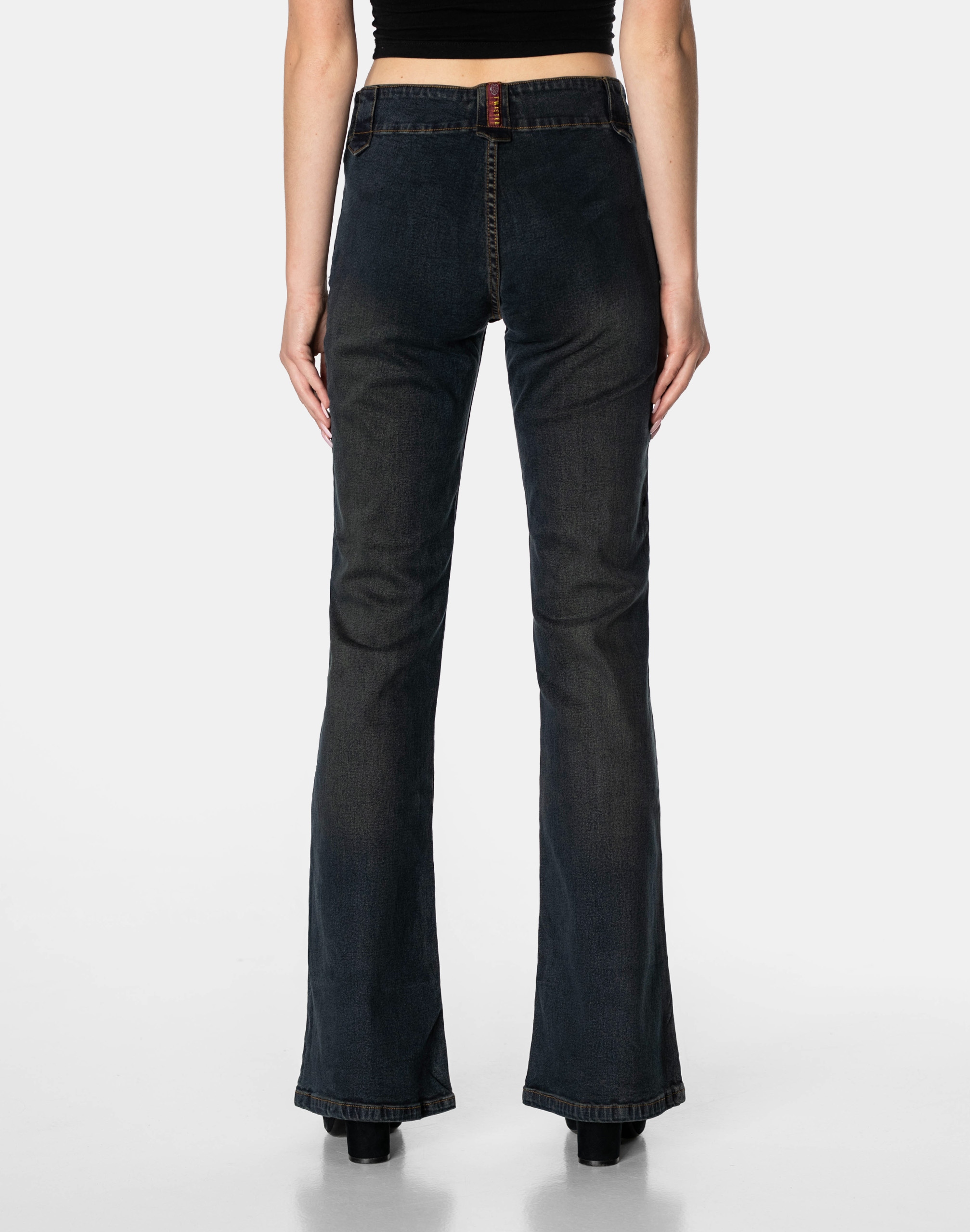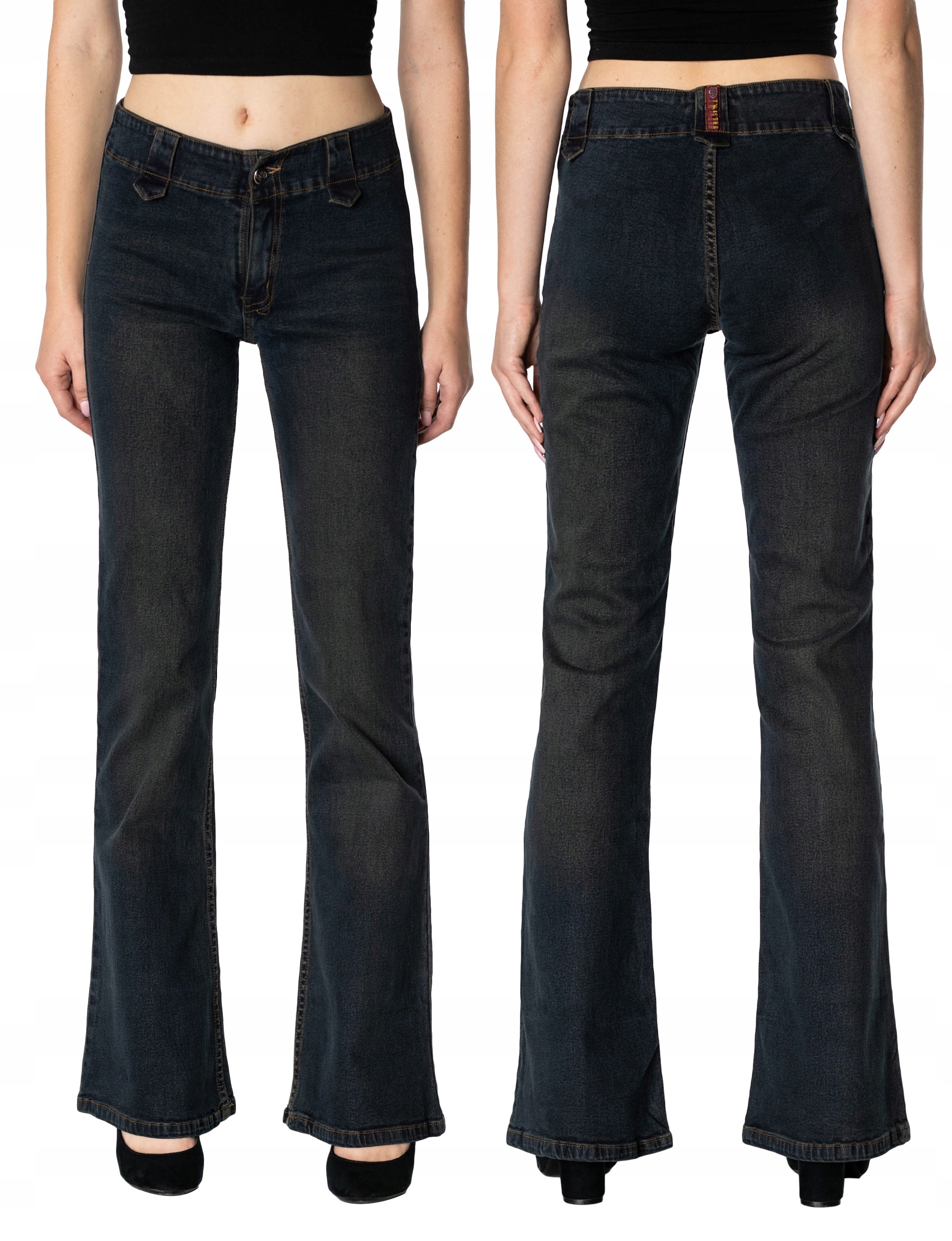 Super modne spodnie firmy TWISTER JEANS COMPANY model 10003 to powracające do łask jeansy typu "dzwony" w kolorze granatowym "Bad Wash" o charakterystycznych dla tego modelu rozszerzających się dołem nogawkach i wyższym stanie "High Rise". Wykonane ze 100% tkaniny bawełnianej typu Denim Jeans, poddanej w procesie produkcji obróbce chemicznej-dekatyzacji celem uzyskania zamierzonego efektu "BAD WASH". Wykorzystując metodę "BAD WASH" uzyskano charakter VIGTAGE czyli celowo postarzone wytarcia i pomięcia spodni w subtelnie szaro-granatowym odcieniu. Zapinane są na kryty zamek błyskawiczny i ozdobny metalowy guzik. W pasie szlufki umożliwiające stylizacje z paskiem. Stan podwyższony "High Rise" zgrabnie modelujący kobiecą sylwetkę w talii. Spodnie uszyte są z wysokiej jakości tkaniny jeansowej delikatnie elastycznej i sprężystej co pozwala na pełną swobodę ruchów, daje komfort przy siadaniu i zapewnia ogromny komfort noszenia.