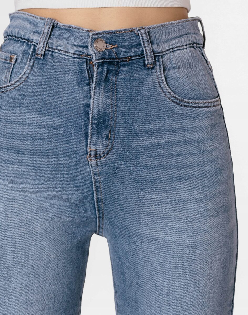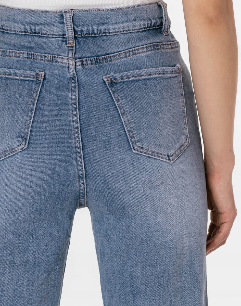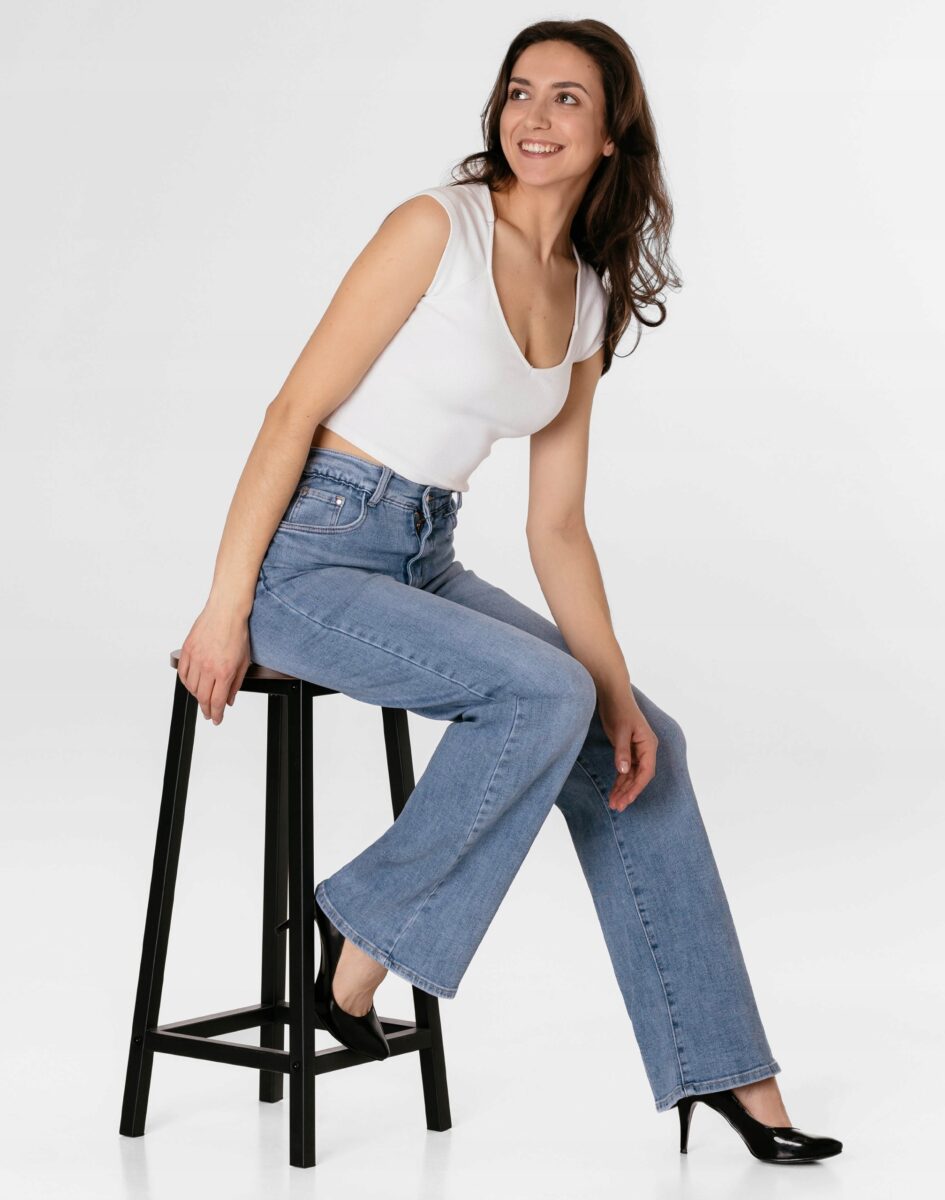 Spodnie model #BQ067 to powracające do łask jeansy damskie typu szwedy/dzwony wide leg w kolorze niebieskim "Light Blue Denim", o charakterystycznych dla tego modelu nogawkach wide, rozszerzających się już od bioder i fabrycznym efektem znoszonego, spranego jeansu "used-look". W procesie produkcji poddane zostały specjalnym zabiegom postarzającym materiał polegającym to na wycieraniu, wielokrotnym wypieraniu barwnika i tworzeniu efektownych pomięć i przetarć. Wykonane z wysokiej jakości gęstej, trwałej i mocnej tkaniny jeansowej "Light Blue Denim" z modnym efektem sprania i przetarciami w nieśmiertelnym stylu "OldVintage". Efektowne rozjaśnienia i wytarcia mają na celu wywołanie tak modnego efektu długo noszonych, spranych jeansów. Niewielki dodatek elastanu (lycra) sprawia, że spodnie są bardziej elastyczne, ładnie dopasowują się do sylwetki i są bardzo komfortowe w użytkowaniu. Łatwo się je zakłada i są znacznie wygodniejsze od jeansów, które lycry nie mają. Poza tym bawełna ma tendencję do kurczenia się w praniu, dlatego lycra sprawia, że spodnie są wyjątkowo praktyczne i można je bez problemu założyć po wysuszeniu. Pozwalają na pełną swobodę ruchów, co daje wygodę przy siadaniu i zapewnia ogromny komfort noszenia. Najmodniejsze w tym sezonie nowoczesne, szerokie nogawki to pomysł na stylizację pozwalającą wyeksponować i podkreślić nogi, wyszczuplić sylwetkę oraz co ważne pięknie układają się w ruchu.