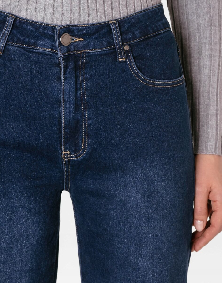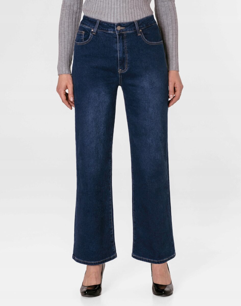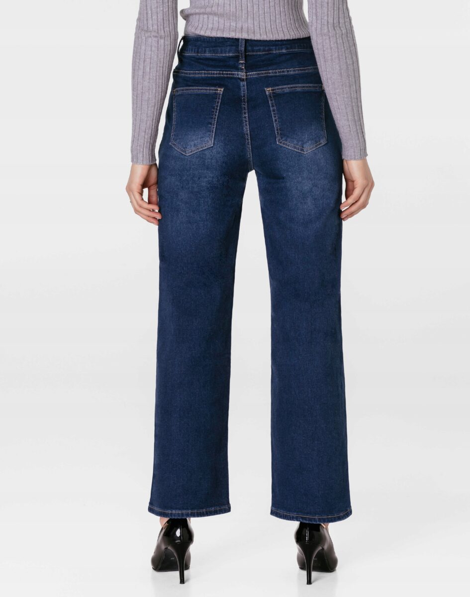 Spodnie model #S5009 to powracające do łask jeansy damskie typu szwedyWide Leg w kolorze granatowym "Dark Blue" z delikatnymi przetarciami, o charakterystycznych dla tego modelu szerokichnogawkach wide, rozszerzających się już od bioder. Wykonane z wysokiej jakości, trwałej i mocnej, tkaniny jeansowej z domieszką lycry (elastan), która odznacza się wysoką sprężystością, co gwarantuje, że spodnie nie będą się deformować i odkształcać nawet po długim użytkowaniu. Niewielki dodatek spandexu (lycra) sprawia, że spodnie są bardziej elastyczne, ładnie dopasowują się do sylwetki i są bardzo komfortowe w użytkowaniu. Łatwo się je zakłada i są znacznie wygodniejsze od jeansów, które lycry nie mają. Poza tym bawełna ma tendencję do kurczenia się w praniu, dlatego lycra sprawia, że spodnie są wyjątkowo praktyczne i można je bez problemu założyć po wysuszeniu. Pozwalają na pełną swobodę ruchów, co daje wygodę przy siadaniu i zapewnia ogromny komfort noszenia.
