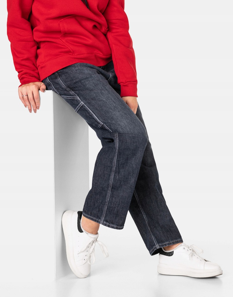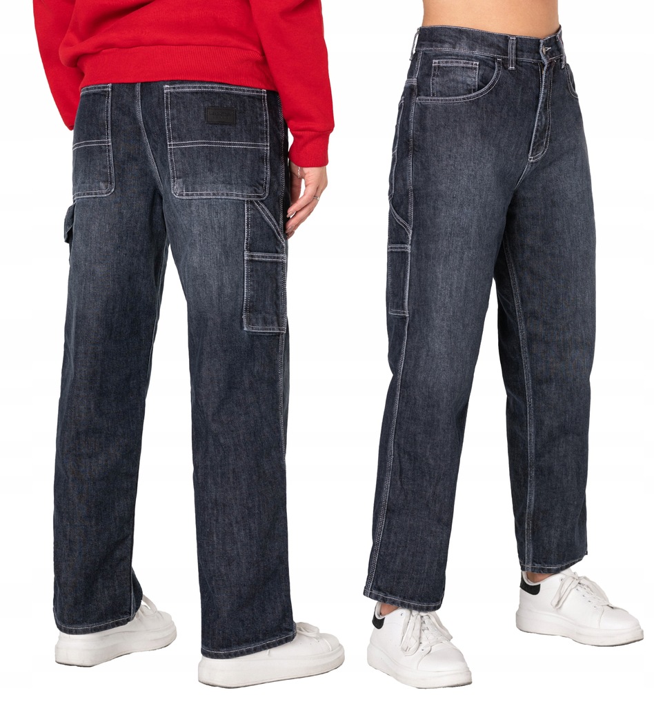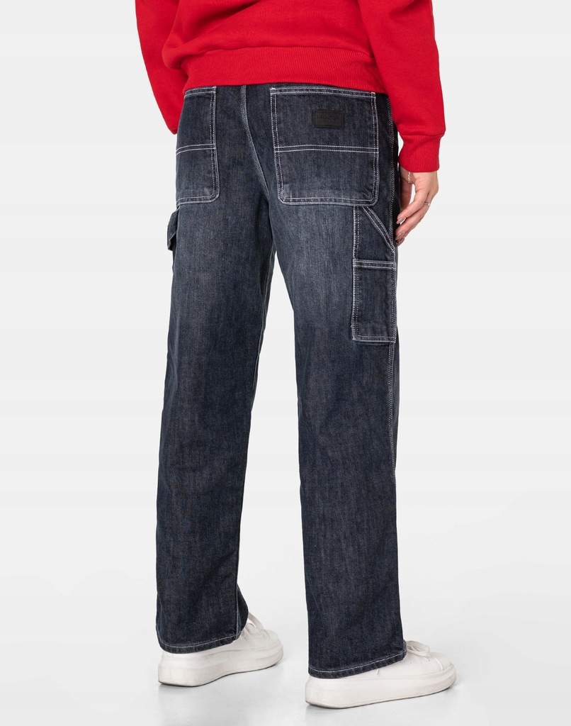 - Kieszenie: dwie wpuszczane kieszenie z przodu + bilonówka, dwie naszywane kieszenie z tyłu spodni, dwie wąskie naszywane kieszenie na prawej nogawce