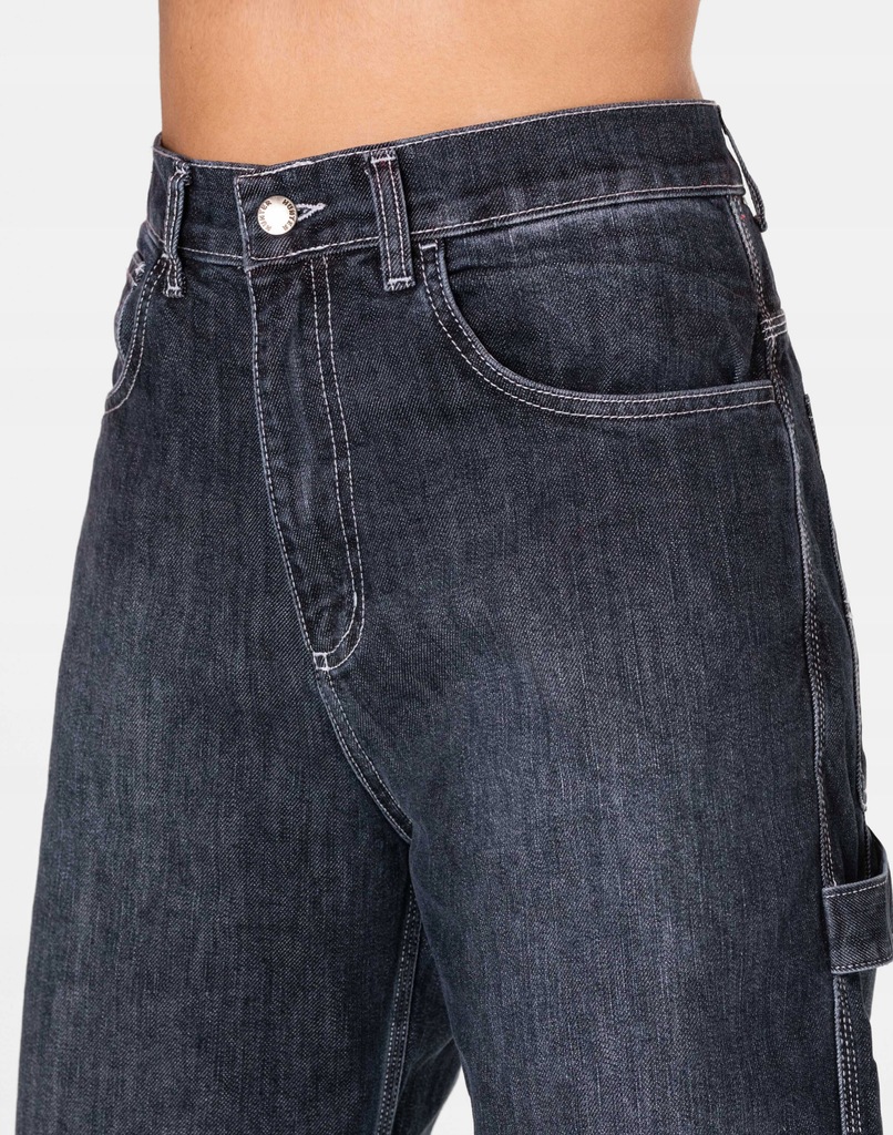 Spodnie model #875 to powracające do łask jeansy damskie typu „szwedy” w kolorze grafitowy „Grey Denim” z przetarciami, o charakterystycznych dla tego modelu nogawkach rozszerzających się już od bioder. Zapinane są na kryty zamek błyskawiczny i metalowy guzik sygnowany logiem firmy. Z przodu mają dwie zaokrąglone kieszonki, oraz mniejszą tzw. bilonówkę. Na tyle klasyczne kieszenie naszywane jak w typowych spodniach jeansowych. Na prawej nogawce dwie wąskie naszywane kieszenie. W pasie szlufki umożliwiające stylizacje z paskiem. Stan podwyższony „High Rise” zgrabnie modelujący sylwetkę w talii. Najbardziej podatne na uszkodzenia miejsca wzmocnione są dodatkowymi przeszyciami.