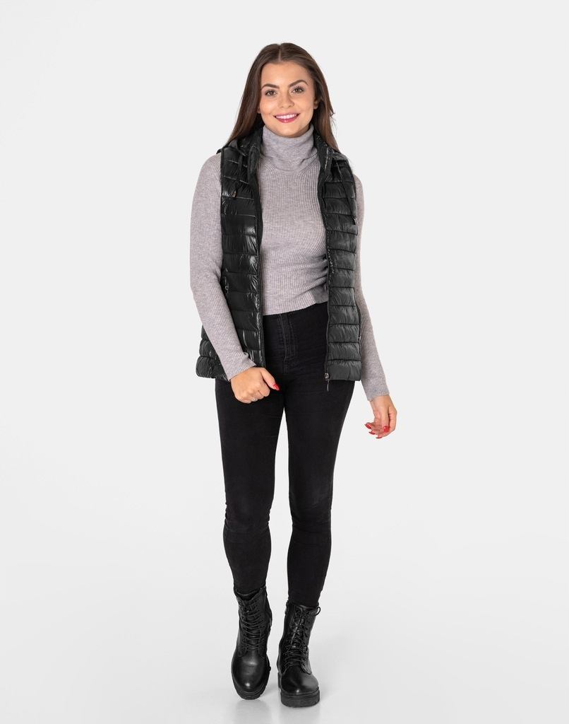 Kamizelka jest zgrabnie taliowana, efektownie pikowana (aby w powstałych „kieszonkach” zmieścić jak najwięcej grzejącego surowca), zasuwana na zamek błyskawiczny i ocieplona w całości puchem syntetycznym. Posiada dwie wpuszczane kieszenie na dłonie zasuwane na zamki błyskawiczne oraz wysoki, ocieplony kołnierz/stójkę, który zasłania szyję i chroni gardło a często zastępuje nawet szalik co jest bardzo wygodne. Odpinany na zamek, regulowany w 3D za pomocą taśmy ściągającej, ocieplony puchem syntetycznym kaptur, skutecznie osłoni Twoją głowę przed deszczem, wiatrem i chłodem. Długość do bioder, która świetnie podkreśli elegancję i kobiecość w twoim wyglądzie, a jednocześnie trzyma ciepło i przytulność przy mroźnej pogodzie. Nie krępuje ruchów i z powodzeniem zakrywa części ciała wrażliwe na chłód jak plecy na wysokości nerek. Materiał zewnętrzny jest wiatroszczelny i posiada wykończenie typu Water Repellency, które zapobiega nasączeniu warstwy zewnętrznej wodą. Wewnętrzna strona kamizelki wykończona jest materiałową podszewką.