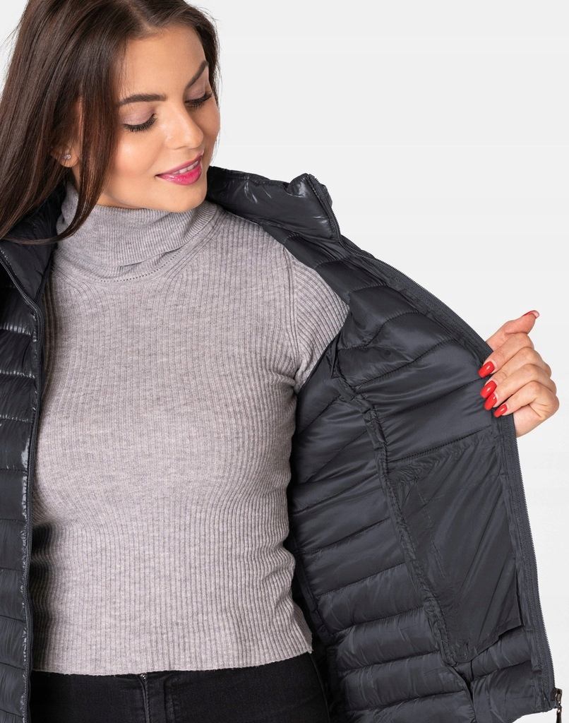 Kamizelka jest zgrabnie taliowana, efektownie pikowana (aby w powstałych „kieszonkach” zmieścić jak najwięcej grzejącego surowca), zasuwana na zamek błyskawiczny i ocieplona w całości puchem syntetycznym. Posiada dwie wpuszczane kieszenie na dłonie zasuwane na zamki błyskawiczne oraz wysoki, ocieplony kołnierz/stójkę, który zasłania szyję i chroni gardło a często zastępuje nawet szalik co jest bardzo wygodne. Odpinany na zamek, regulowany w 3D za pomocą taśmy ściągającej, ocieplony puchem syntetycznym kaptur, skutecznie osłoni Twoją głowę przed deszczem, wiatrem i chłodem. Długość do bioder, która świetnie podkreśli elegancję i kobiecość w twoim wyglądzie, a jednocześnie trzyma ciepło i przytulność przy mroźnej pogodzie. Nie krępuje ruchów i z powodzeniem zakrywa części ciała wrażliwe na chłód jak plecy na wysokości nerek. Materiał zewnętrzny jest wiatroszczelny i posiada wykończenie typu Water Repellency, które zapobiega nasączeniu warstwy zewnętrznej wodą. Wewnętrzna strona kamizelki wykończona jest materiałową podszewką.