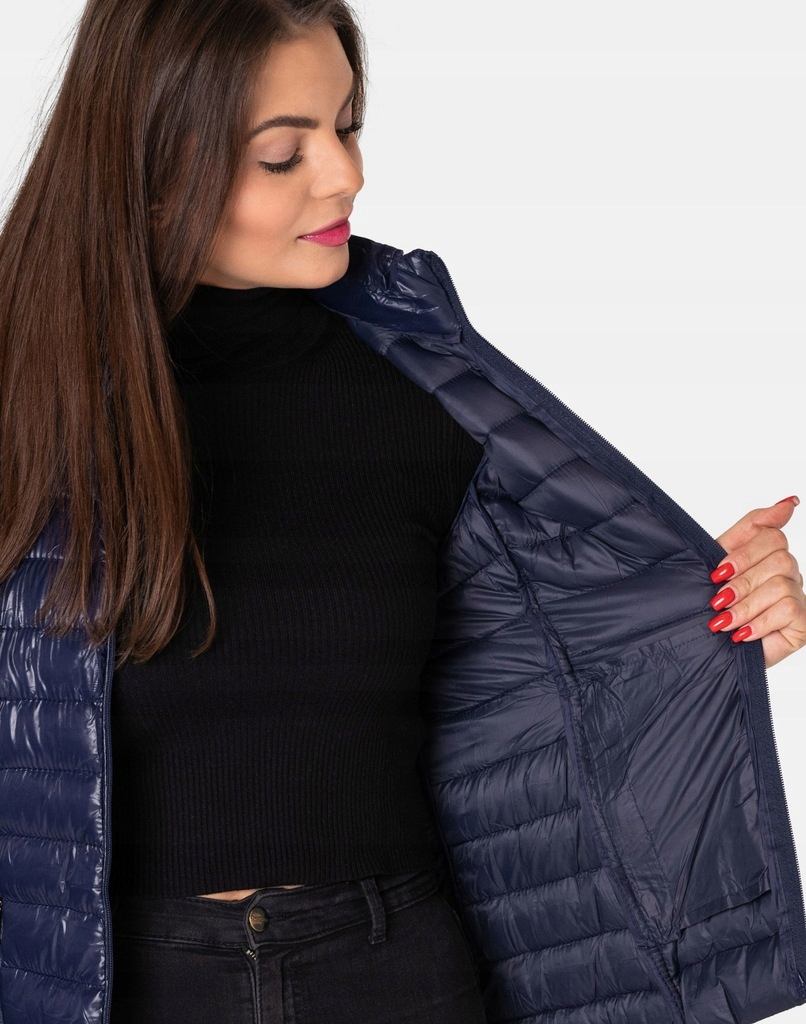 Kamizelka jest zgrabnie taliowana, efektownie pikowana (aby w powstałych „kieszonkach” zmieścić jak najwięcej grzejącego surowca), zasuwana na zamek błyskawiczny i ocieplona w całości puchem syntetycznym. Posiada dwie wpuszczane kieszenie na dłonie zasuwane na zamki błyskawiczne oraz wysoki, ocieplony kołnierz/stójkę, który zasłania szyję i chroni gardło a często zastępuje nawet szalik co jest bardzo wygodne. Odpinany na zamek, regulowany w 3D za pomocą taśmy ściągającej, ocieplony puchem syntetycznym kaptur, skutecznie osłoni Twoją głowę przed deszczem, wiatrem i chłodem. Długość do bioder, która świetnie podkreśli elegancję i kobiecość w twoim wyglądzie, a jednocześnie trzyma ciepło i przytulność przy mroźnej pogodzie. Nie krępuje ruchów i z powodzeniem zakrywa części ciała wrażliwe na chłód jak plecy na wysokości nerek. Materiał zewnętrzny jest wiatroszczelny i posiada wykończenie typu Water Repellency, które zapobiega nasączeniu warstwy zewnętrznej wodą. Wewnętrzna strona kamizelki wykończona jest materiałową podszewką.