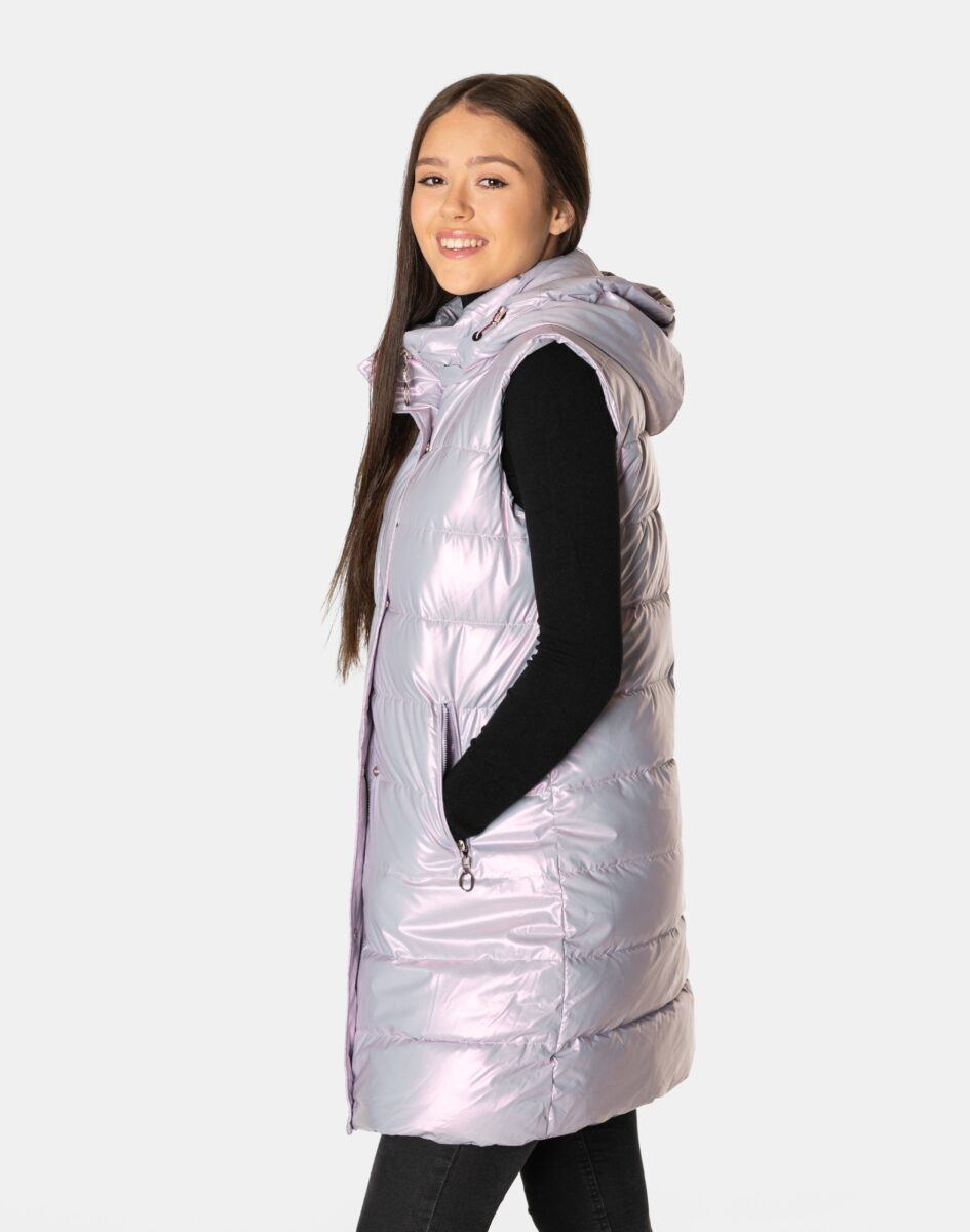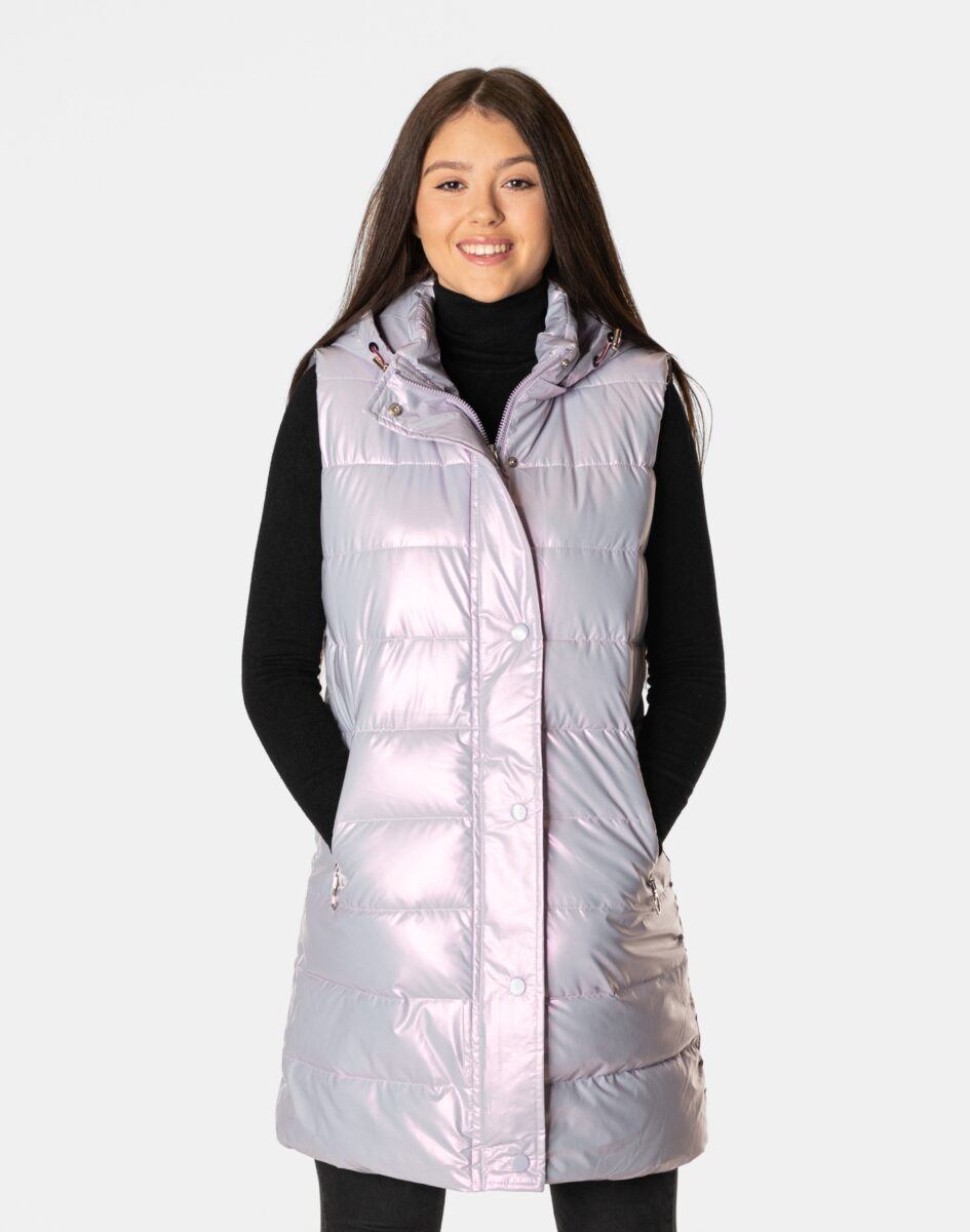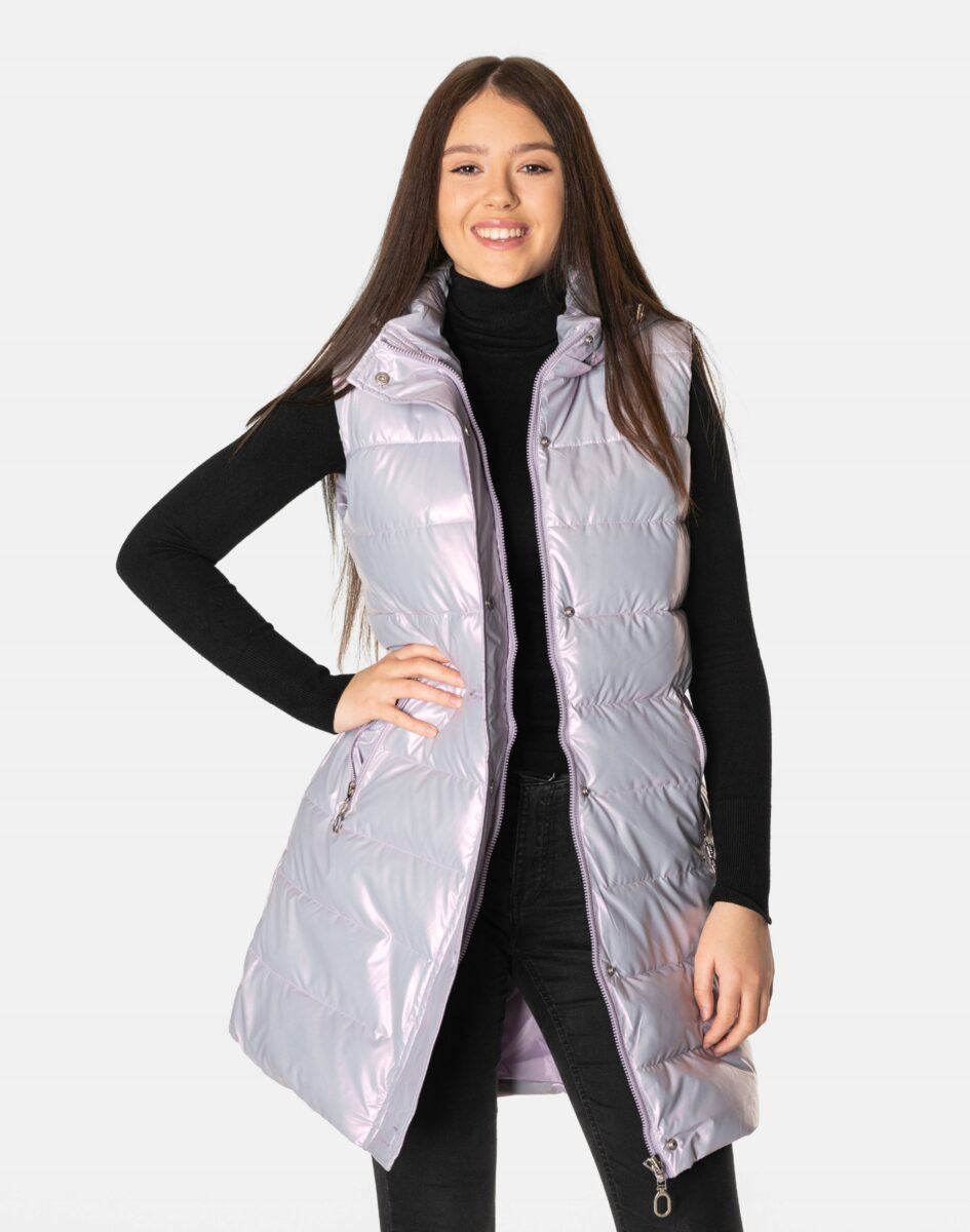 Kamizelka jest zgrabnie taliowana, efektownie pikowana (aby w powstałych „kieszonkach” zmieścić jak najwięcej grzejącego surowca), zasuwana na zamek błyskawiczny kryty plisą zapinaną na napy i ocieplona w całości puchem syntetycznym. Posiada dwie wpuszczane kieszenie na dłonie zasuwane na zamki błyskawiczne oraz wysoki kołnierz/stójkę który zasłania szyję i chroni gardło a często zastępuje nawet szalik co jest bardzo wygodne i skutecznie chroni przed zimnem i wiatrem. Odpinany na zamek, regulowany w 3D i ocieplony puchem kaptur osłoni Twoją głowę przed deszczem, wiatrem i chłodem. Długość do połowy uda, która świetnie podkreśli elegancję i kobiecość w twoim wyglądzie, a jednocześnie trzyma ciepło i przytulność przy mroźnej pogodzie. Nie krępuje ruchów i z powodzeniem zakrywa części ciała wrażliwe na chłód jak plecy na wysokości nerek, nogi i pośladki. Materiał zewnętrzny jest wiatroszczelny i posiada wykończenie typu Water Repellency, które zapobiega nasączeniu warstwy zewnętrznej wodą. Wewnętrzna strona kamizelki wykończona jest materiałową podszewką.