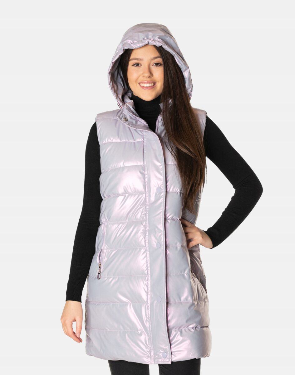 Długa Ciepła Kamizelka Damska Wodoodporna i Wiatroszczelna z Kapturem i Modnym Połyskiem