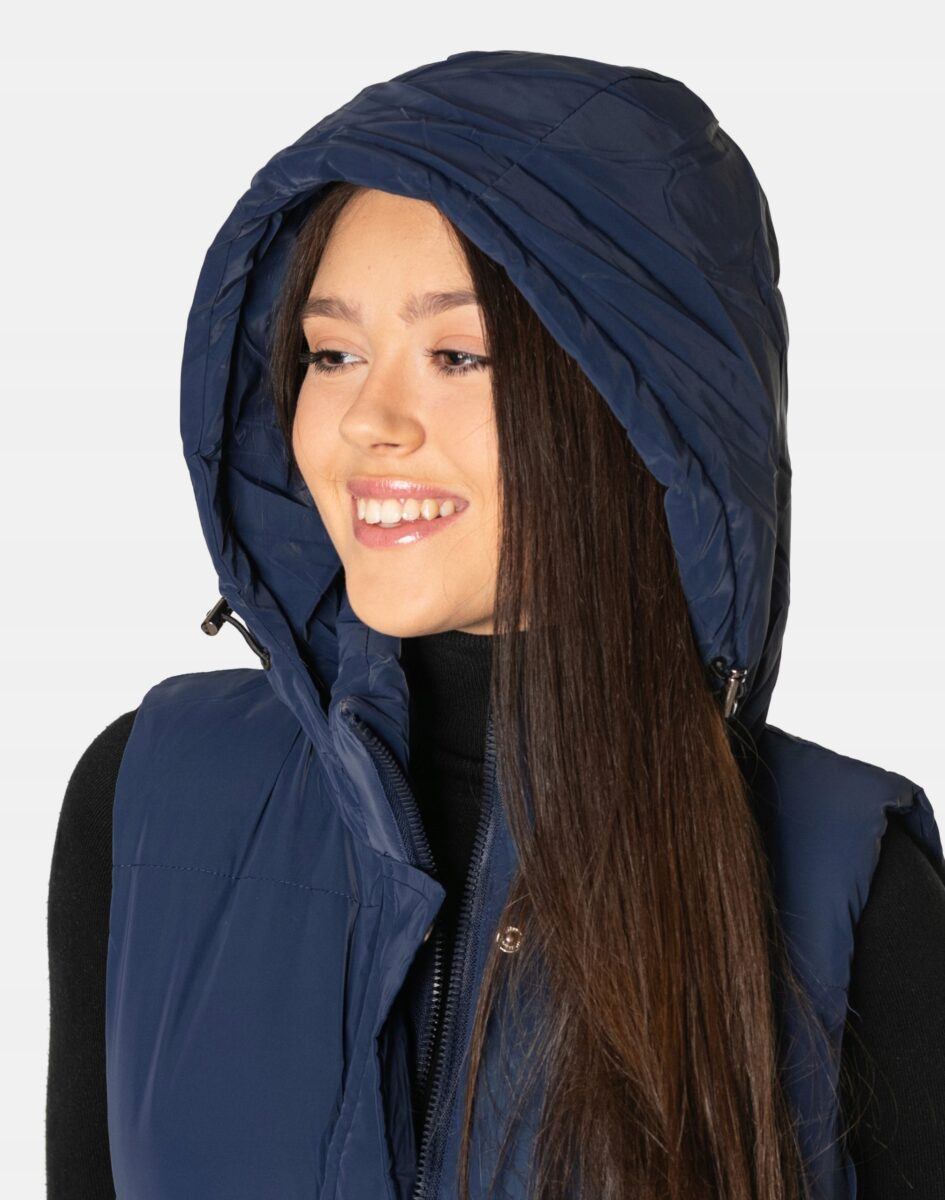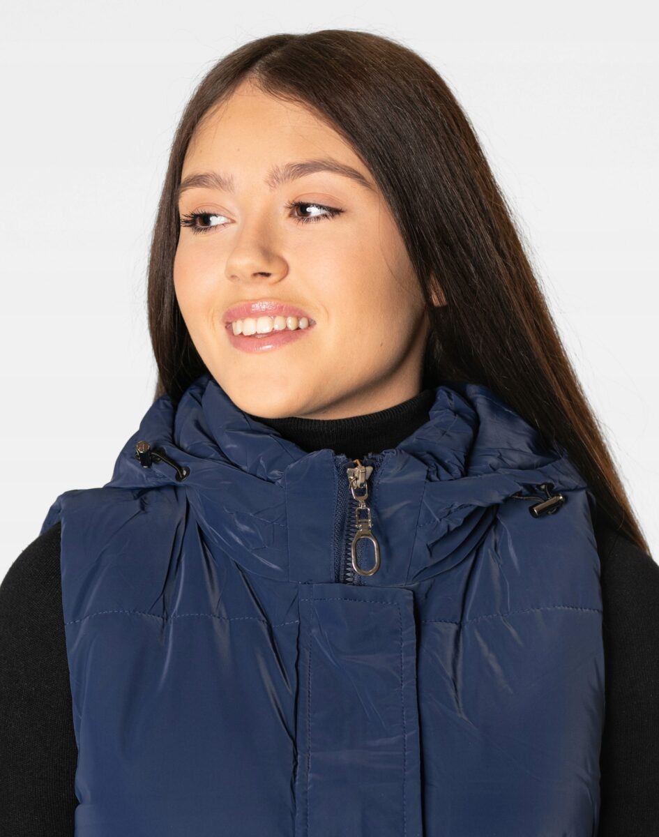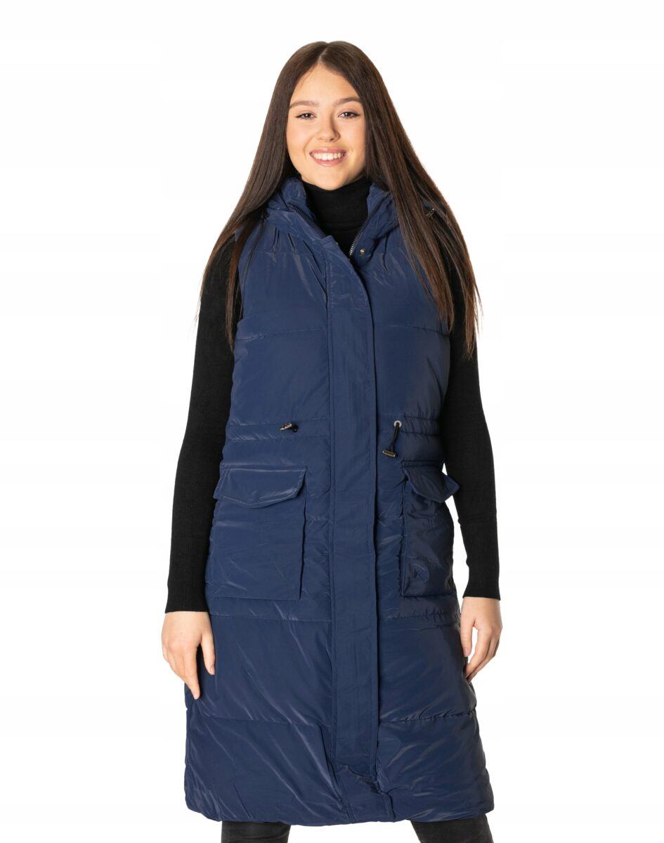 Kamizelka jest zgrabnie taliowana, efektownie pikowana (aby w powstałych „kieszonkach” zmieścić jak najwięcej grzejącego surowca), zasuwana na zamek błyskawiczny kryty plisą zapinaną na napy i ocieplona w całości puchem syntetycznym. Posiada dwie duże naszywane kieszenie na dłonie kryte patkami zapinanymi na napy oraz wysoki kołnierz/stójkę który zasłania szyję i chroni gardło a często zastępuje nawet szalik co jest bardzo wygodne i skutecznie chroni przed zimnem i wiatrem. Zintegrowany, regulowany w 3D i ocieplony puchem kaptur osłoni Twoją głowę przed deszczem, wiatrem i chłodem. Długość do kolan, która świetnie podkreśli elegancję i kobiecość w twoim wyglądzie, a jednocześnie trzyma ciepło i przytulność przy mroźnej pogodzie. Nie krępuje ruchów i z powodzeniem zakrywa części ciała wrażliwe na chłód jak plecy na wysokości nerek, nogi i pośladki. Elastyczny ściągacz regulacyjny ze stoperami wszyty w pasie pozwala na precyzyjne dopasowanie kamizelki do ciała, co znacznie zapobiega utracie ciepła i zgrabnie modeluje sylwetkę w talii nadając jej właściwe proporcje. Materiał zewnętrzny jest wiatroszczelny i posiada wykończenie typu Water Repellency, które zapobiega nasączeniu warstwy zewnętrznej wodą. Wewnętrzna strona kamizelki wykończona jest materiałową podszewką.