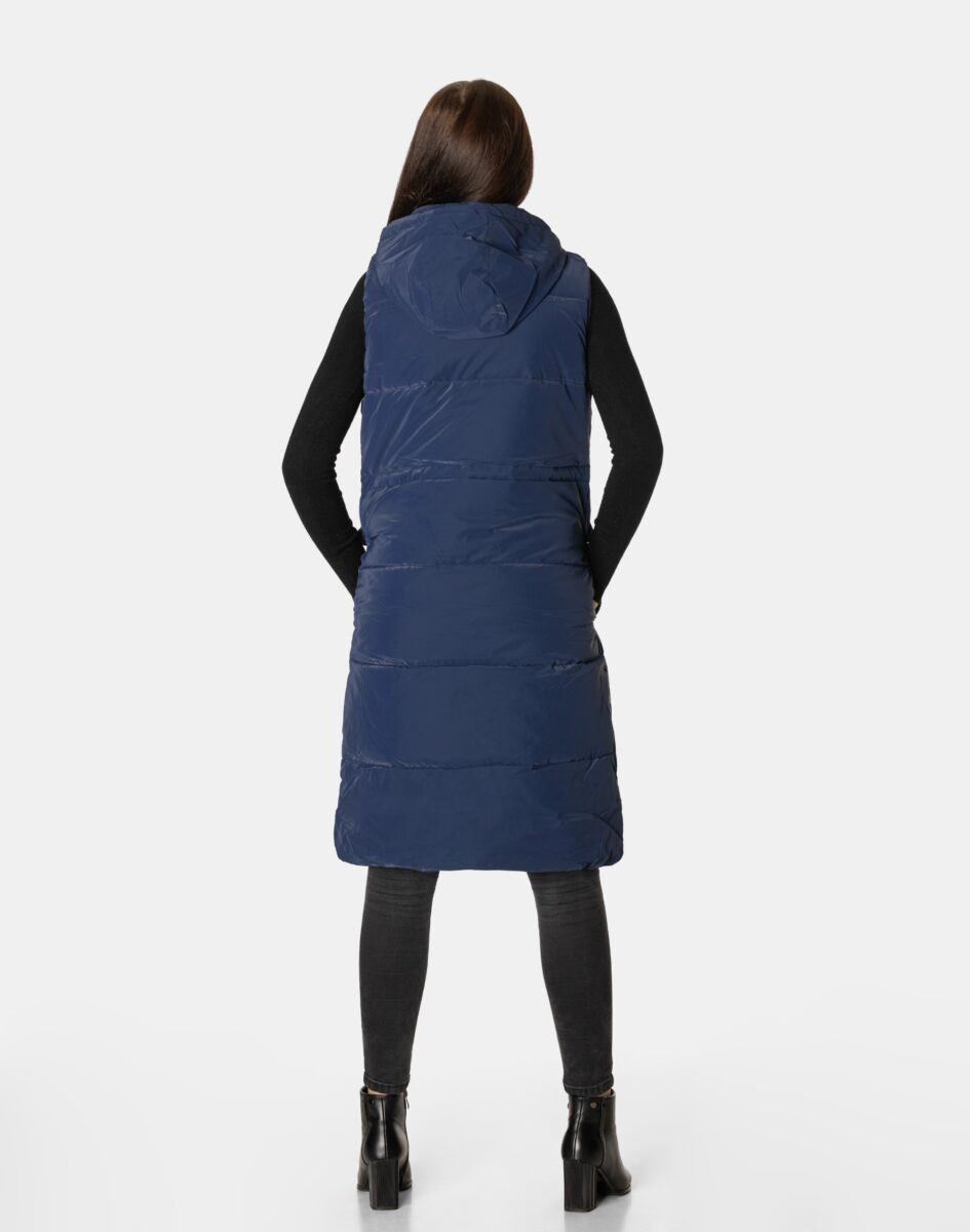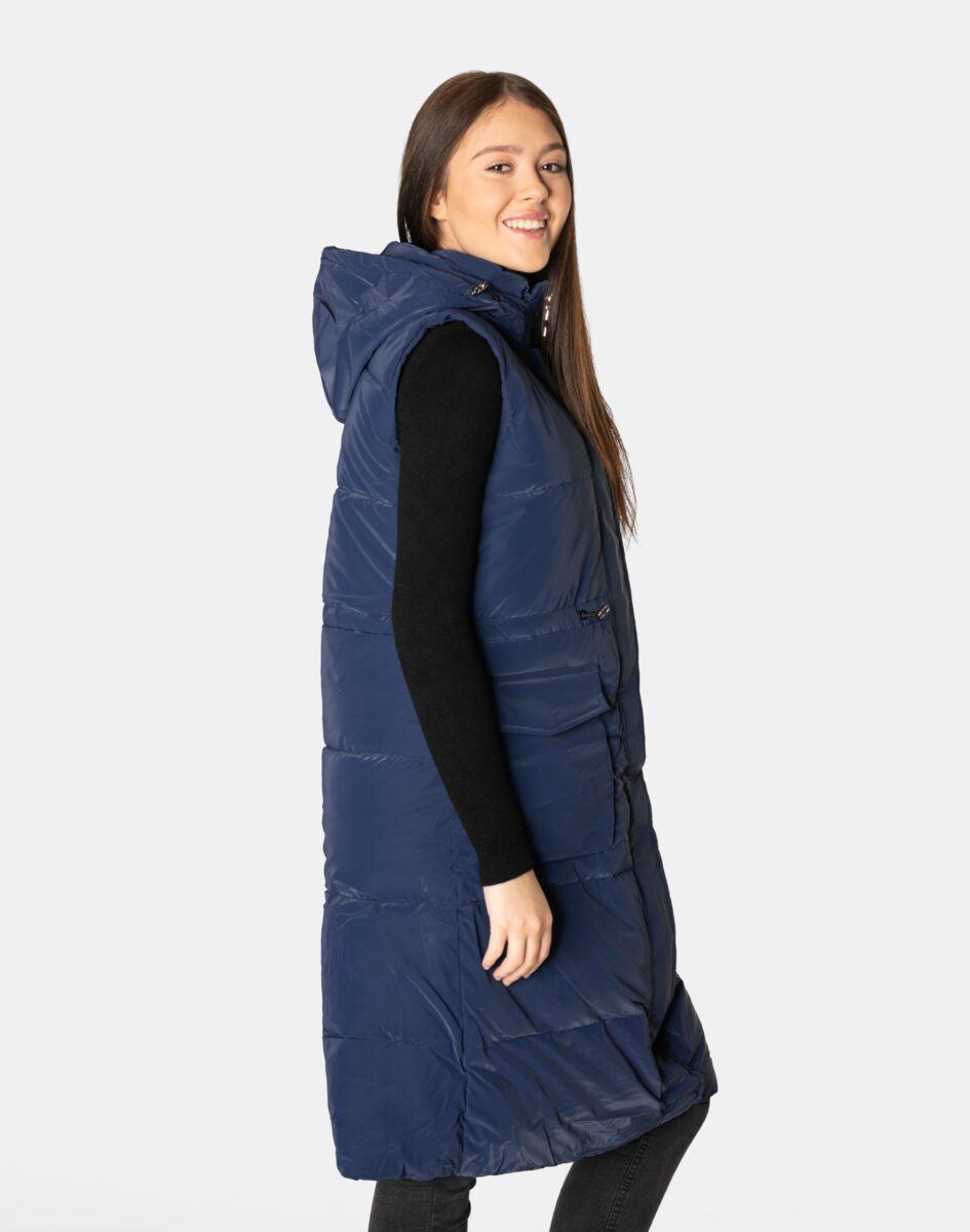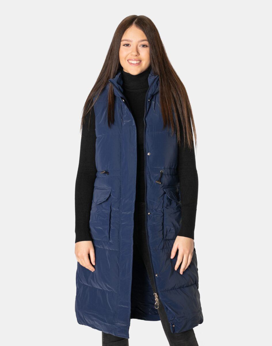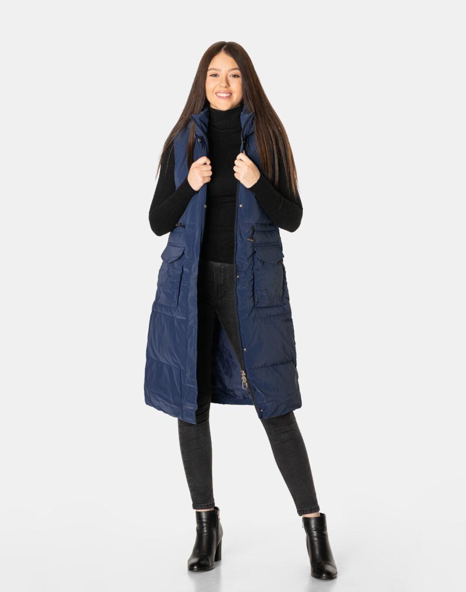 Kamizelka jest zgrabnie taliowana, efektownie pikowana (aby w powstałych „kieszonkach” zmieścić jak najwięcej grzejącego surowca), zasuwana na zamek błyskawiczny kryty plisą zapinaną na napy i ocieplona w całości puchem syntetycznym. Posiada dwie duże naszywane kieszenie na dłonie kryte patkami zapinanymi na napy oraz wysoki kołnierz/stójkę który zasłania szyję i chroni gardło a często zastępuje nawet szalik co jest bardzo wygodne i skutecznie chroni przed zimnem i wiatrem. Zintegrowany, regulowany w 3D i ocieplony puchem kaptur osłoni Twoją głowę przed deszczem, wiatrem i chłodem. Długość do kolan, która świetnie podkreśli elegancję i kobiecość w twoim wyglądzie, a jednocześnie trzyma ciepło i przytulność przy mroźnej pogodzie. Nie krępuje ruchów i z powodzeniem zakrywa części ciała wrażliwe na chłód jak plecy na wysokości nerek, nogi i pośladki. Elastyczny ściągacz regulacyjny ze stoperami wszyty w pasie pozwala na precyzyjne dopasowanie kamizelki do ciała, co znacznie zapobiega utracie ciepła i zgrabnie modeluje sylwetkę w talii nadając jej właściwe proporcje. Materiał zewnętrzny jest wiatroszczelny i posiada wykończenie typu Water Repellency, które zapobiega nasączeniu warstwy zewnętrznej wodą. Wewnętrzna strona kamizelki wykończona jest materiałową podszewką.