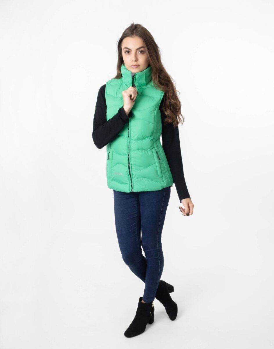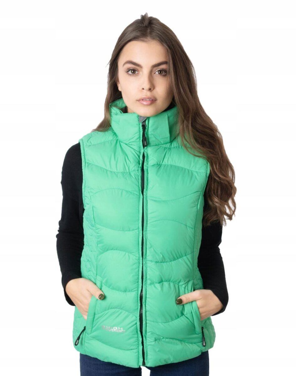 Kamizelka jest wyjątkowo ciepła bo ocieplona w całości puchem syntetycznym. Materiał zewnętrzny jest wiatroszczelny (WINDPROOF maximum ), wodoodporny (WATERPROOF 20000mm watercolumn ) i oddychający (BREATHABLE 20000g/m2/24h). Wewnętrzna strona kamizelki wykończona jest materiałową podszewką. Modny krój pikowanych paneli z pionowymi przeszyciami na bokach powoduje optyczne wyszczuplenie damskiej sylwetki. Talia zgrabnie podkreślona, doskonale wyprofilowana konstrukcja prezentowana obecnie szeroko na modowych blogach