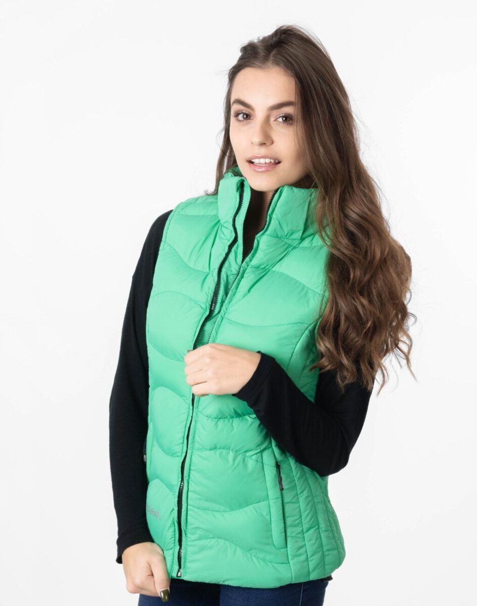 Kamizelka jest wyjątkowo ciepła bo ocieplona w całości puchem syntetycznym. Materiał zewnętrzny jest wiatroszczelny (WINDPROOF maximum ), wodoodporny (WATERPROOF 20000mm watercolumn ) i oddychający (BREATHABLE 20000g/m2/24h). Wewnętrzna strona kamizelki wykończona jest materiałową podszewką. Modny krój pikowanych paneli z pionowymi przeszyciami na bokach powoduje optyczne wyszczuplenie damskiej sylwetki. Talia zgrabnie podkreślona, doskonale wyprofilowana konstrukcja prezentowana obecnie szeroko na modowych blogach