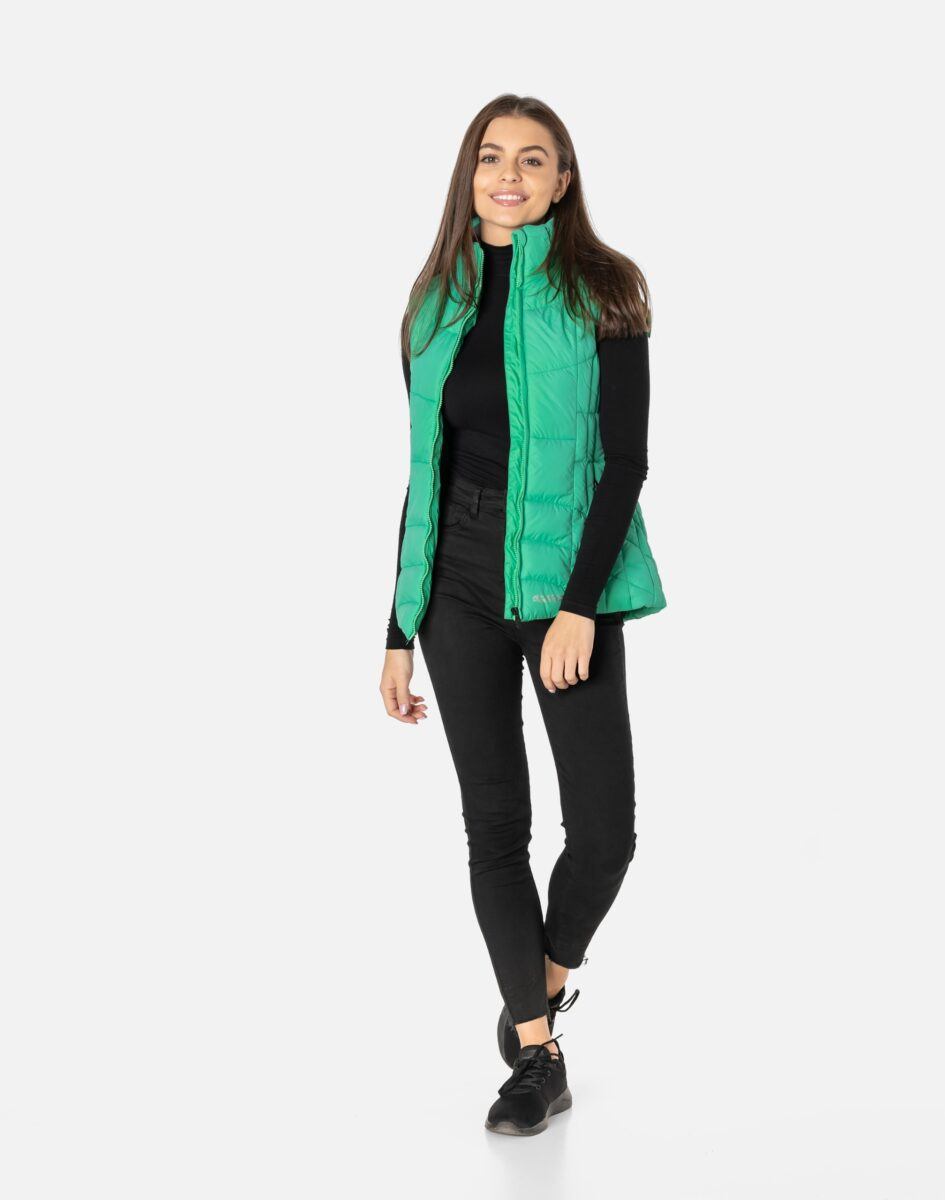 Kamizelka jest wyjątkowo ciepła bo ocieplona w całości puchem syntetycznym. Materiał zewnętrzny jest wiatroszczelny (WINDPROOF maximum ), wodoodporny (WATERPROOF 20000mm watercolumn ) i oddychający (BREATHABLE 20000g/m2/24h). Modny krój pikowanych paneli z pionowymi przeszyciami na bokach powoduje optyczne wyszczuplenie damskiej sylwetki. Talia zgrabnie podkreślona, doskonale wyprofilowana konstrukcja prezentowana obecnie szeroko na modowych blogach.
