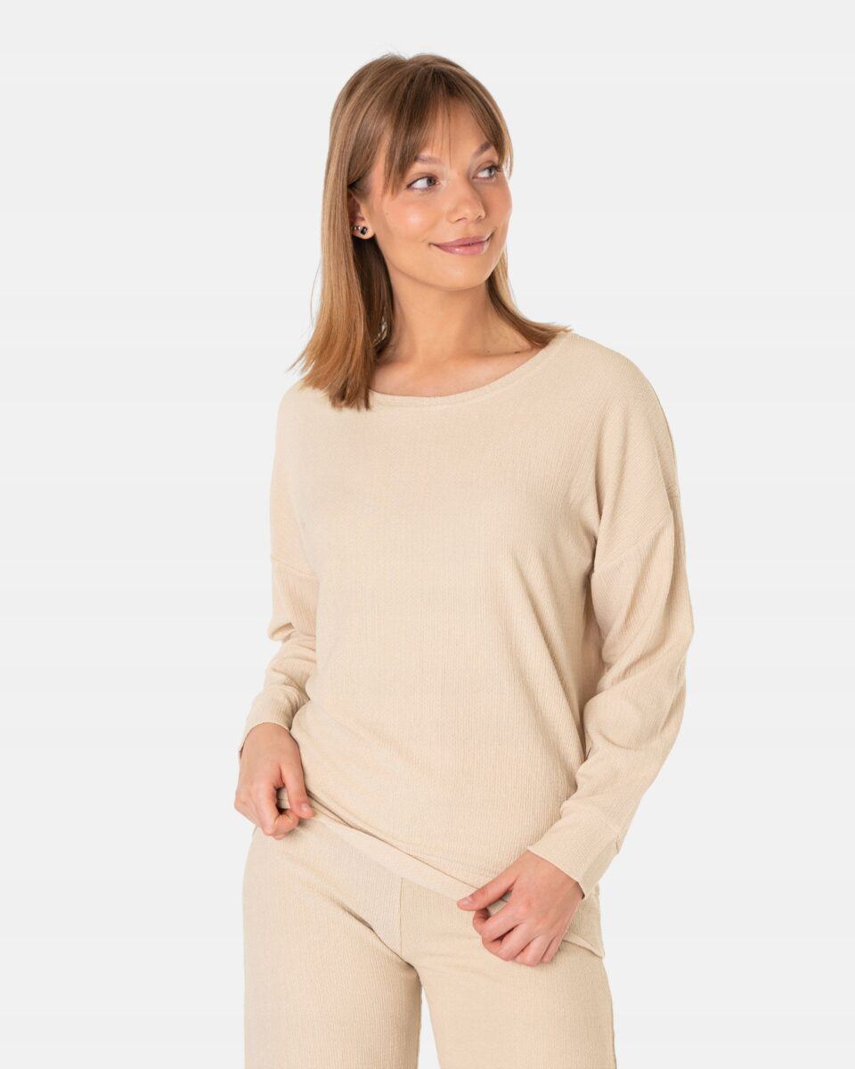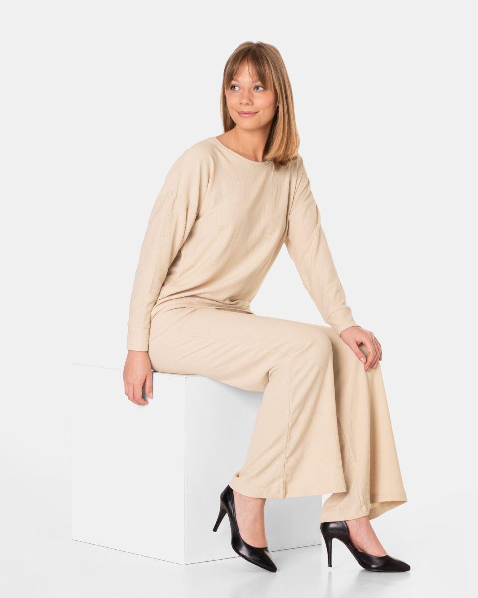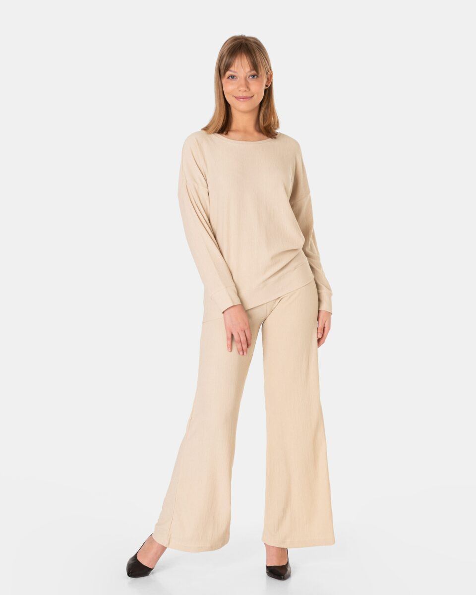 Wygodny, cienki komplet bawełniany damski składający się z luźnej bluzki i wygodnych spodni z szerokimi, luźnymi nogawkami to jeden z najczęściej wybieranych na ciepłe i gorące dni wiosny i lata model eleganckiej odzieży. Wykonany z wysokiej jakości cienkiej i oddychającej dzianiny bawełnianej o jednolitym wybarwieniu i delikatnej, prążkowanej strukturze. Odpowiedni na wysokie temperatury luźny krój nie ogranicza swobody ruchów, a niewielka gramatura tkaniny (220 g/m2) pozytywnie wpływa na komfort użytkowania. Z założenia wyróżnia się dużą wygodą a dopasowanie w pasie zapewnia szeroki, elastyczny pas ściągający zgrabnie modelujący sylwetkę w talii. Zapewnia poczucie atrakcyjności przy jednoczesnym zachowaniu komfortu, wygody i pełnej swobody ruchów a sylwetka wygląda w nim niezwykle.