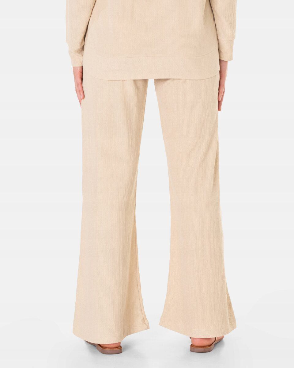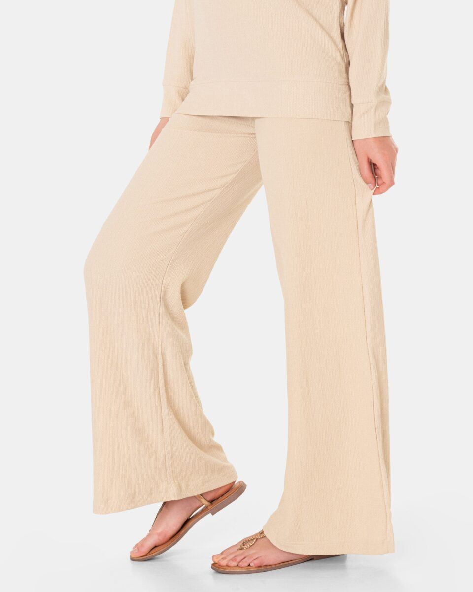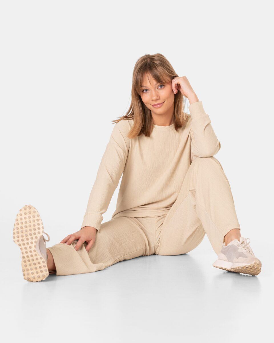 Wygodny, cienki komplet bawełniany damski składający się z luźnej bluzki i wygodnych spodni z szerokimi, luźnymi nogawkami to jeden z najczęściej wybieranych na ciepłe i gorące dni wiosny i lata model eleganckiej odzieży. Wykonany z wysokiej jakości cienkiej i oddychającej dzianiny bawełnianej o jednolitym wybarwieniu i delikatnej, prążkowanej strukturze. Odpowiedni na wysokie temperatury luźny krój nie ogranicza swobody ruchów, a niewielka gramatura tkaniny (220 g/m2) pozytywnie wpływa na komfort użytkowania. Z założenia wyróżnia się dużą wygodą a dopasowanie w pasie zapewnia szeroki, elastyczny pas ściągający zgrabnie modelujący sylwetkę w talii. Zapewnia poczucie atrakcyjności przy jednoczesnym zachowaniu komfortu, wygody i pełnej swobody ruchów a sylwetka wygląda w nim niezwykle.