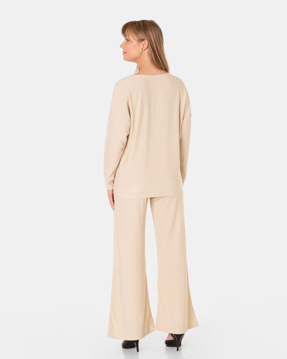 Komplet to esencja kobiecości. Fason bluzki dodaje stylizacji nowoczesnego akcentu, pozwalając jednocześnie na swobodę ruchów. Szerokie nogawki spodni optycznie wydłużają sylwetkę, a delikatny i uniwersalny wzór tkaniny sprawia, że komplet świetnie sprawdzi się zarówno w codziennych zestawach, jak i podczas bardziej uroczystych okazji. W połączeniu z eleganckimi mokasynami lub szpilkami i minimalistyczną biżuterią stworzysz look, który zachwyci na spotkaniu biznesowym, natomiast połączony z sandałkami na obcasie i torebką kopertówką, idealnie dopełni wieczorowy outfit.