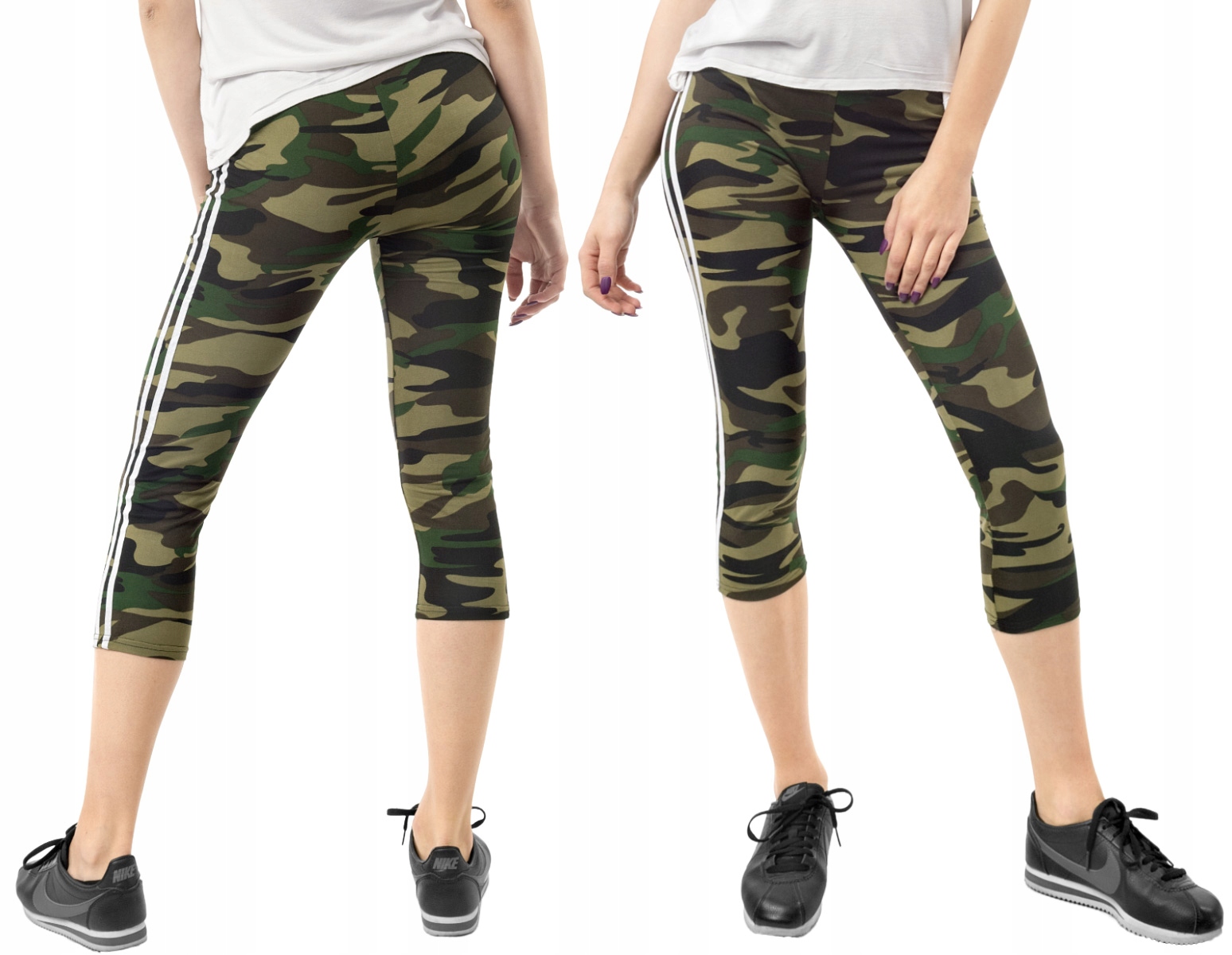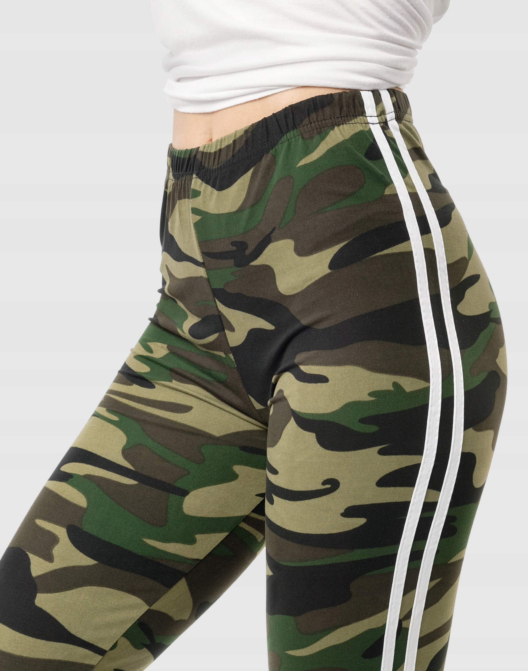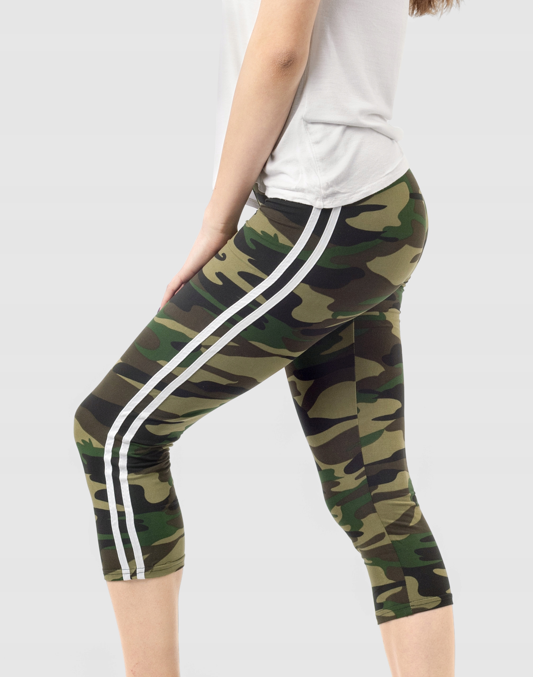 Legginsy sportowe damskie w najmodniejszym w tym sezonie wzorze moro CAMO dla fanek militarnego stylu sport-casual, to komfortowo skrojony model z wysoką elastyczną talią i wąską, dopasowaną nogawką 3/4. Nogawki spodni ozdobione kontrastowymi lampasami to aktualnie jeden z największych hitów i co najważniejsze optycznie wysmuklają i wydłużają nogi. Z założenia wyróżniają się dużą wygodą a dopasowanie w pasie zapewnia szeroki, elastyczny pas ściągający. Materiał charakteryzuje się dużą elastycznością oraz rozciągliwością w czterech kierunkach zapewniając doskonałe dopasowanie spodni do sylwetki. Nie mają żadnego zamka, guzików ani niewygodnych szwów a tkanina jest na tyle gruba, że nie widać przez nią bielizny. Trwałe i elastyczne wykończenie spodni (użycie do produkcji elastycznych nici) gwarantuje komfort i wygodę ich użytkownikowi w każdych warunkach. Możesz w nich chodzić na co dzień, idealnie nadają się również do uprawiania różnych dyscyplin sportu i rekreacji. Doskonale sprawdzą się zarówno na wycieczkach, spacerach, zajęciach w klubach fitness i na siłowni, podczas joggingu w parku, jak i w domowym zaciszu przy telewizorze.