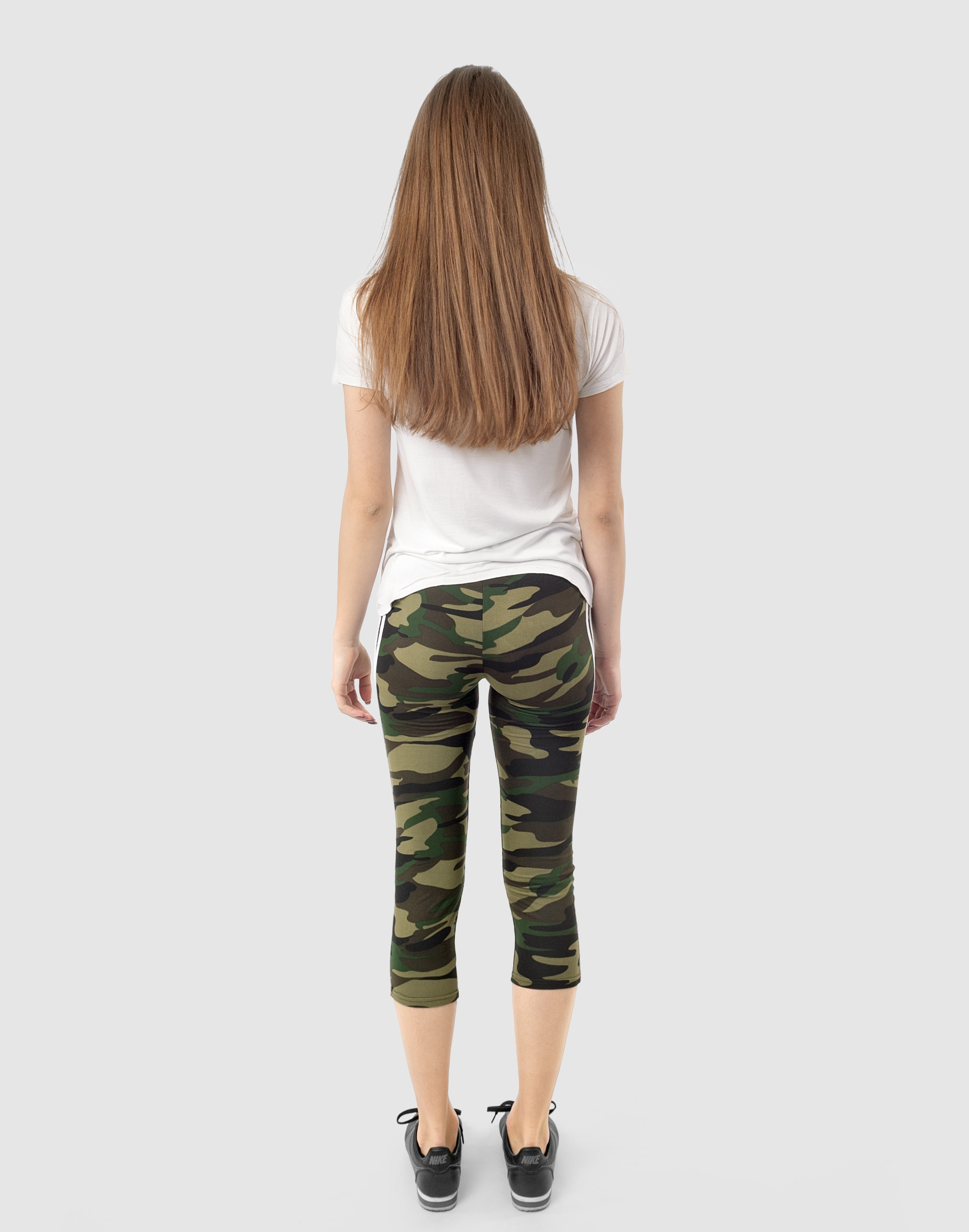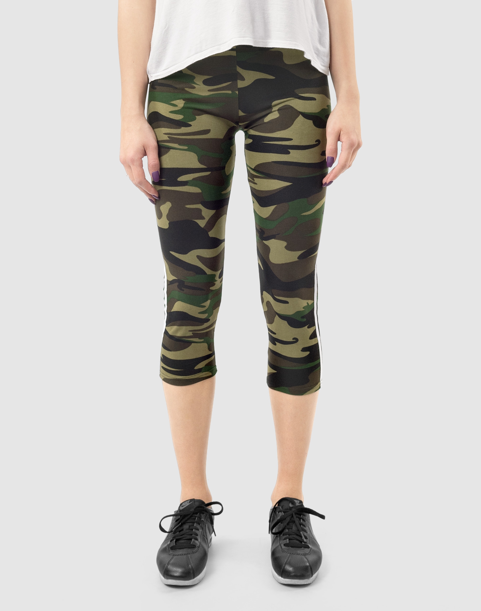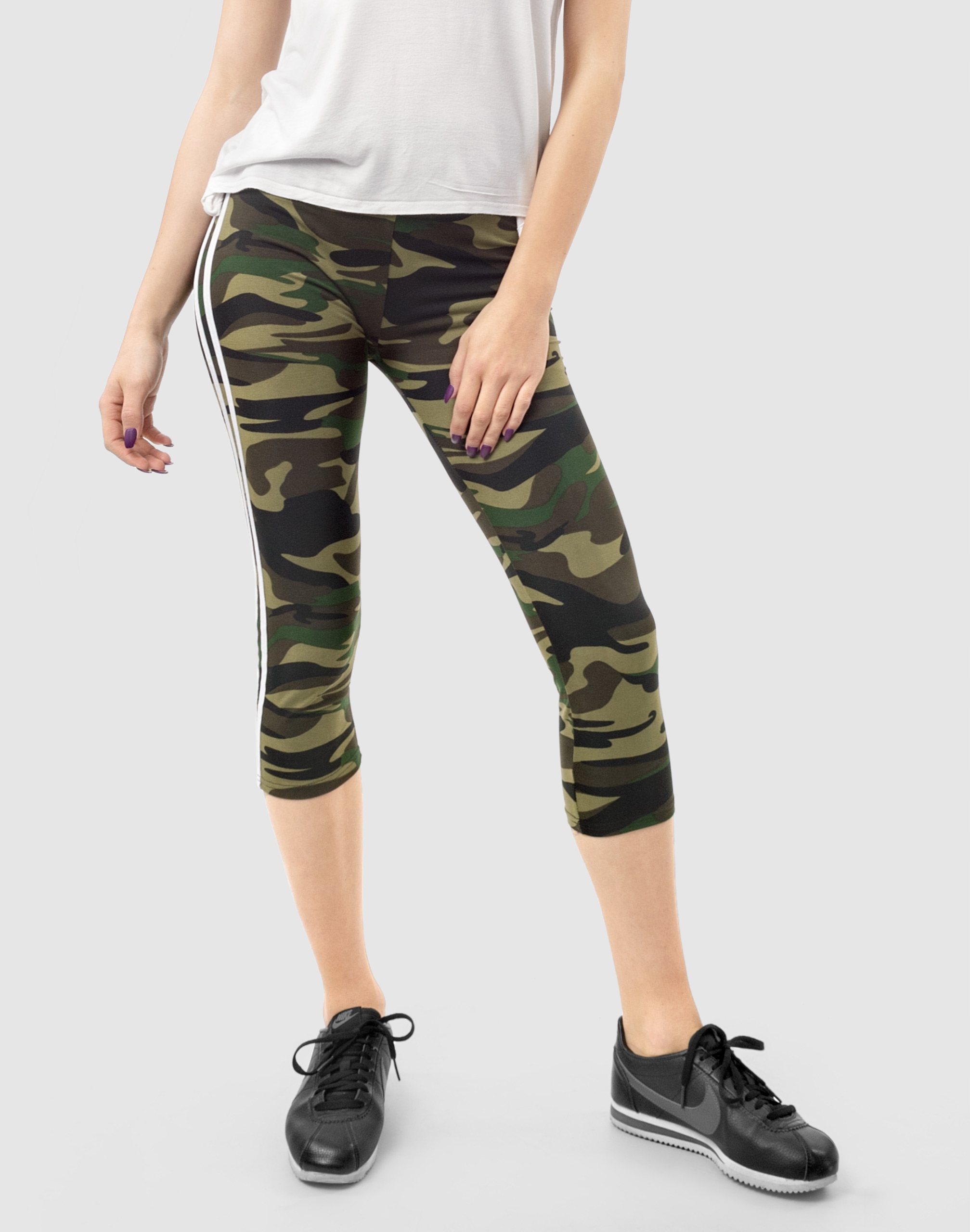 Legginsy sportowe damskie w najmodniejszym w tym sezonie wzorze moro CAMO dla fanek militarnego stylu sport-casual, to komfortowo skrojony model z wysoką elastyczną talią i wąską, dopasowaną nogawką 3/4. Nogawki spodni ozdobione kontrastowymi lampasami to aktualnie jeden z największych hitów i co najważniejsze optycznie wysmuklają i wydłużają nogi. Z założenia wyróżniają się dużą wygodą a dopasowanie w pasie zapewnia szeroki, elastyczny pas ściągający. Materiał charakteryzuje się dużą elastycznością oraz rozciągliwością w czterech kierunkach zapewniając doskonałe dopasowanie spodni do sylwetki. Nie mają żadnego zamka, guzików ani niewygodnych szwów a tkanina jest na tyle gruba, że nie widać przez nią bielizny. Trwałe i elastyczne wykończenie spodni (użycie do produkcji elastycznych nici) gwarantuje komfort i wygodę ich użytkownikowi w każdych warunkach. Możesz w nich chodzić na co dzień, idealnie nadają się również do uprawiania różnych dyscyplin sportu i rekreacji. Doskonale sprawdzą się zarówno na wycieczkach, spacerach, zajęciach w klubach fitness i na siłowni, podczas joggingu w parku, jak i w domowym zaciszu przy telewizorze.