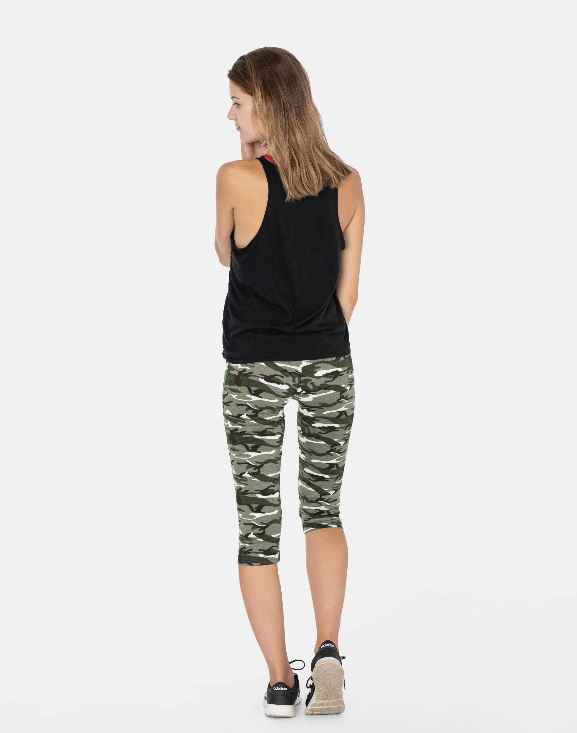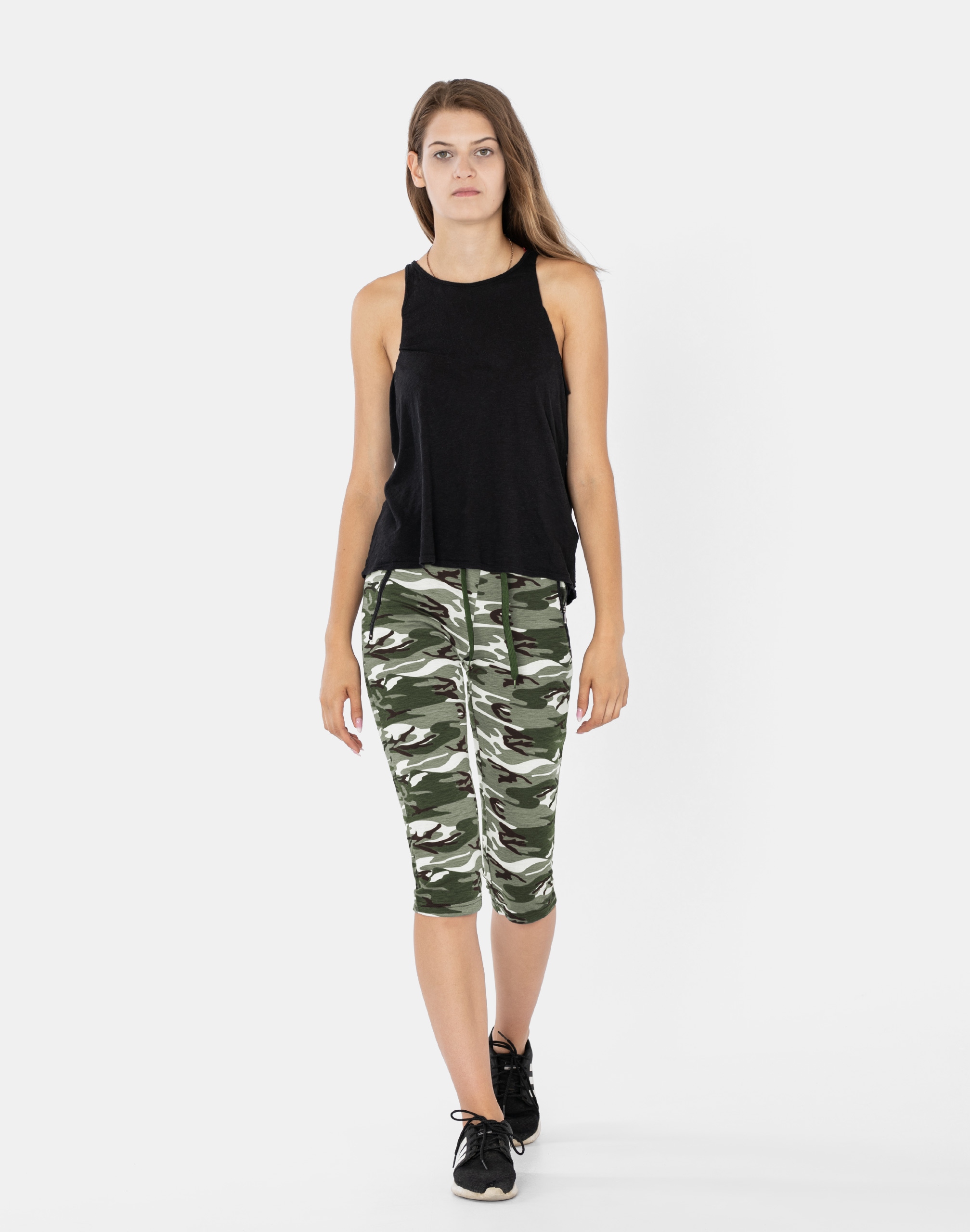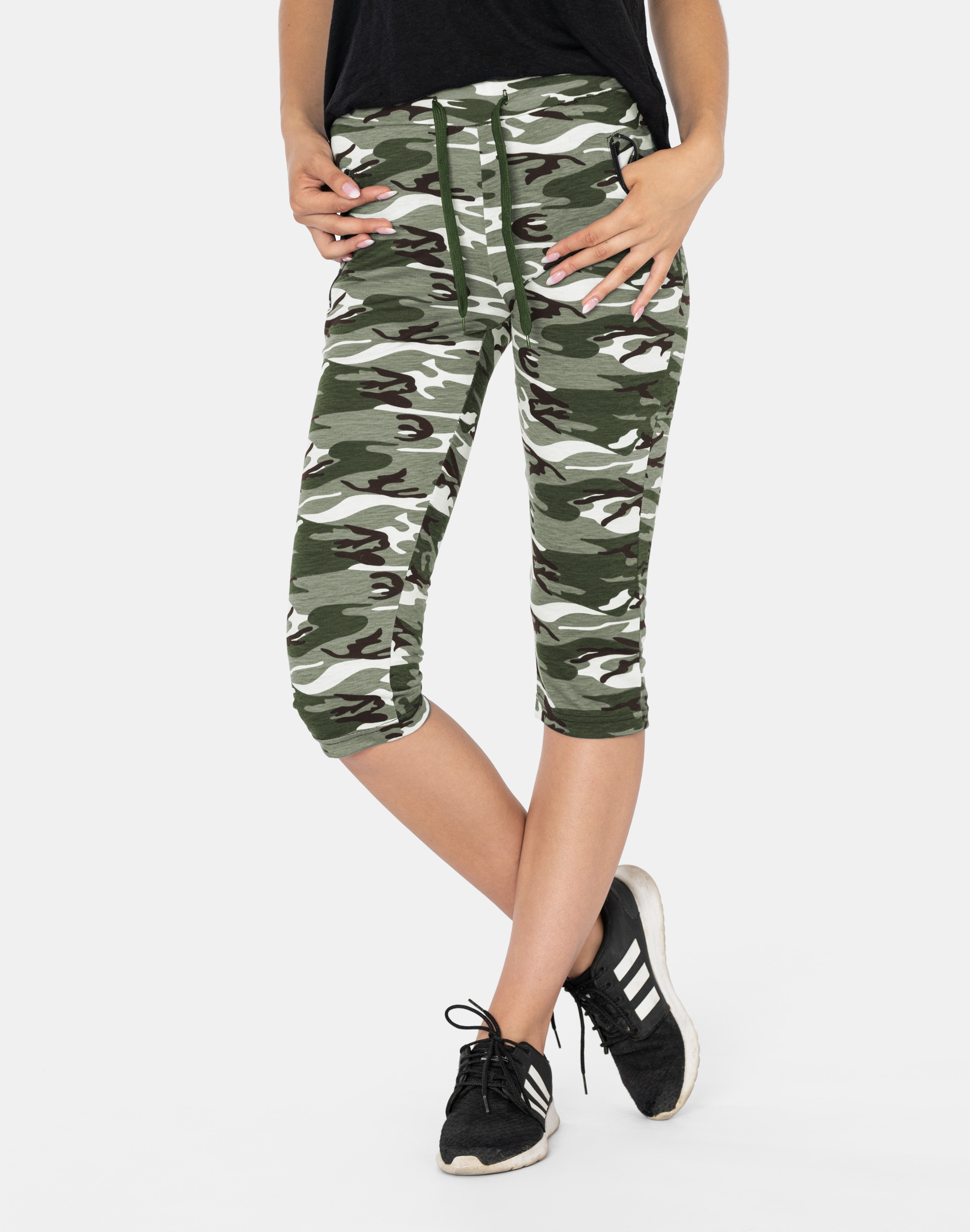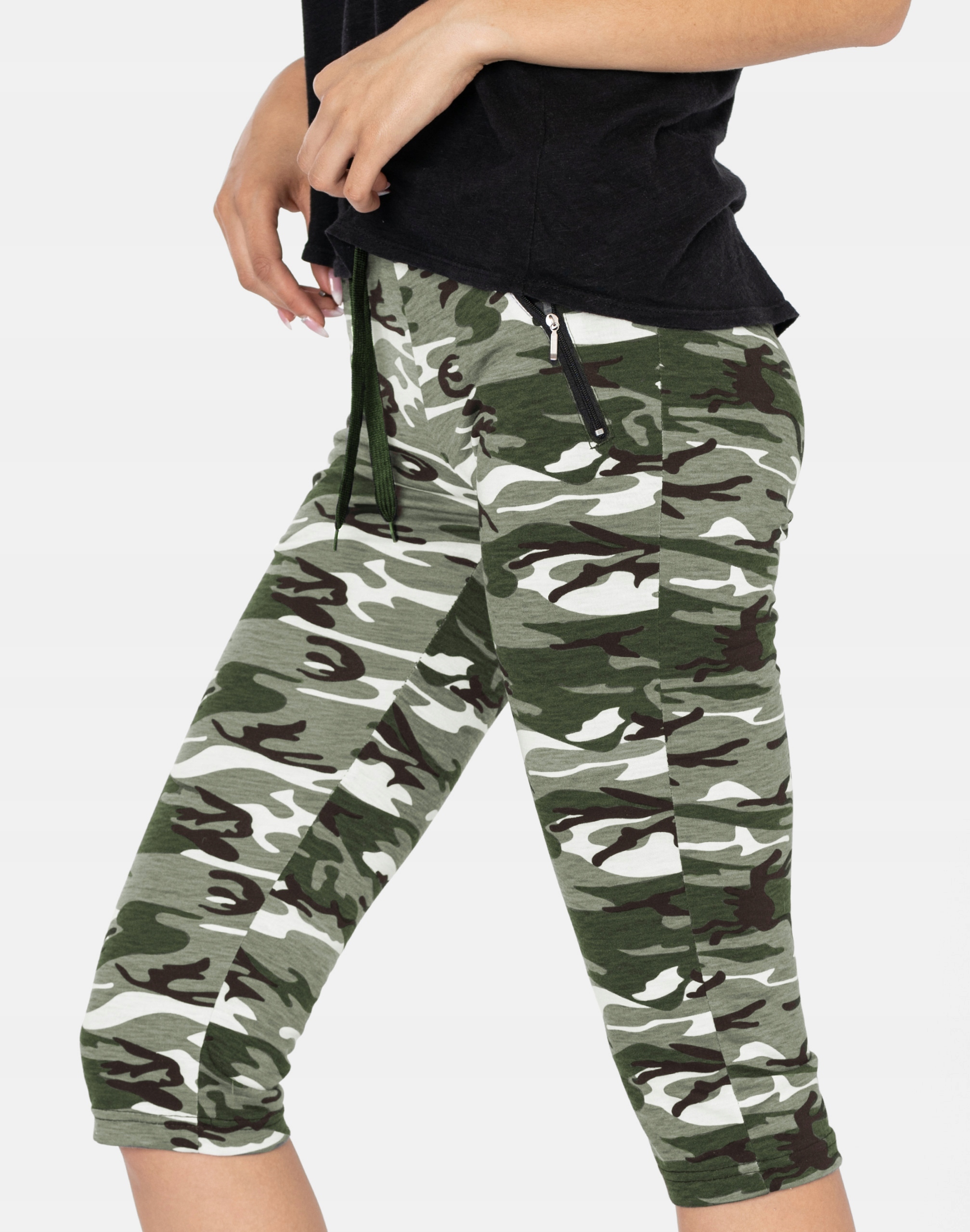 Legginsy sportowe damskie w najmodniejszym w tym sezonie wzorze moro CAMO dla fanek militarnego stylu sport-casual, to komfortowo skrojony model z wysoką elastyczną talią i wąską, dopasowaną nogawką 3/4. Z założenia wyróżniają się dużą wygodą a dopasowanie w pasie zapewnia szeroki, elastyczny pas ściągający oraz dodatkowo wpuszczona w pasek taśma regulacyjna z możliwością jej zawiązywania. Materiał charakteryzuje się dużą elastycznością oraz rozciągliwością, zapewniając doskonałe dopasowanie spodni do sylwetki. Z przodu posiadają dwie wpuszczane kieszenie na dłonie zasuwane na zamki błyskawiczne. Trwałe i elastyczne wykończenie spodni (użycie do produkcji elastycznych nici) gwarantuje komfort i wygodę ich użytkownikowi w każdych warunkach. Możesz w nich chodzić na co dzień, idealnie nadają się również do uprawiania różnych dyscyplin sportu i rekreacji. Doskonale sprawdzą się zarówno na wycieczkach, spacerach, zajęciach w klubach fitness i na siłowni, podczas joggingu w parku, jak i w domowym zaciszu przy telewizorze.