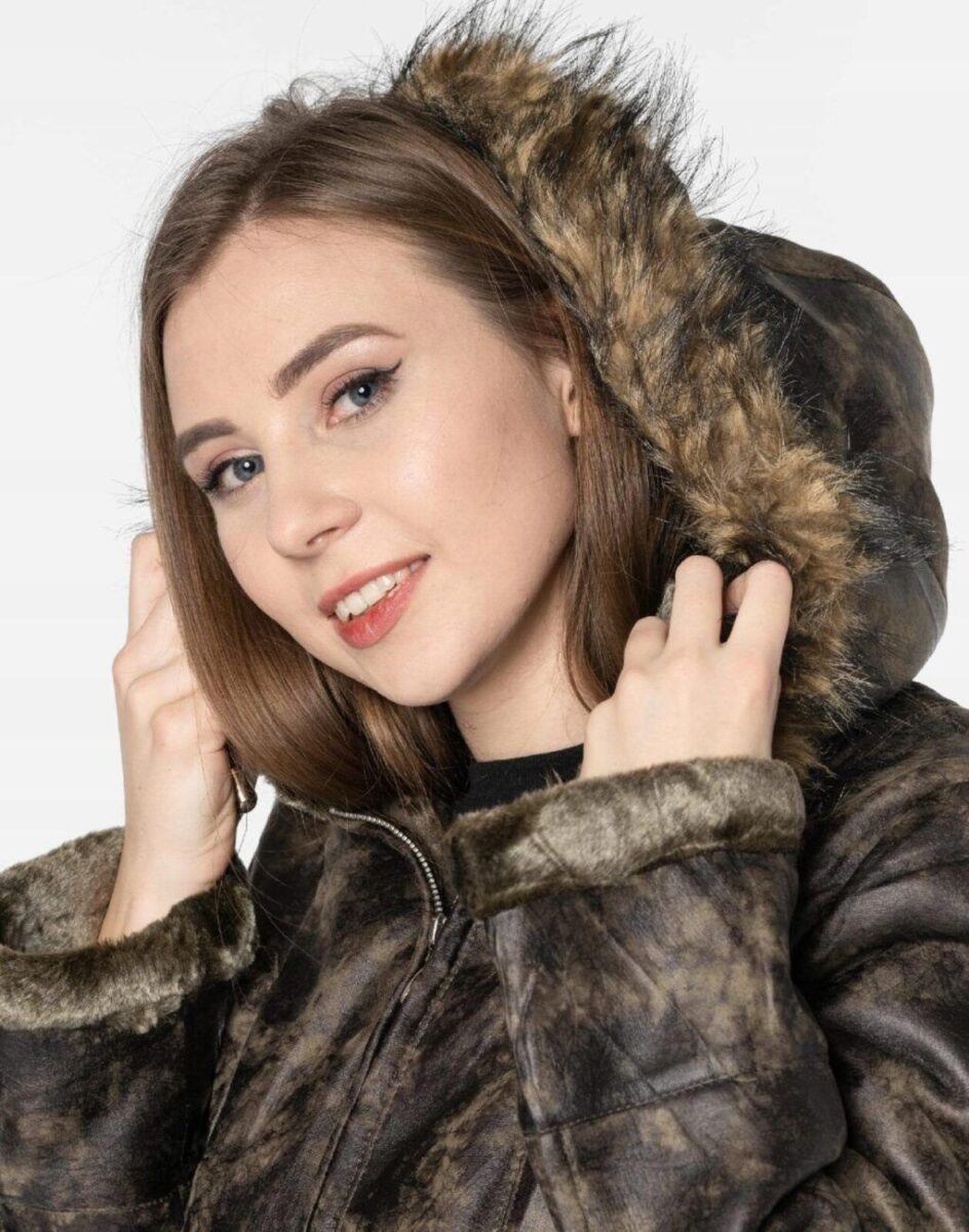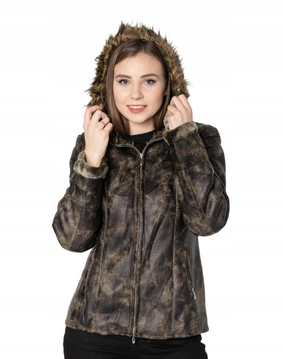 Krótka zimowa kurtka damska z kapturem ocieplona w całości futerkiem