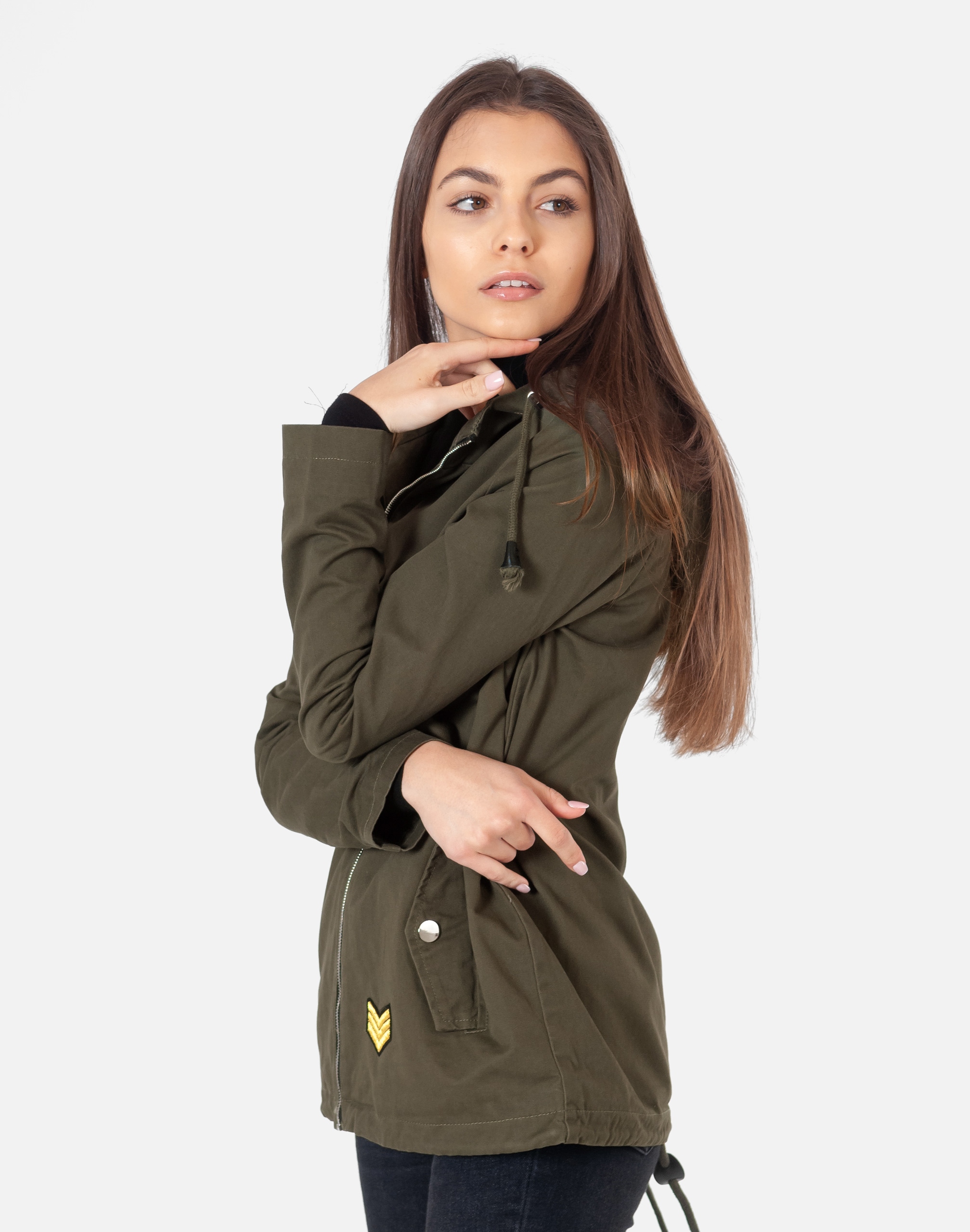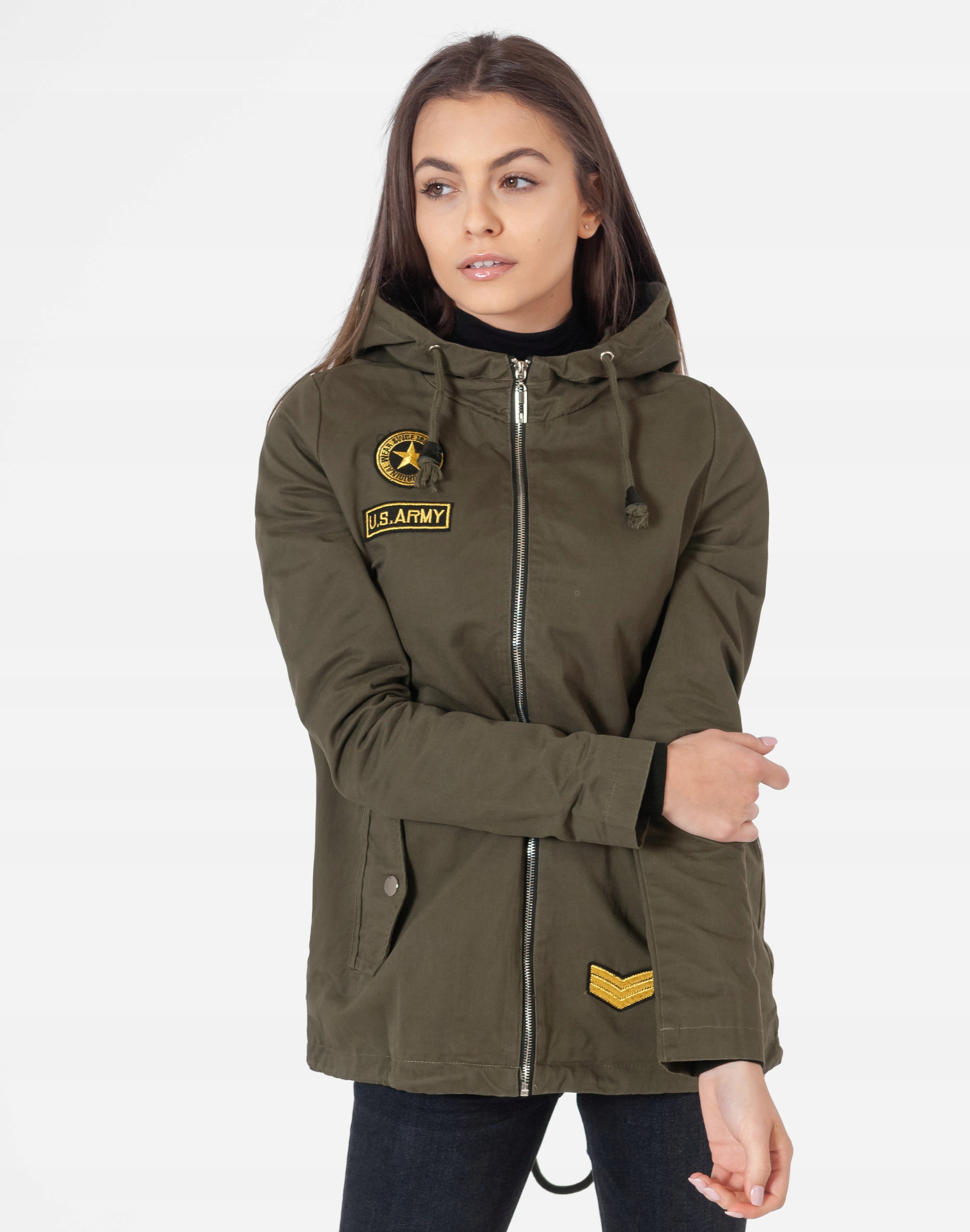 Przejściowa kurtka damska typu parka z kapturem, przekonująca efektownym fasonem i najmodniejszym obecnie militarnym stylem U.S. Army. Kurtka jest zasuwana w całości na zamek błyskawiczny a na bokach ma dwie wpuszczane kieszenie na dłonie kryte patkami zapinanymi na napy. Posiada praktyczny zintegrowany kaptur z możliwością regulacji wielkości i dopasowania za pomocą sznurkowego ściągacza. Wewnętrzna strona kurtki na materiałowej podszewce. Na prawej piersi i na dole kurtki firmowe naszywki w stylu U.S Army. Rękawy proste wykończone lamówką. Dół kurtki posiada możliwość regulacji szerokości i dopasowania za pomocą ściągacza i stoperów, które pozwalają na precyzyjne dopasowanie kurtki do ciała. Długość midi z powodzeniem zakrywa części ciała wrażliwe na chłód jak plecy na wysokości nerek i pośladki.