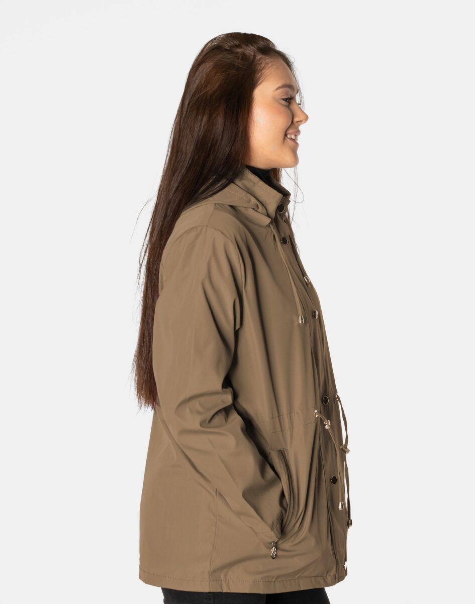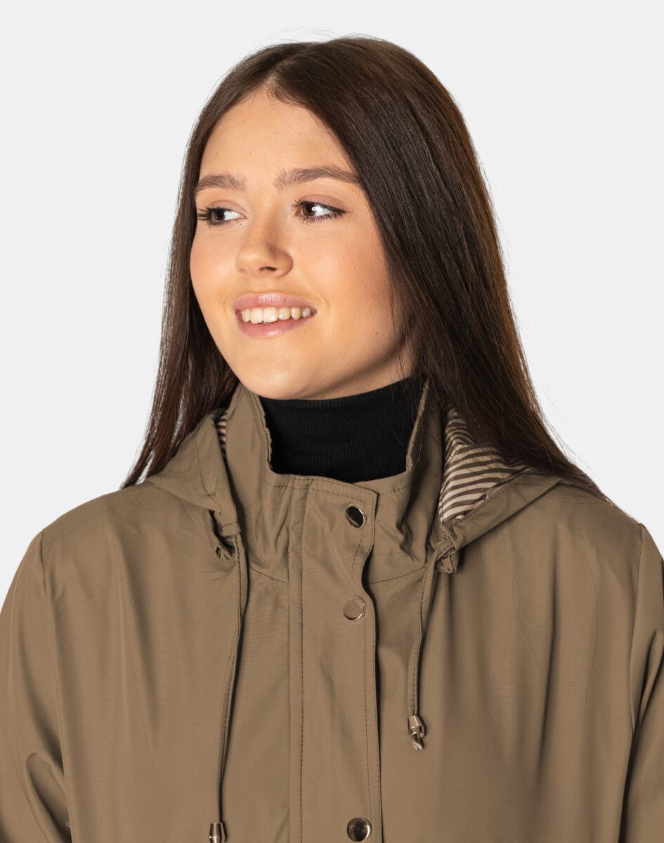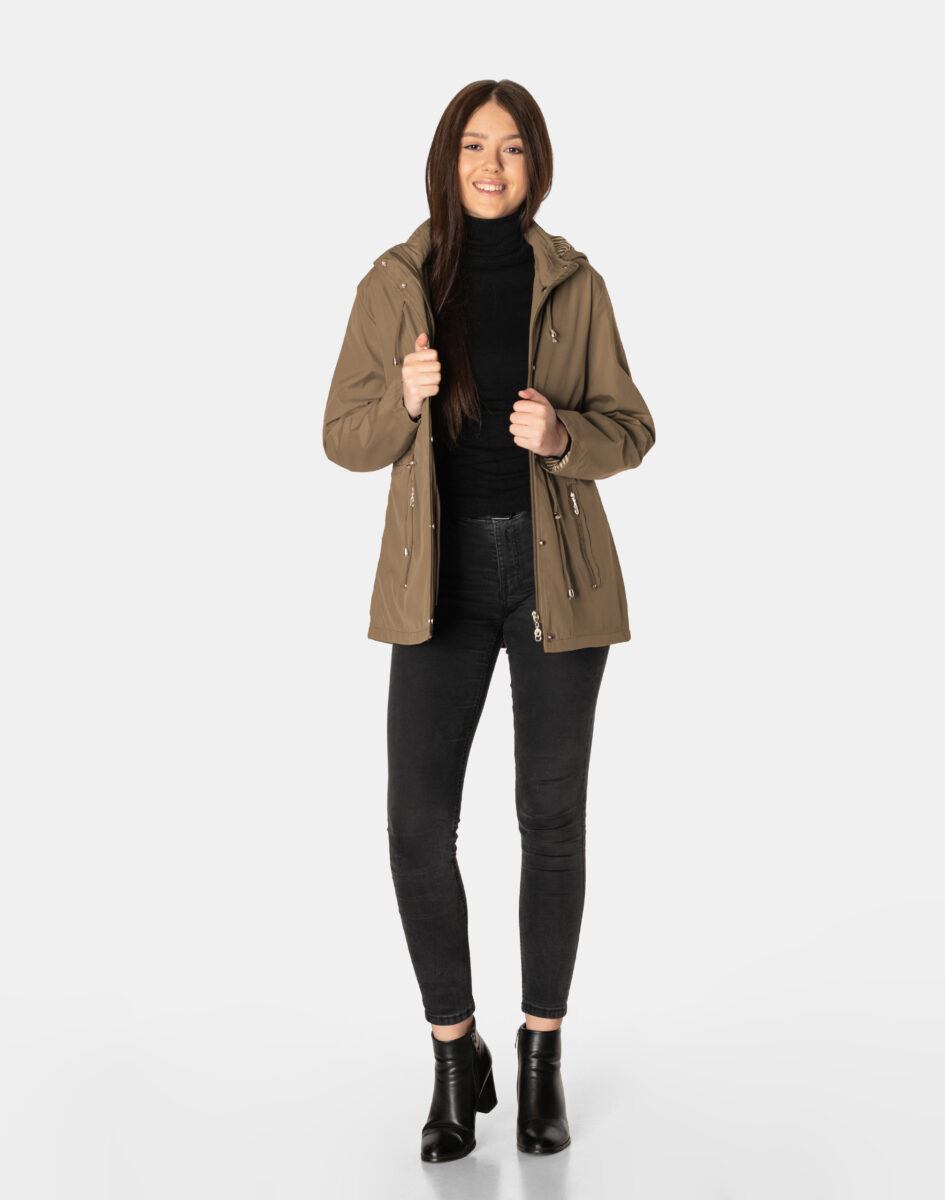 Kurtka jest wiatroszczelna, wodoodporna i zapinana w całości na zamek błyskawiczny kryty plisą zapinaną na napy. Odpinany na zamek i regulowany taśmą ściągającą kaptur osłoni Twoją głowę przed deszczem, chłodem i wiatrem. Wysoki kołnierz typu stójka skutecznie chroni podbródek i szyję a często zastępuje nawet szalik co jest bardzo wygodne. Kurtka posiada dwie wpuszczane kieszenie przednie na dłonie oraz atrapy kieszeni zasuwanych na zamki błyskawiczne oraz wewnętrzną kieszeń na portfel, dokumenty, telefon komórkowy MP3 itp. Ściągacz regulacyjny wszyty w talii pozwala na precyzyjne dopasowanie kurtki do ciała, co znacznie zapobiega utracie ciepła i zgrabnie modeluje sylwetkę w talii nadając jej właściwe proporcje. Materiał zewnętrzny jest wiatroszczelny i wodoodporny zapewniając wygodę oraz komfort termiczny użytkowania nawet w mniej sprzyjających warunkach pogodowych. Wewnętrzna strona kurtki wykończona jest materiałową podszewką. Długość do połowy uda, która świetnie podkreśli elegancję i kobiecość w twoim wyglądzie, jak również trzyma ciepło i przytulność przy zmiennej pogodzie. Nie krępuje ruchów i z powodzeniem zakrywa części ciała wrażliwe na chłód jak plecy na wysokości nerek i pośladki.